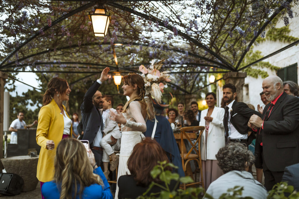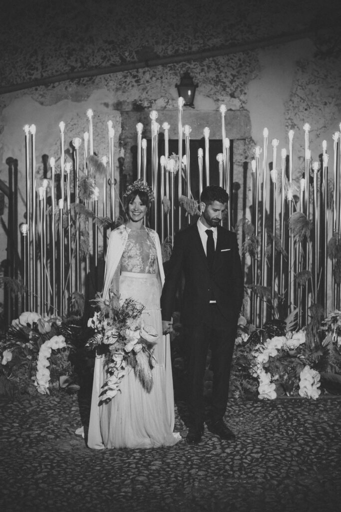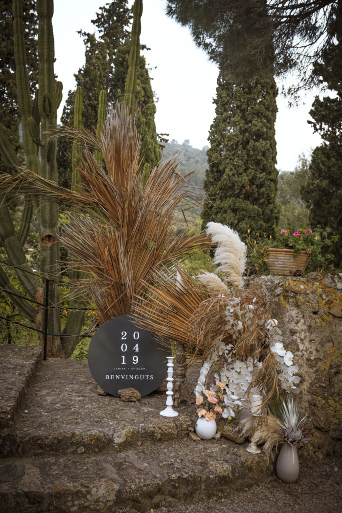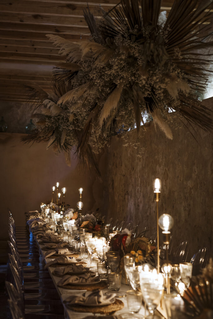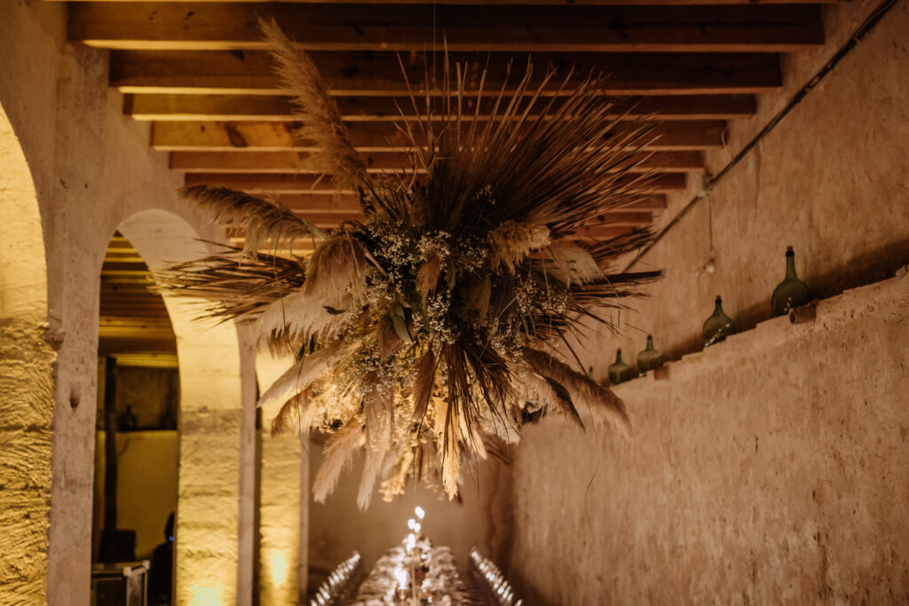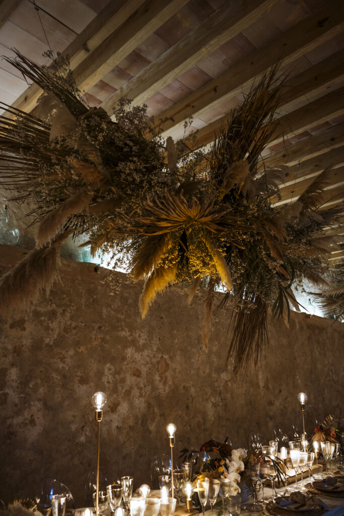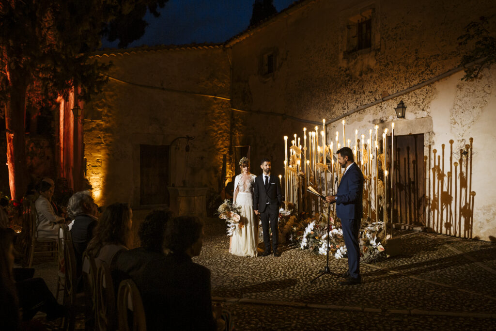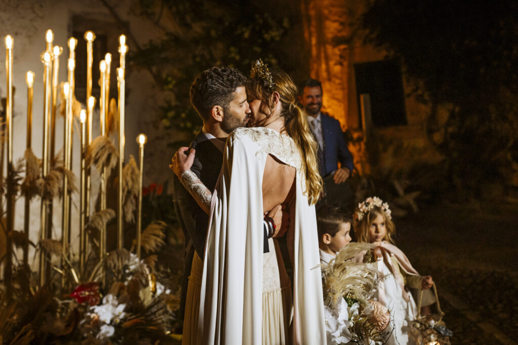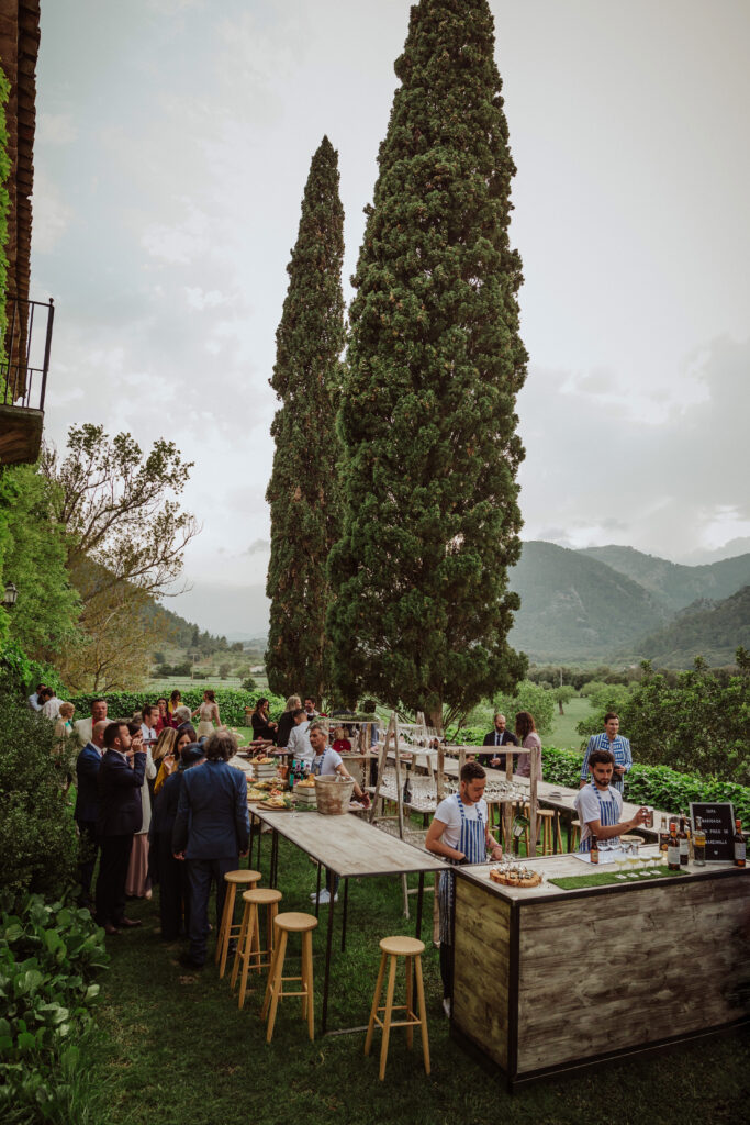 Quizá lo que tuvimos claro des de el primer minuto era el lugar. Estaba claro que elegiríamos Mallorca y dentro de nuestra isla, esta preciosa finca es de los lugares que no nos cansamos de ver. Hemos estado allí ya para decenas de bodas y, día tras día, su luz, su encanto, su carácter y autenticidad nos re-enamora. Y aunque en un principio pensamos en celebrar una boda de día, en seguida entendimos que para conseguir el ambiente que buscábamos debíamos cambiar algunos tiempos. Queríamos una ceremonia con luces, quería una entrada muy íntima donde la atención se centrara solo en lo importante, queríamos empezar la fiesta bebiendo, bailando y con muchas risas. Así que invertimos los horarios para empezar con un estupendo cocktail de bienvenida que Lili y Salva crearon expresamente y sirvieron con maestría. Luego seguimos por dos horas de aperitivo con infinidad de manjares alrededor de grandes barras de bar para finamente darnos el sí quiero después de la puesta de sol.
