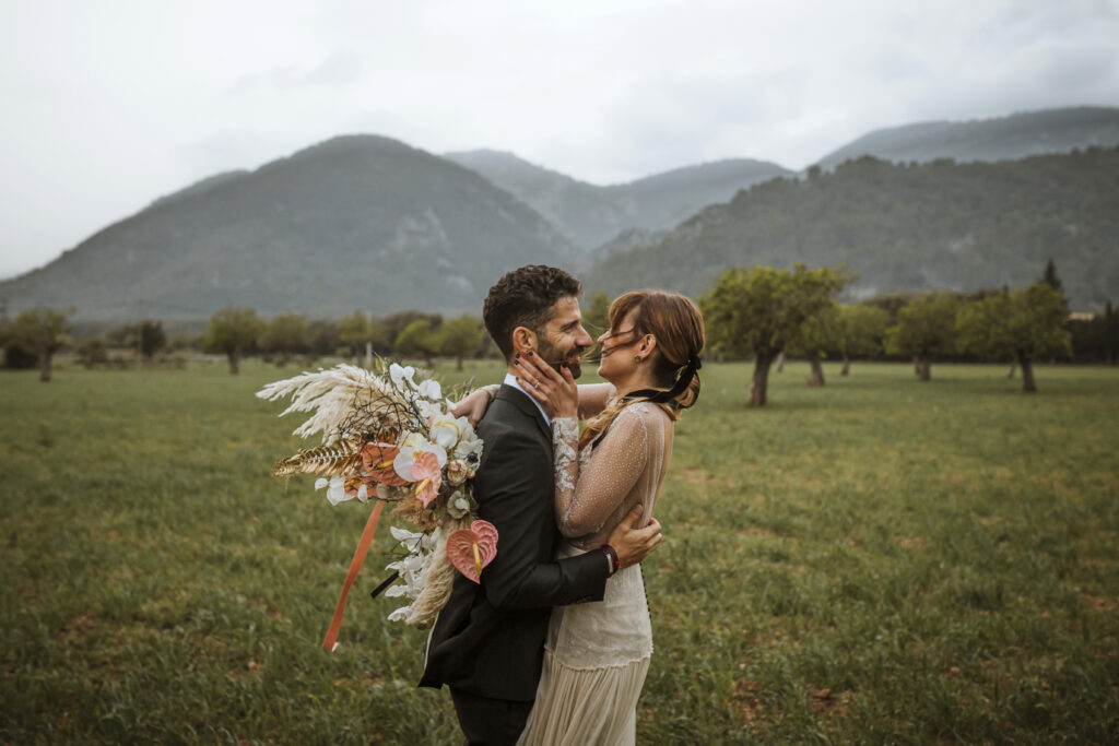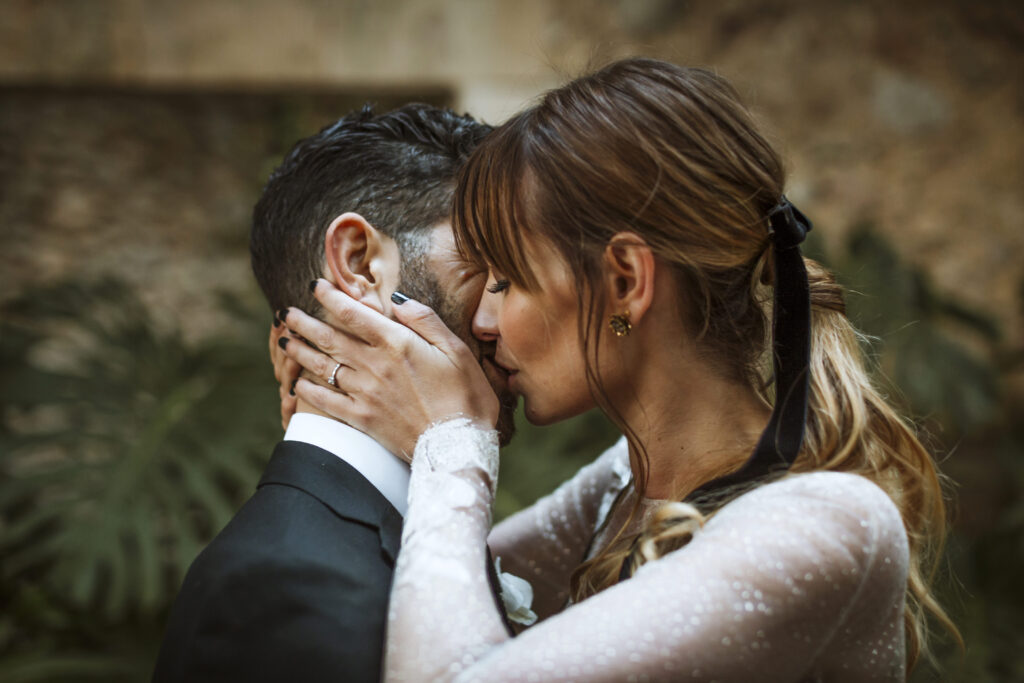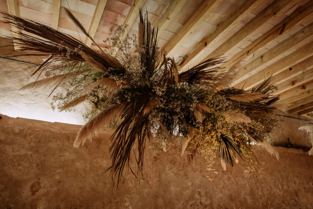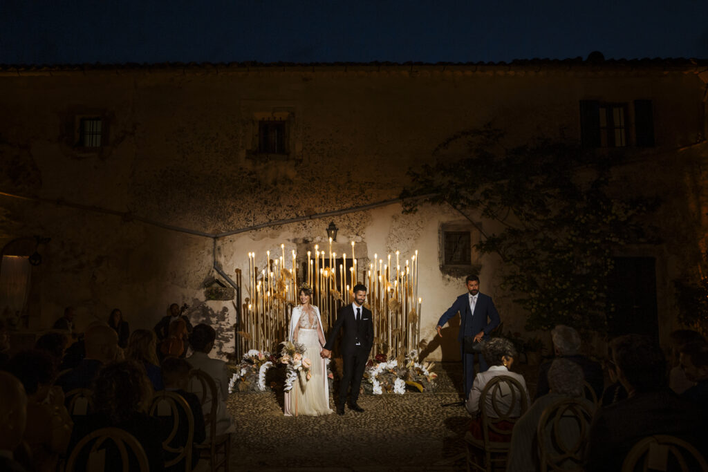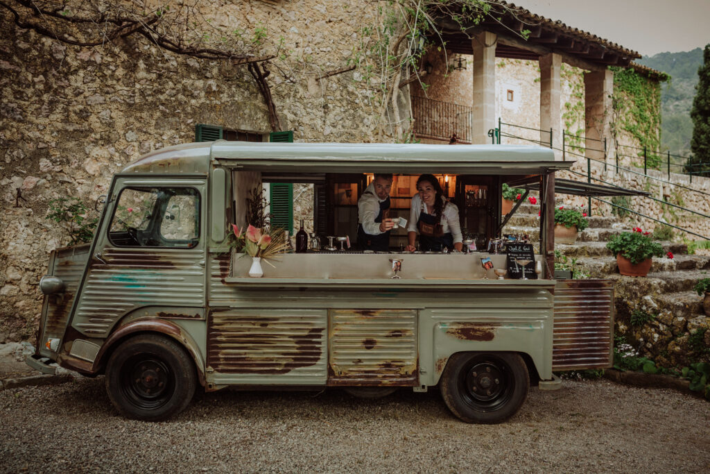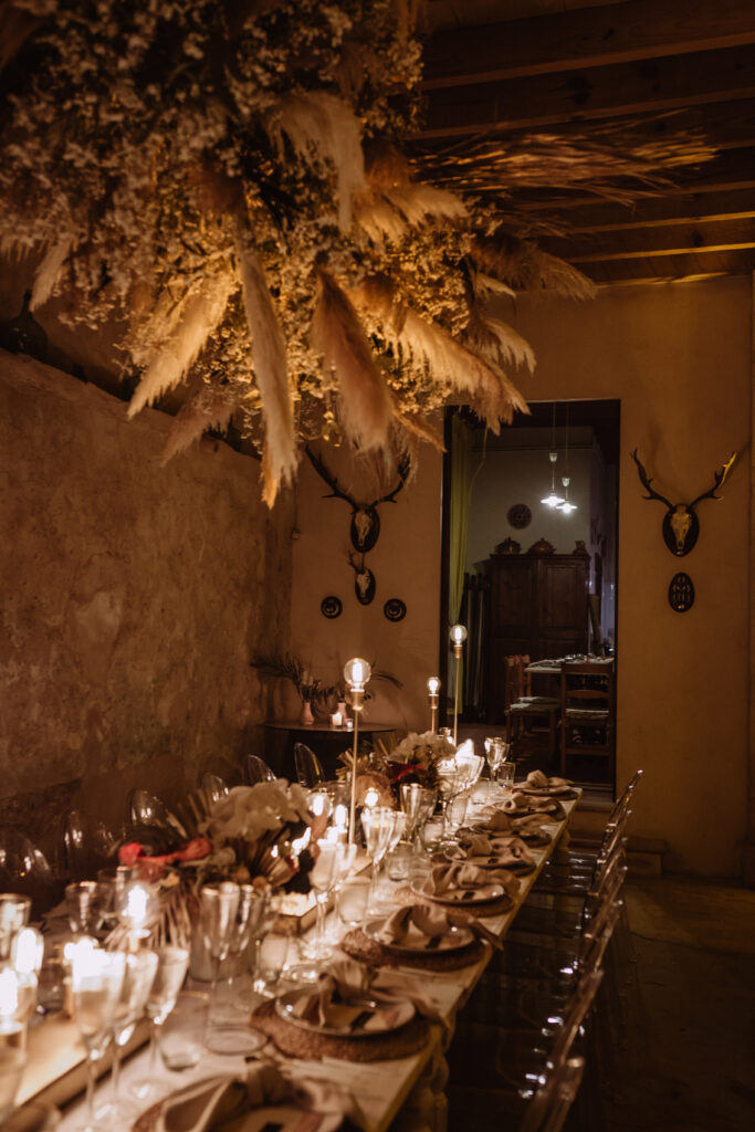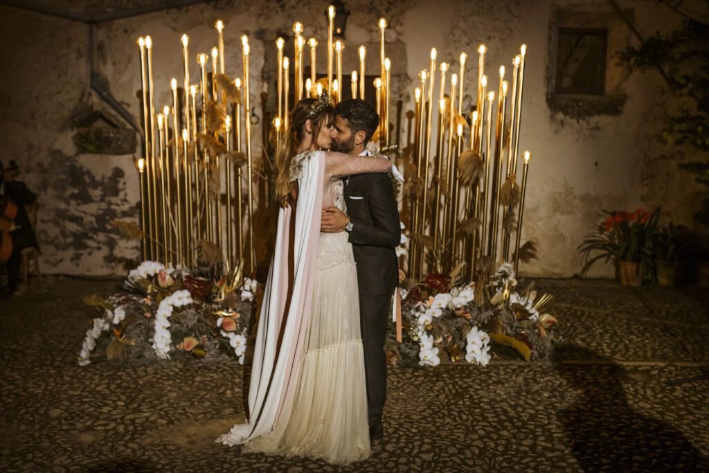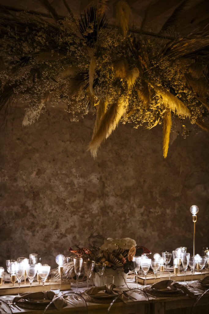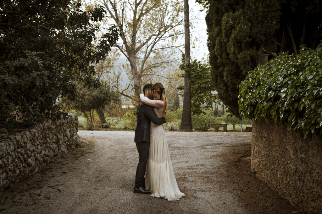 Quizá lo que tuvimos claro des de el primer minuto era el lugar. Estaba claro que elegiríamos Mallorca y dentro de nuestra isla, esta preciosa finca es de los lugares que no nos cansamos de ver. Hemos estado allí ya para decenas de bodas y, día tras día, su luz, su encanto, su carácter y autenticidad nos re-enamora. Y aunque en un principio pensamos en celebrar una boda de día, en seguida entendimos que para conseguir el ambiente que buscábamos debíamos cambiar algunos tiempos. Queríamos una ceremonia con luces, quería una entrada muy íntima donde la atención se centrara solo en lo importante, queríamos empezar la fiesta bebiendo, bailando y con muchas risas. Así que invertimos los horarios para empezar con un estupendo cocktail de bienvenida que Lili y Salva crearon expresamente y sirvieron con maestría. Luego seguimos por dos horas de aperitivo con infinidad de manjares alrededor de grandes barras de bar para finamente darnos el sí quiero después de la puesta de sol.