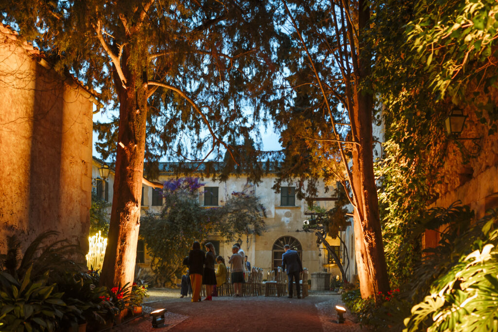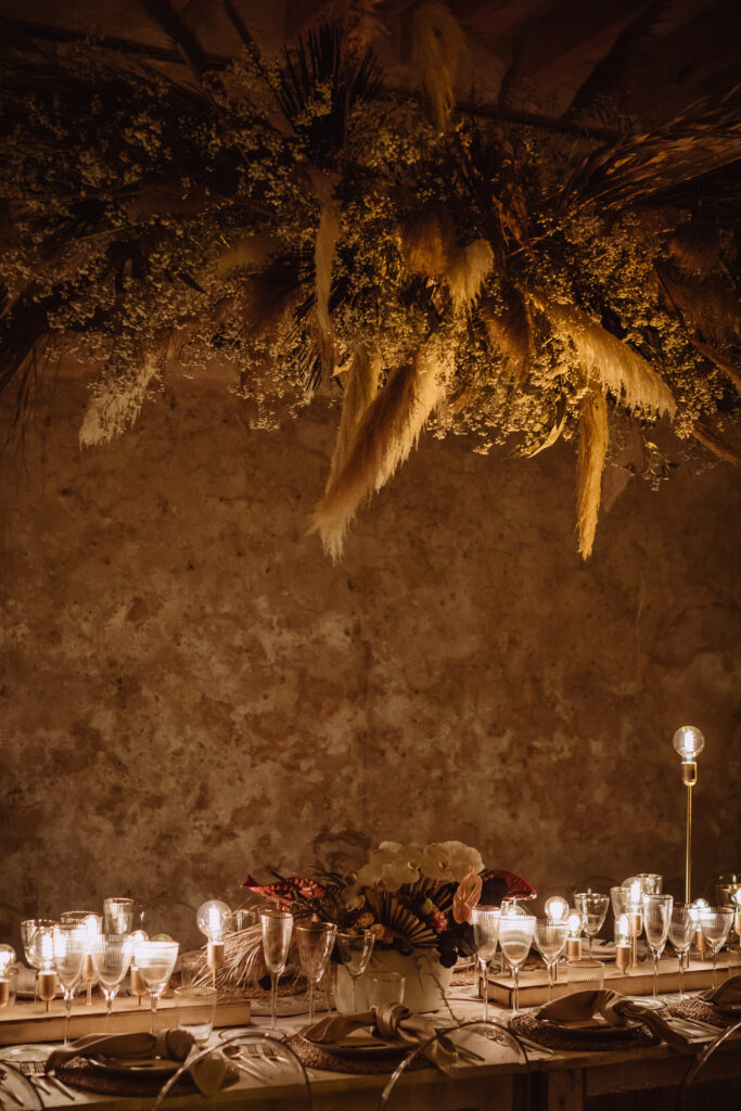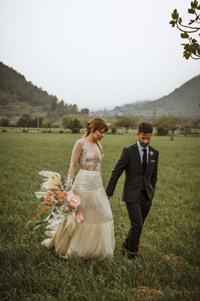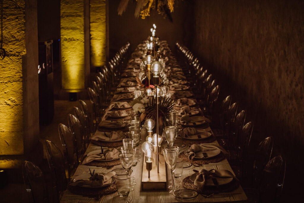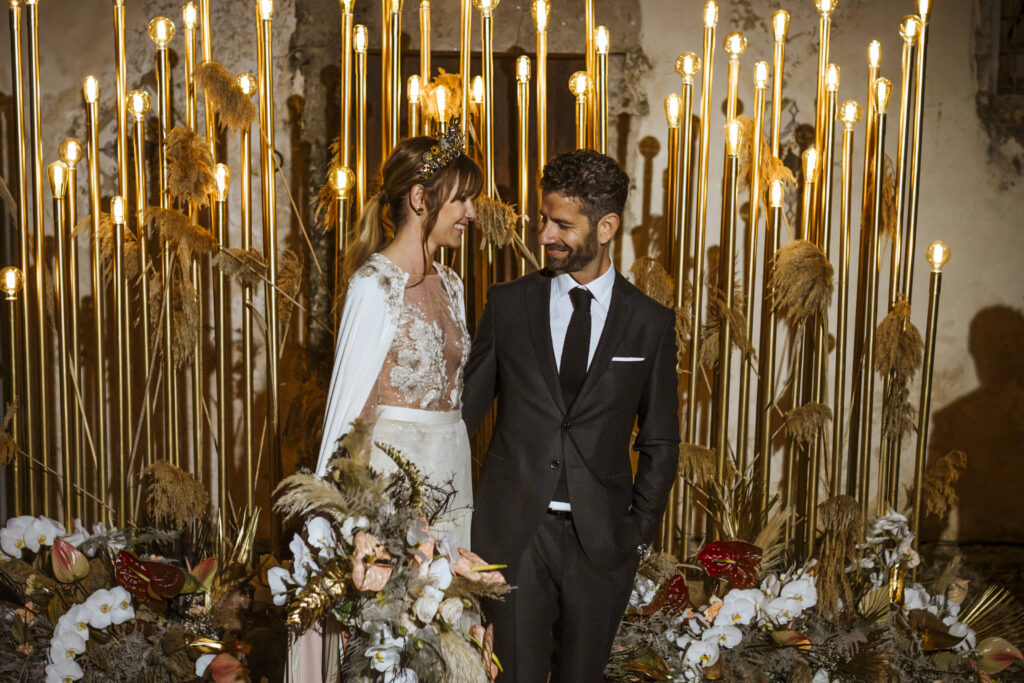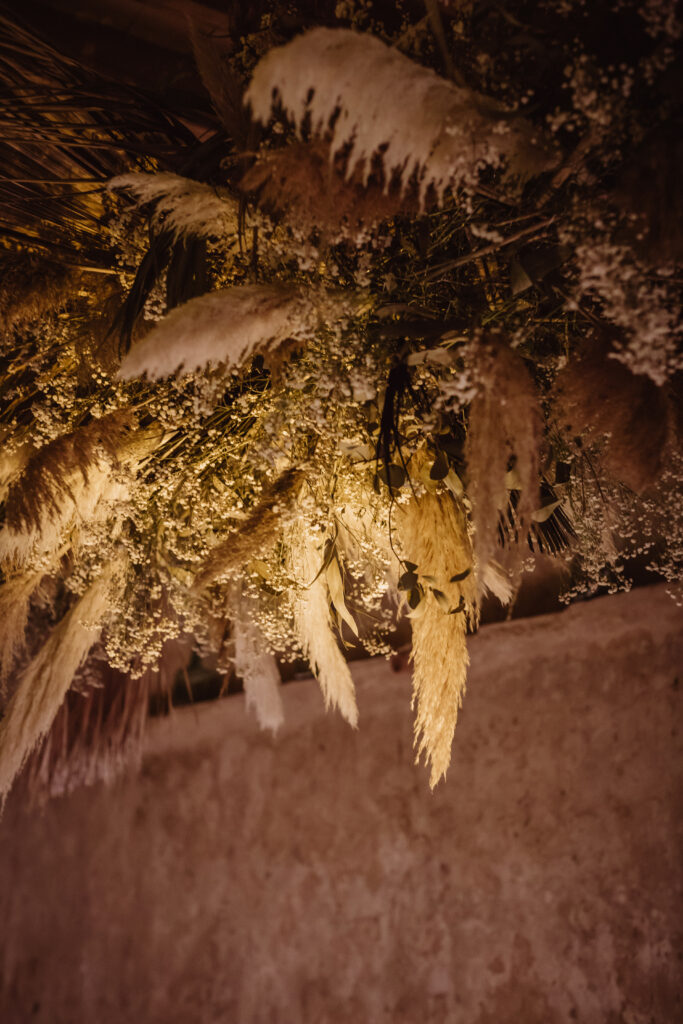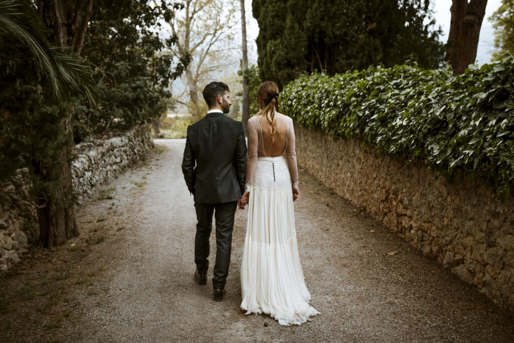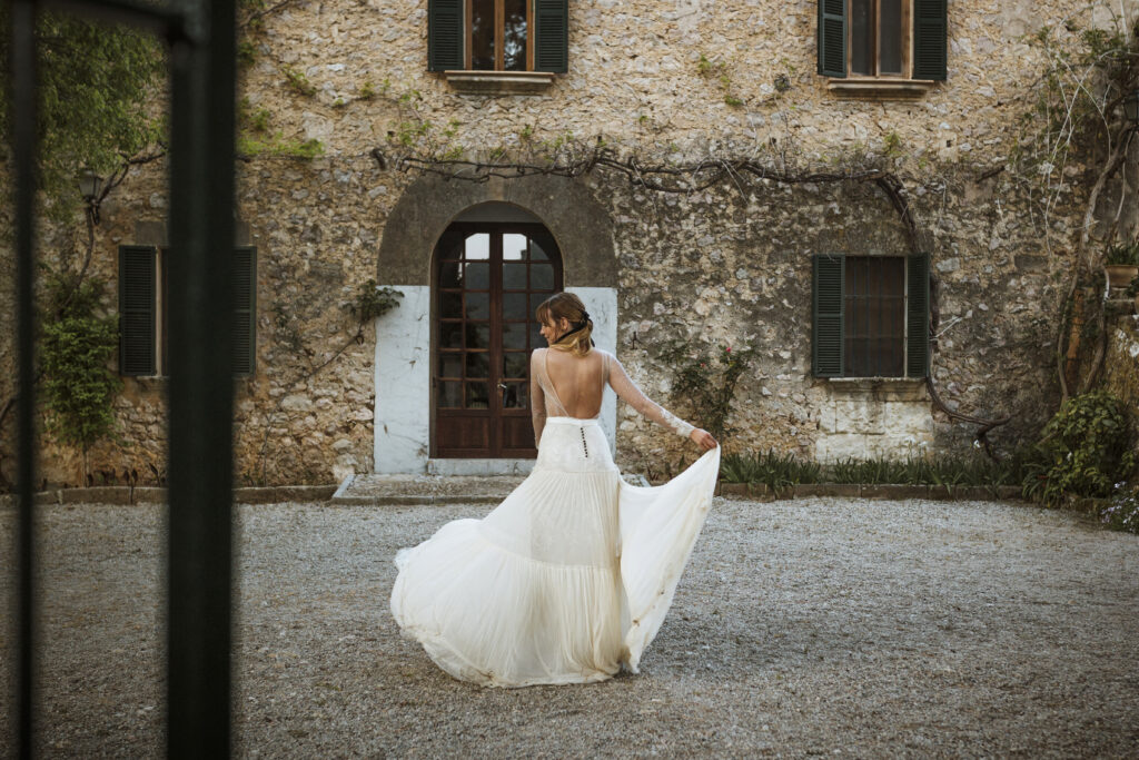 Quizá lo que tuvimos claro des de el primer minuto era el lugar. Estaba claro que elegiríamos Mallorca y dentro de nuestra isla, esta preciosa finca es de los lugares que no nos cansamos de ver. Hemos estado allí ya para decenas de bodas y, día tras día, su luz, su encanto, su carácter y autenticidad nos re-enamora. Y aunque en un principio pensamos en celebrar una boda de día, en seguida entendimos que para conseguir el ambiente que buscábamos debíamos cambiar algunos tiempos. Queríamos una ceremonia con luces, quería una entrada muy íntima donde la atención se centrara solo en lo importante, queríamos empezar la fiesta bebiendo, bailando y con muchas risas. Así que invertimos los horarios para empezar con un estupendo cocktail de bienvenida que Lili y Salva crearon expresamente y sirvieron con maestría. Luego seguimos por dos horas de aperitivo con infinidad de manjares alrededor de grandes barras de bar para finamente darnos el sí quiero después de la puesta de sol.