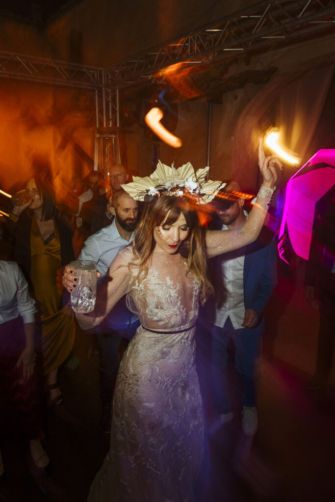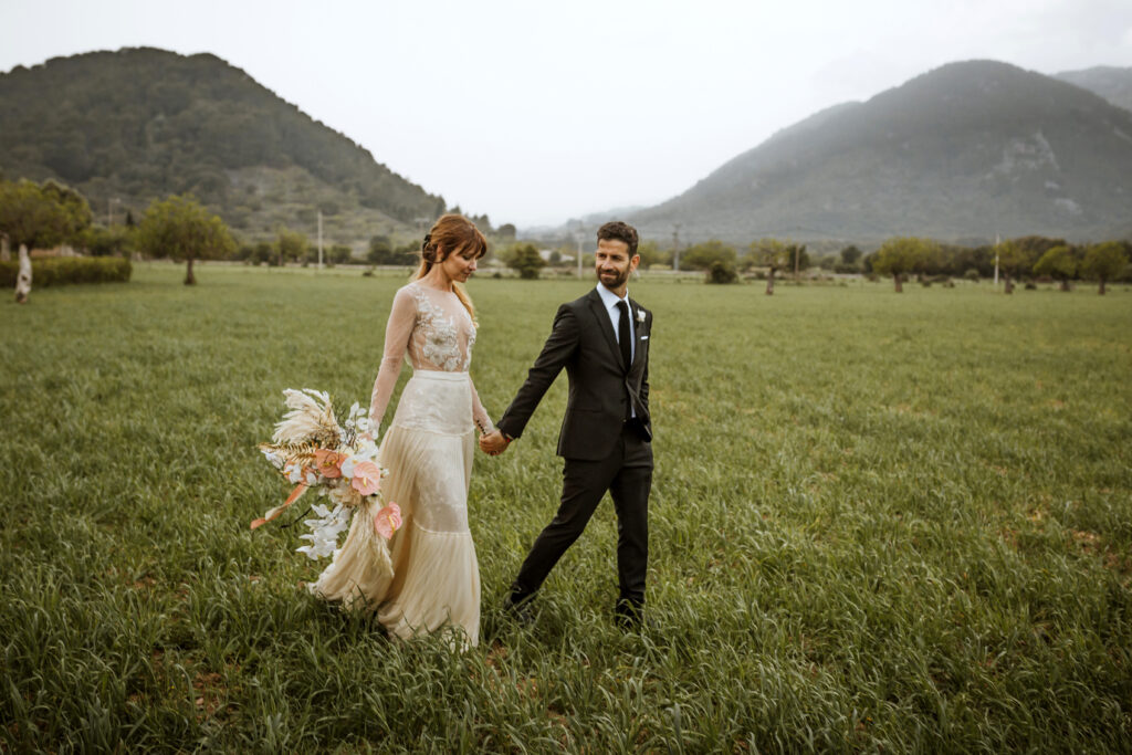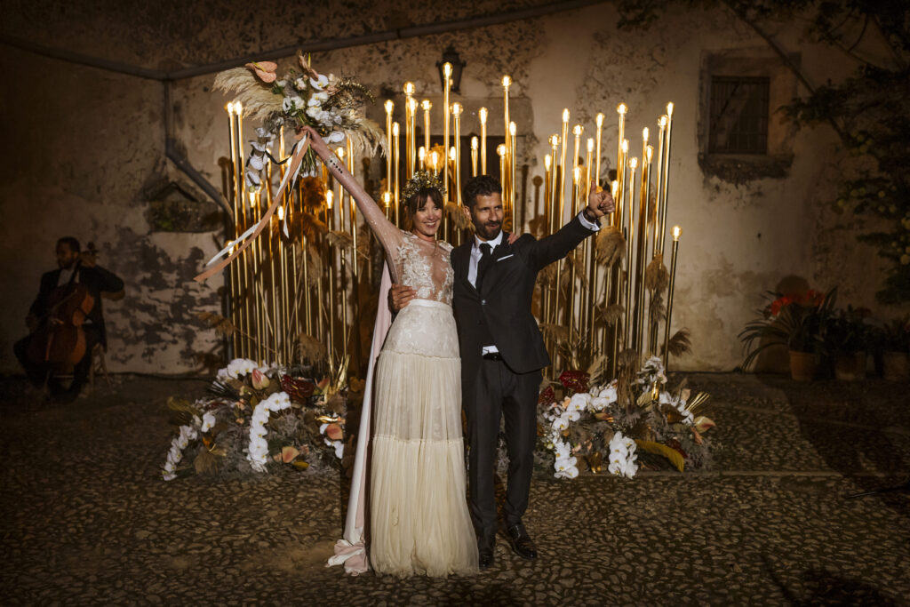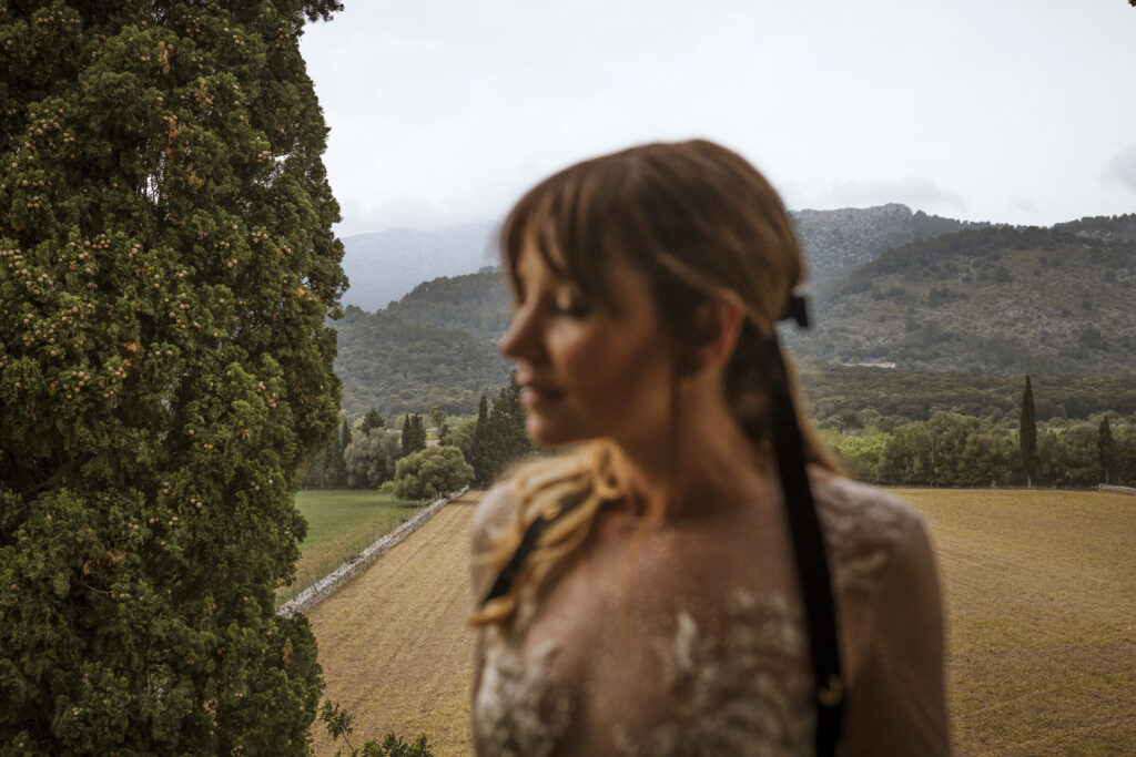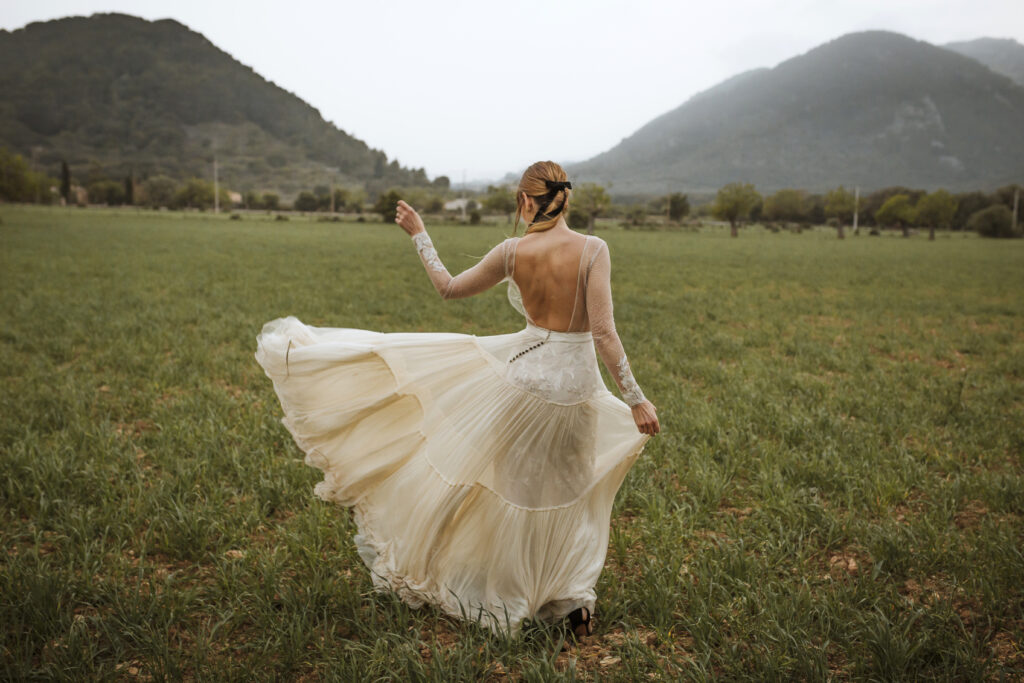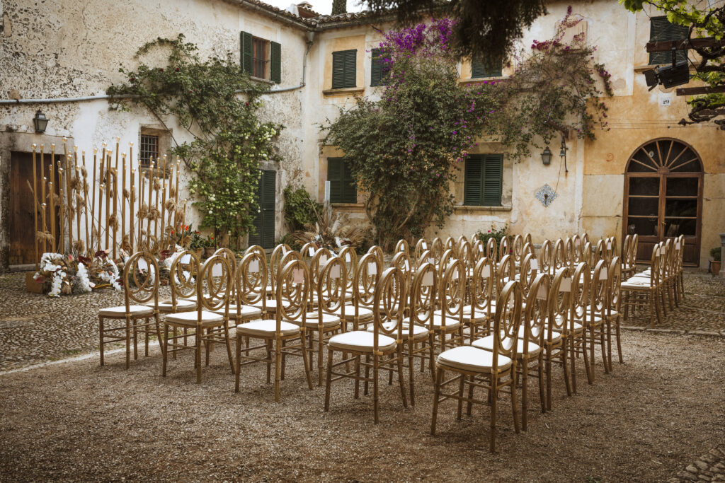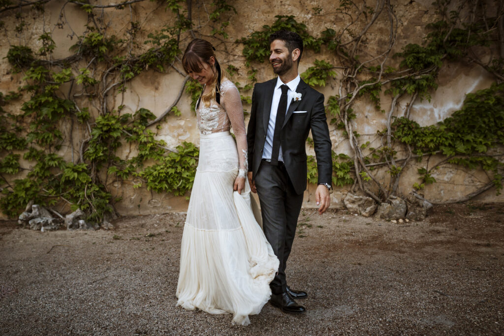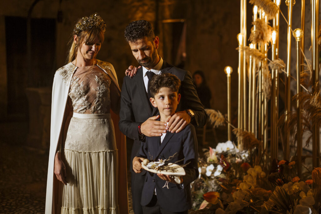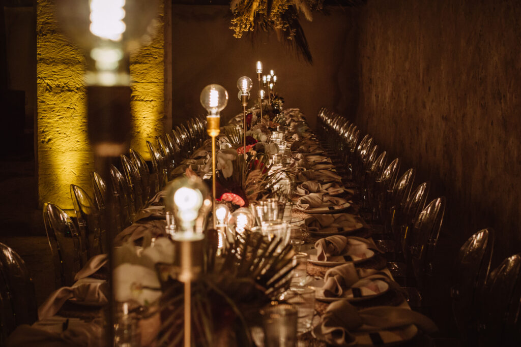 Quizá lo que tuvimos claro des de el primer minuto era el lugar. Estaba claro que elegiríamos Mallorca y dentro de nuestra isla, esta preciosa finca es de los lugares que no nos cansamos de ver. Hemos estado allí ya para decenas de bodas y, día tras día, su luz, su encanto, su carácter y autenticidad nos re-enamora. Y aunque en un principio pensamos en celebrar una boda de día, en seguida entendimos que para conseguir el ambiente que buscábamos debíamos cambiar algunos tiempos. Queríamos una ceremonia con luces, quería una entrada muy íntima donde la atención se centrara solo en lo importante, queríamos empezar la fiesta bebiendo, bailando y con muchas risas. Así que invertimos los horarios para empezar con un estupendo cocktail de bienvenida que Lili y Salva crearon expresamente y sirvieron con maestría. Luego seguimos por dos horas de aperitivo con infinidad de manjares alrededor de grandes barras de bar para finamente darnos el sí quiero después de la puesta de sol.