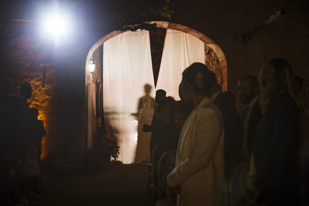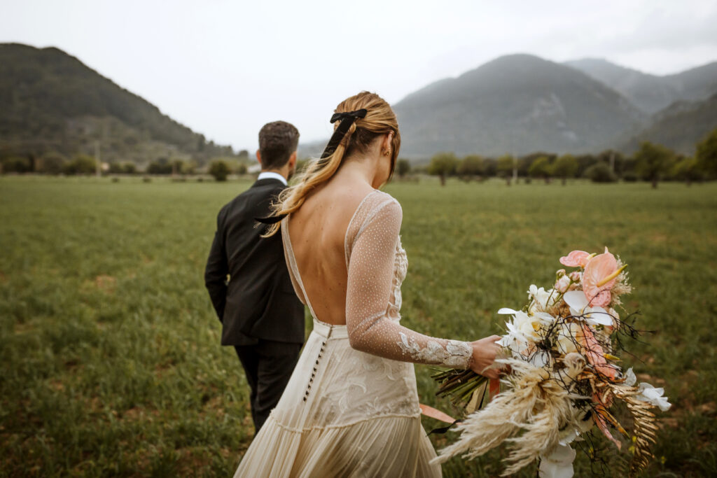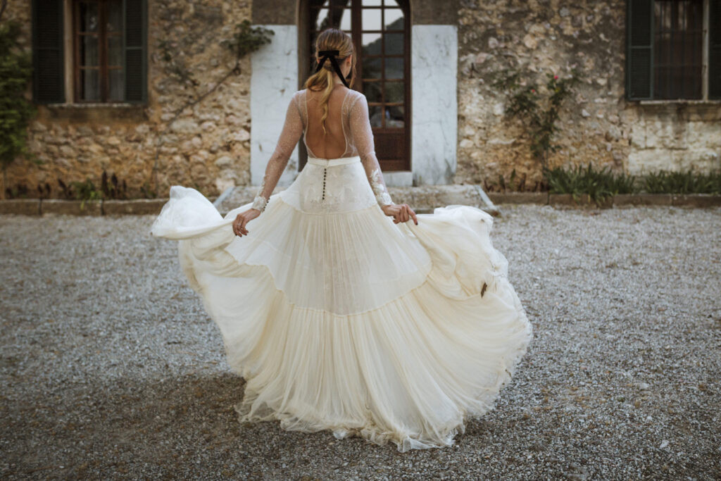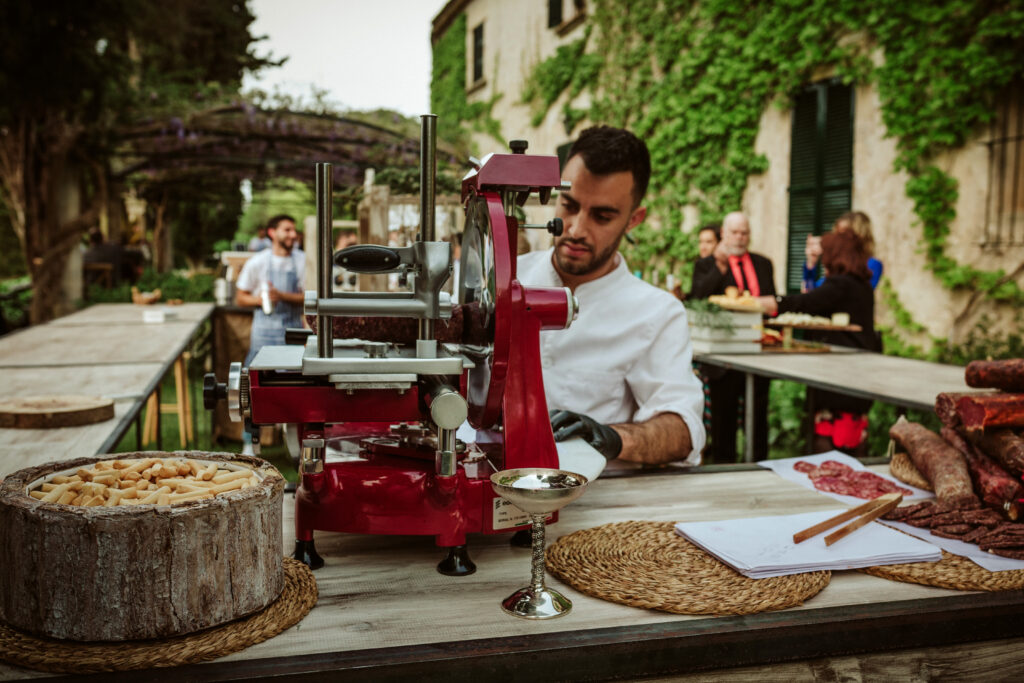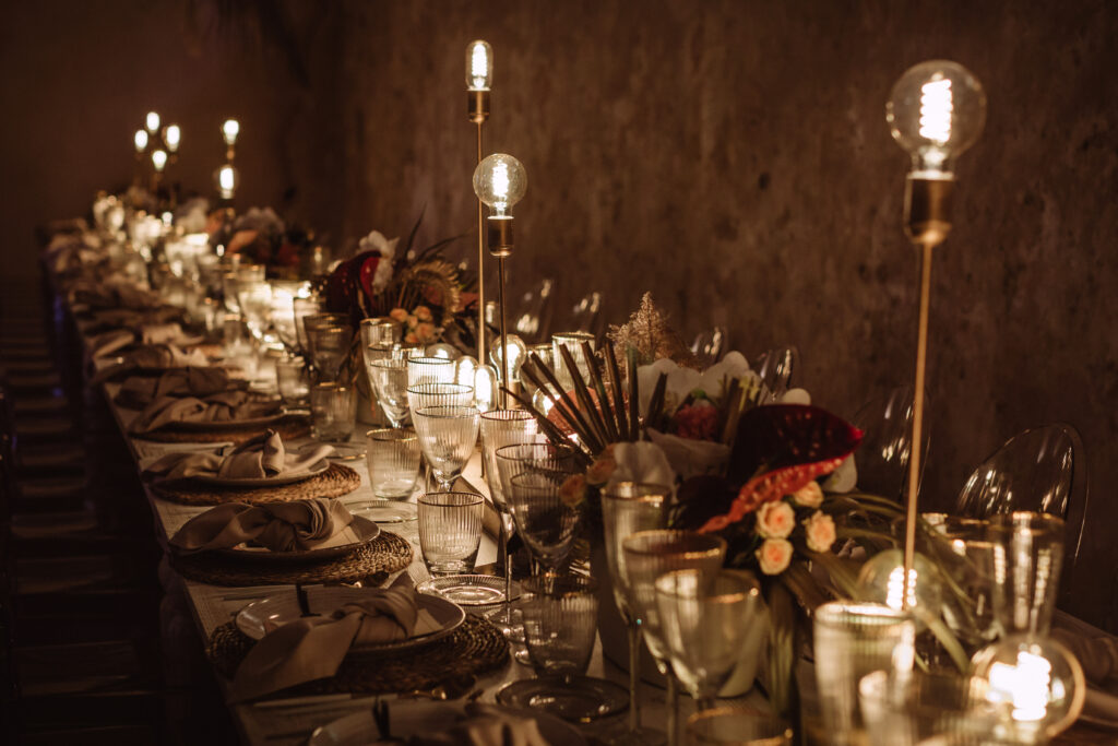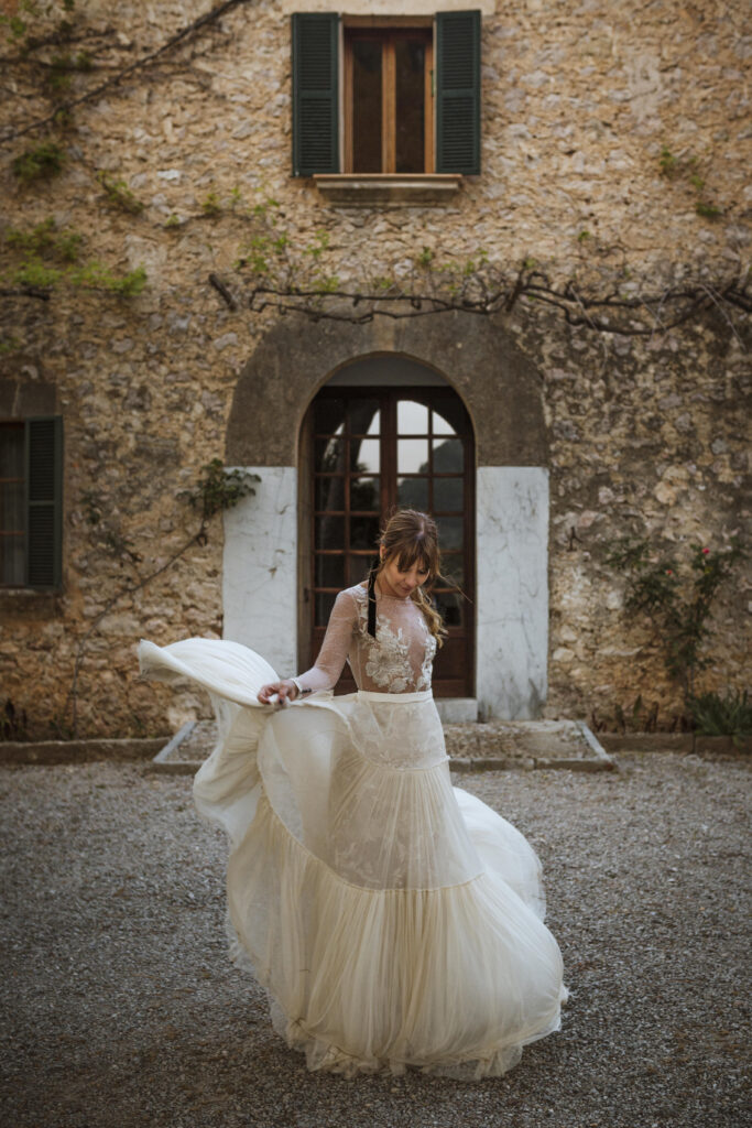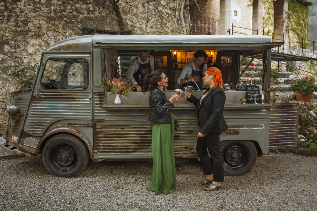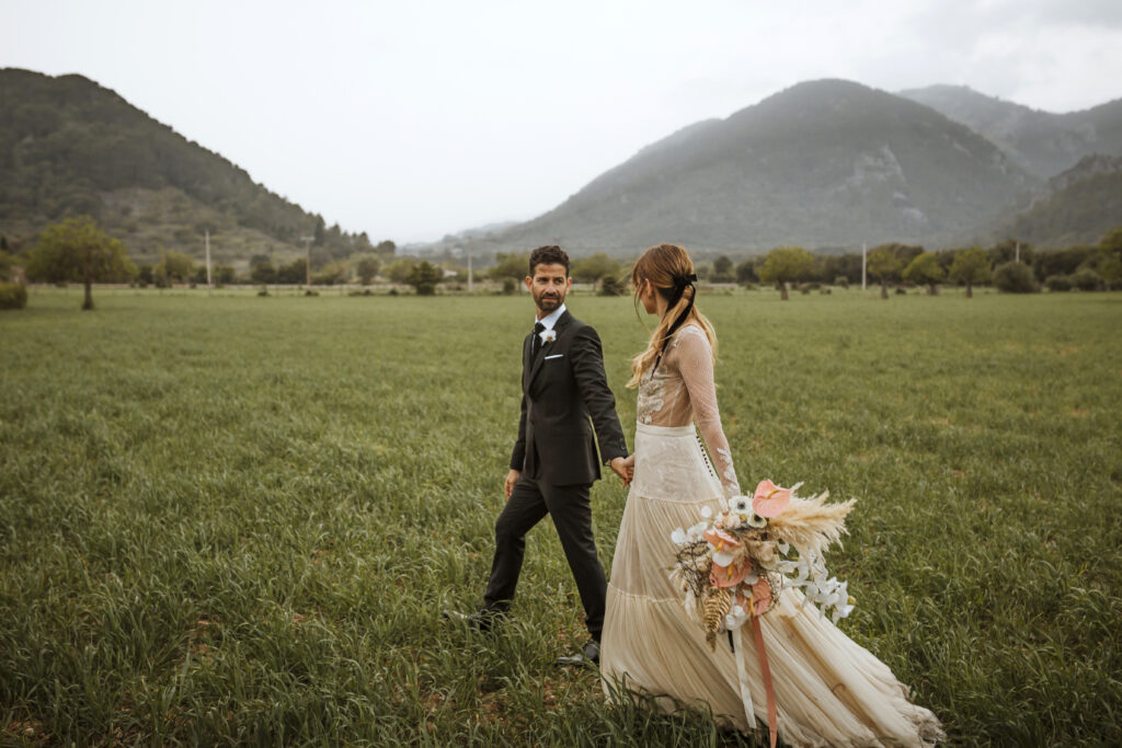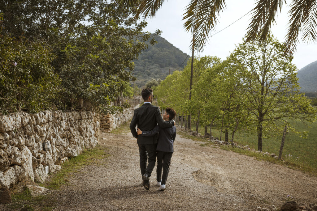 Quizá lo que tuvimos claro des de el primer minuto era el lugar. Estaba claro que elegiríamos Mallorca y dentro de nuestra isla, esta preciosa finca es de los lugares que no nos cansamos de ver. Hemos estado allí ya para decenas de bodas y, día tras día, su luz, su encanto, su carácter y autenticidad nos re-enamora. Y aunque en un principio pensamos en celebrar una boda de día, en seguida entendimos que para conseguir el ambiente que buscábamos debíamos cambiar algunos tiempos. Queríamos una ceremonia con luces, quería una entrada muy íntima donde la atención se centrara solo en lo importante, queríamos empezar la fiesta bebiendo, bailando y con muchas risas. Así que invertimos los horarios para empezar con un estupendo cocktail de bienvenida que Lili y Salva crearon expresamente y sirvieron con maestría. Luego seguimos por dos horas de aperitivo con infinidad de manjares alrededor de grandes barras de bar para finamente darnos el sí quiero después de la puesta de sol.