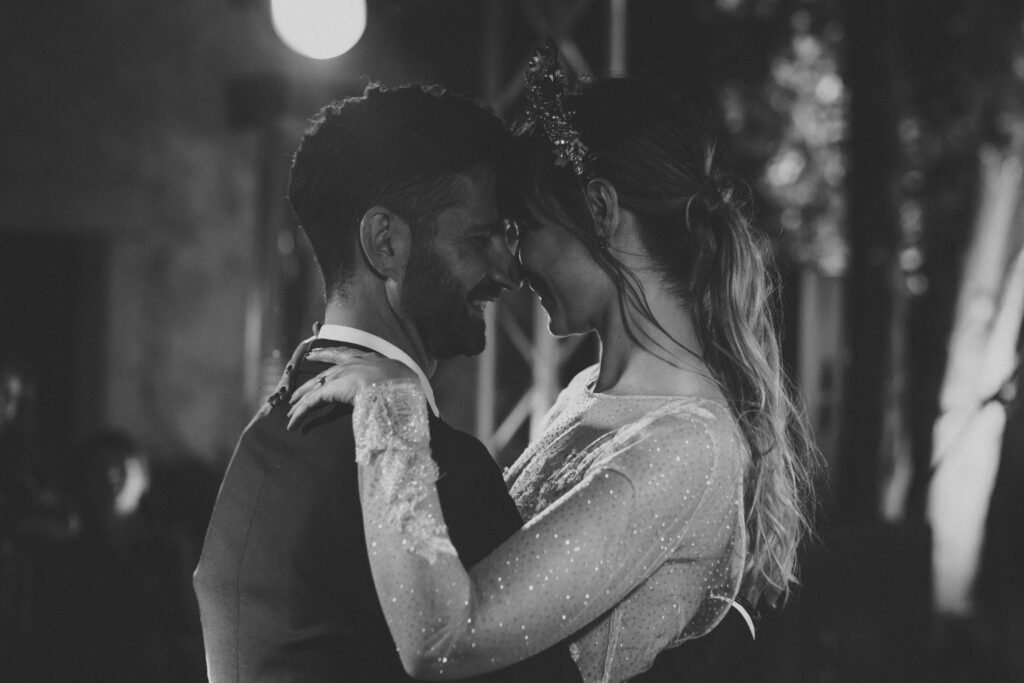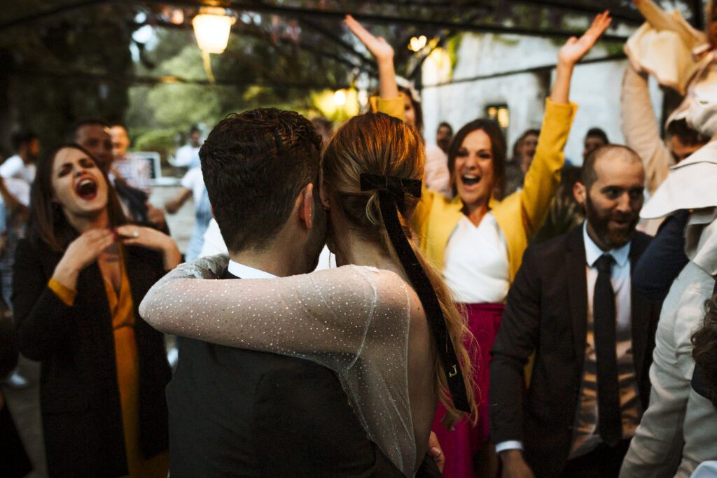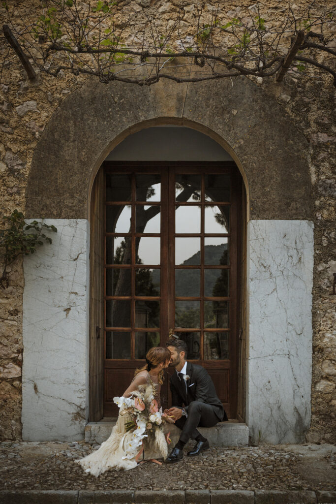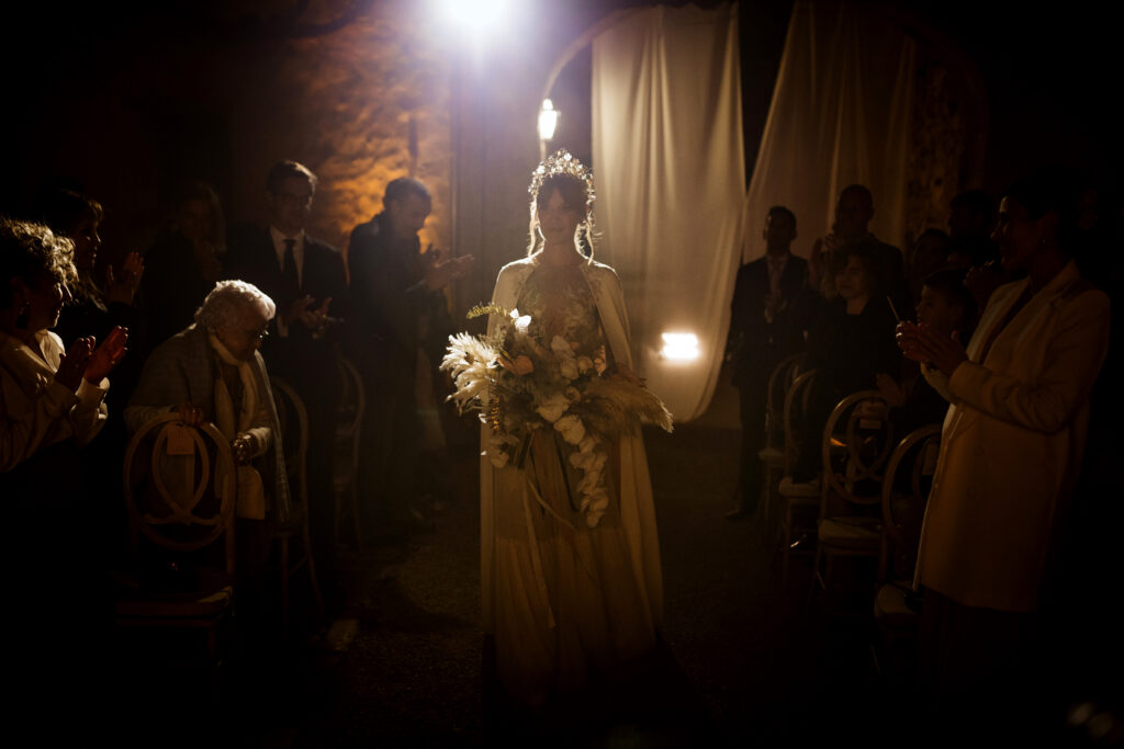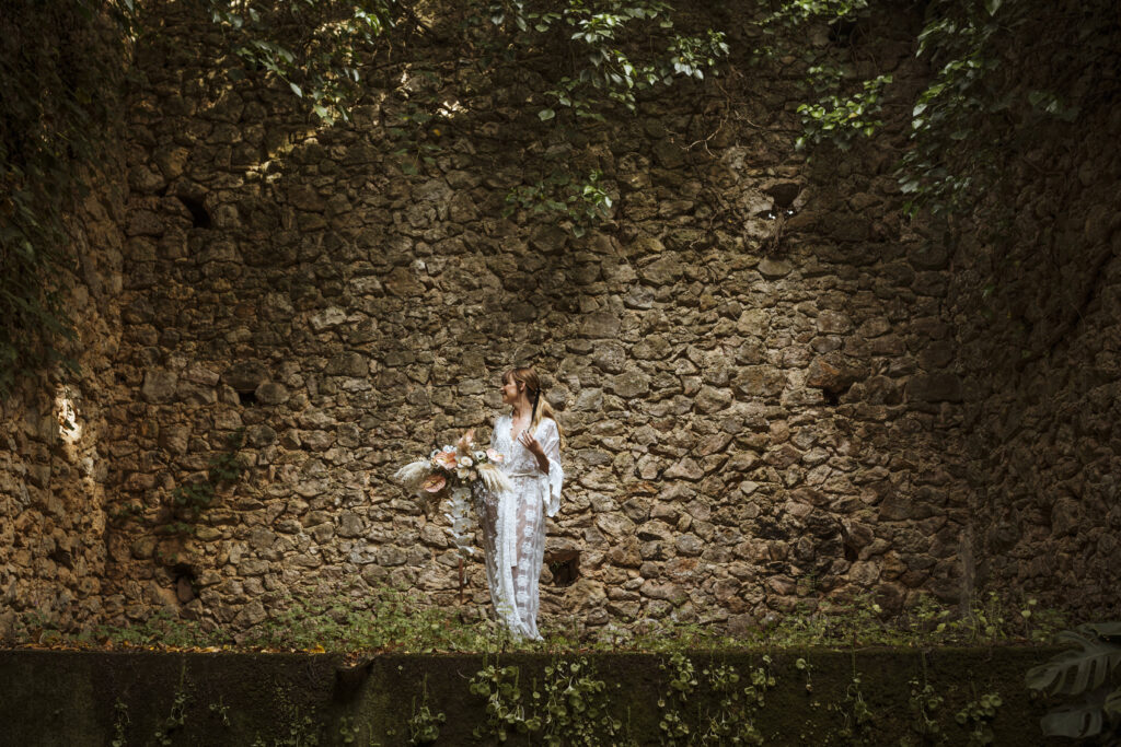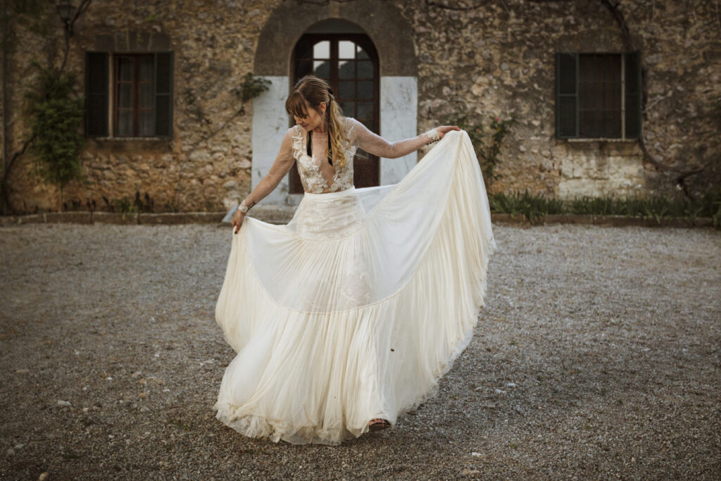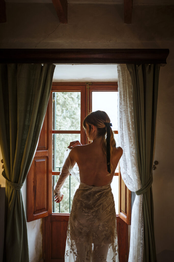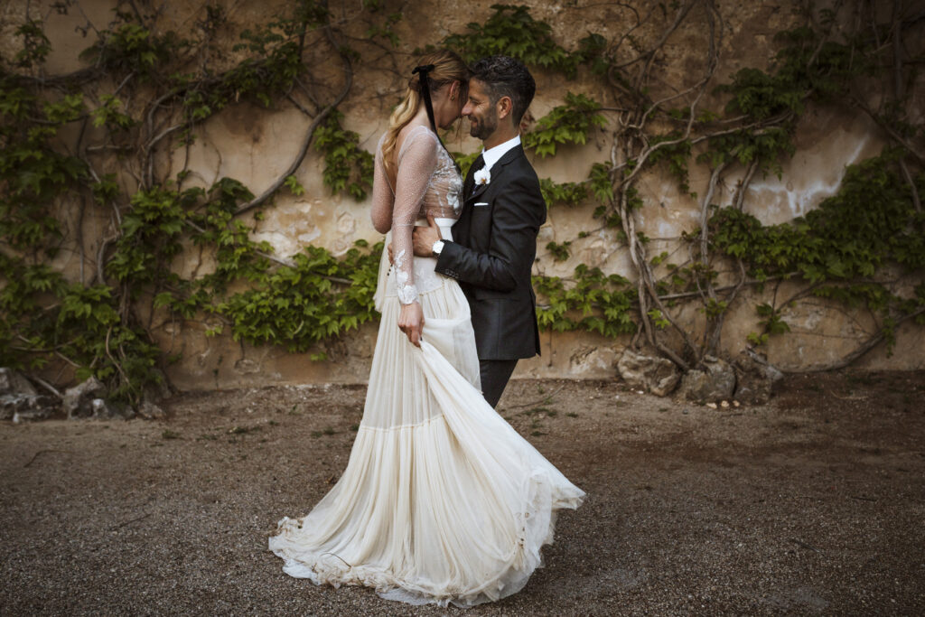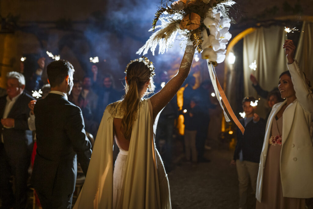 Quizá lo que tuvimos claro des de el primer minuto era el lugar. Estaba claro que elegiríamos Mallorca y dentro de nuestra isla, esta preciosa finca es de los lugares que no nos cansamos de ver. Hemos estado allí ya para decenas de bodas y, día tras día, su luz, su encanto, su carácter y autenticidad nos re-enamora. Y aunque en un principio pensamos en celebrar una boda de día, en seguida entendimos que para conseguir el ambiente que buscábamos debíamos cambiar algunos tiempos. Queríamos una ceremonia con luces, quería una entrada muy íntima donde la atención se centrara solo en lo importante, queríamos empezar la fiesta bebiendo, bailando y con muchas risas. Así que invertimos los horarios para empezar con un estupendo cocktail de bienvenida que Lili y Salva crearon expresamente y sirvieron con maestría. Luego seguimos por dos horas de aperitivo con infinidad de manjares alrededor de grandes barras de bar para finamente darnos el sí quiero después de la puesta de sol.