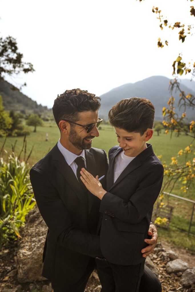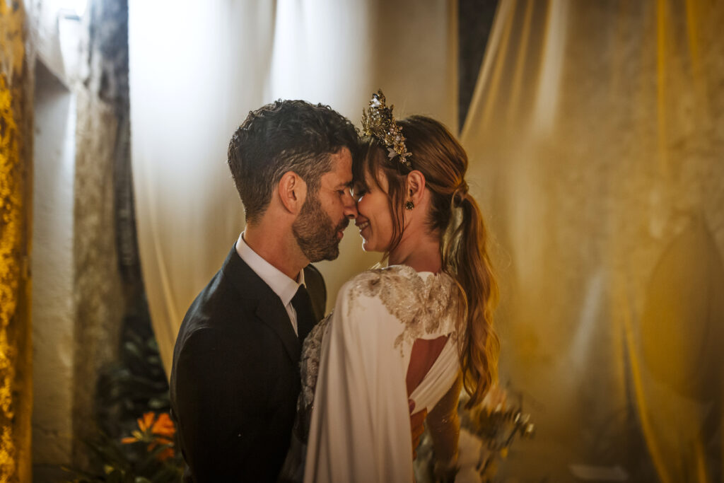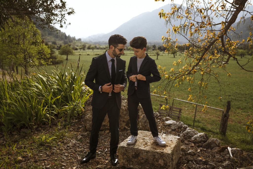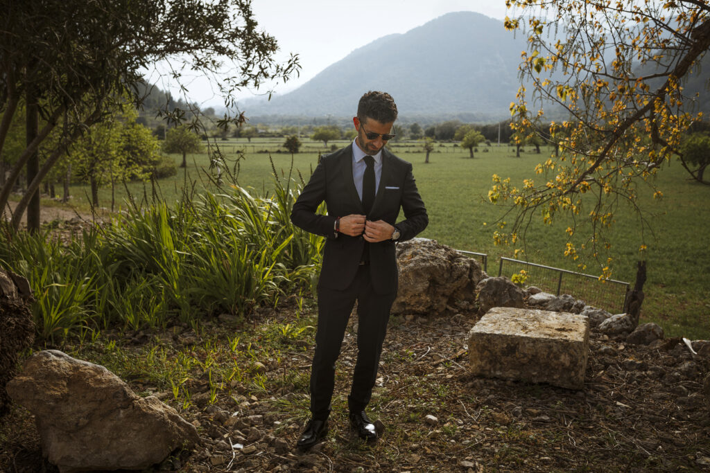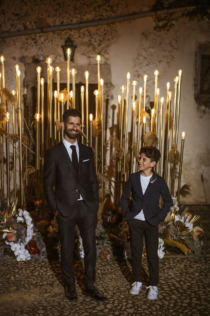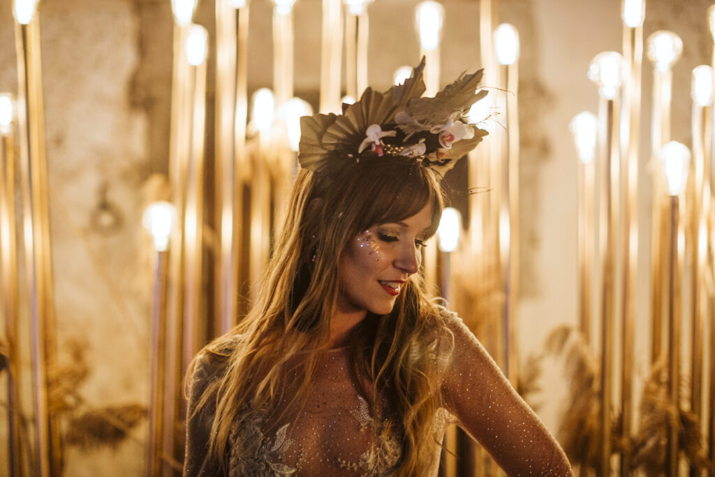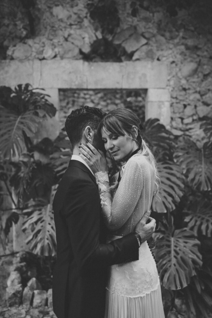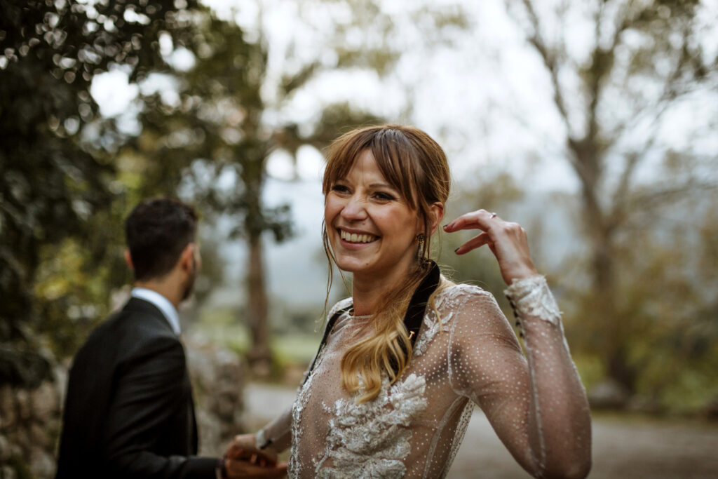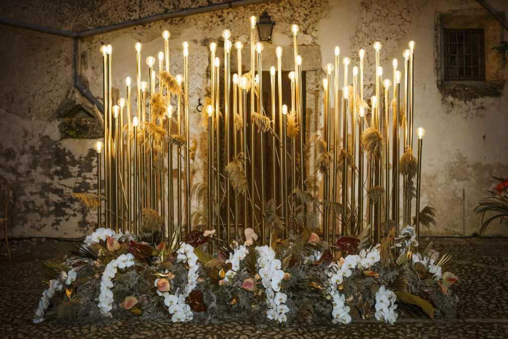 Quizá lo que tuvimos claro des de el primer minuto era el lugar. Estaba claro que elegiríamos Mallorca y dentro de nuestra isla, esta preciosa finca es de los lugares que no nos cansamos de ver. Hemos estado allí ya para decenas de bodas y, día tras día, su luz, su encanto, su carácter y autenticidad nos re-enamora. Y aunque en un principio pensamos en celebrar una boda de día, en seguida entendimos que para conseguir el ambiente que buscábamos debíamos cambiar algunos tiempos. Queríamos una ceremonia con luces, quería una entrada muy íntima donde la atención se centrara solo en lo importante, queríamos empezar la fiesta bebiendo, bailando y con muchas risas. Así que invertimos los horarios para empezar con un estupendo cocktail de bienvenida que Lili y Salva crearon expresamente y sirvieron con maestría. Luego seguimos por dos horas de aperitivo con infinidad de manjares alrededor de grandes barras de bar para finamente darnos el sí quiero después de la puesta de sol.