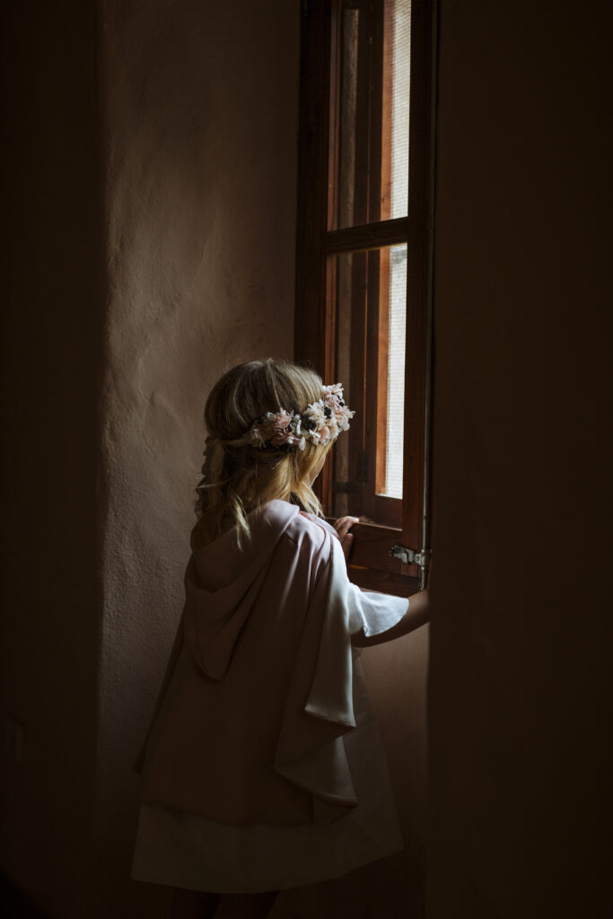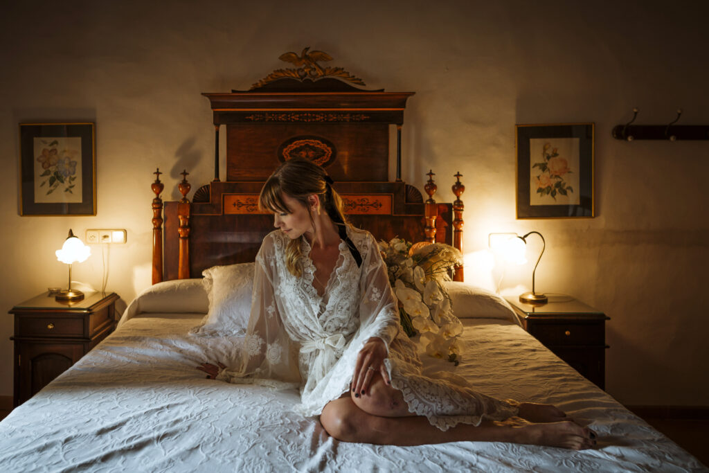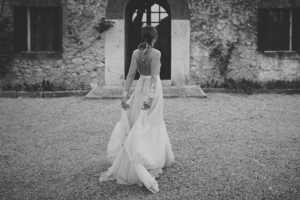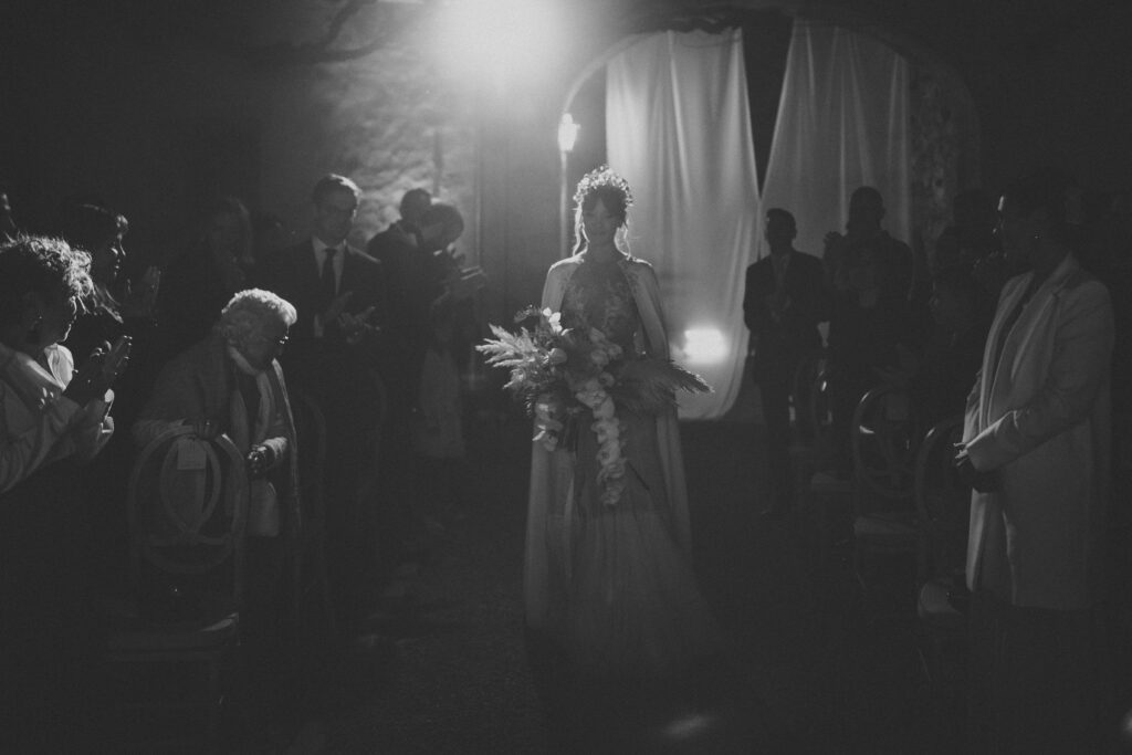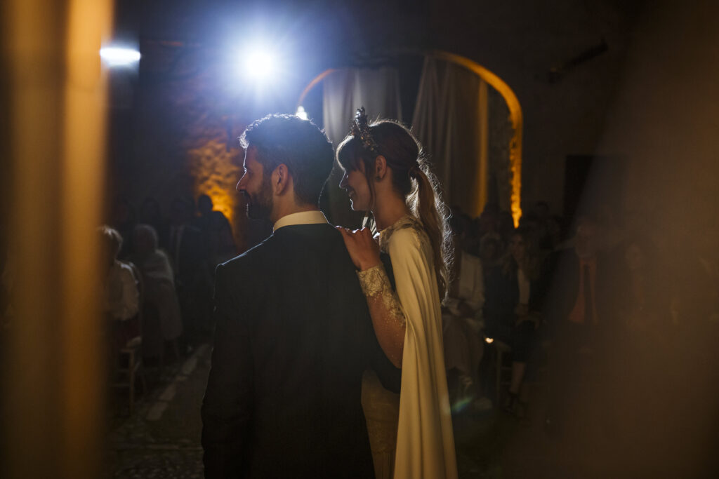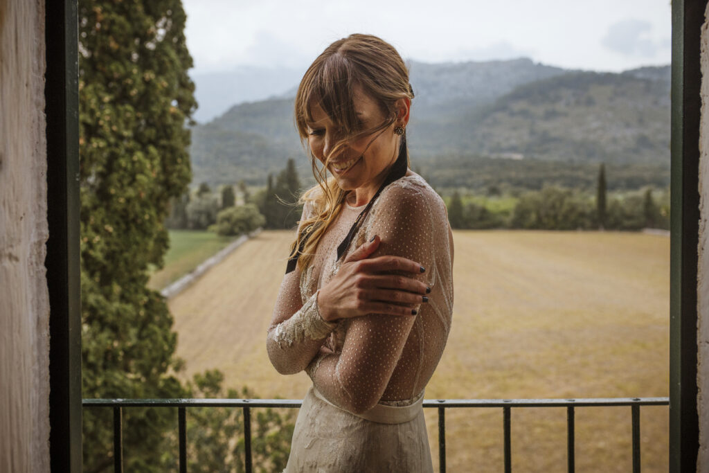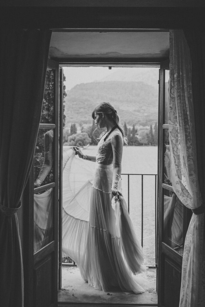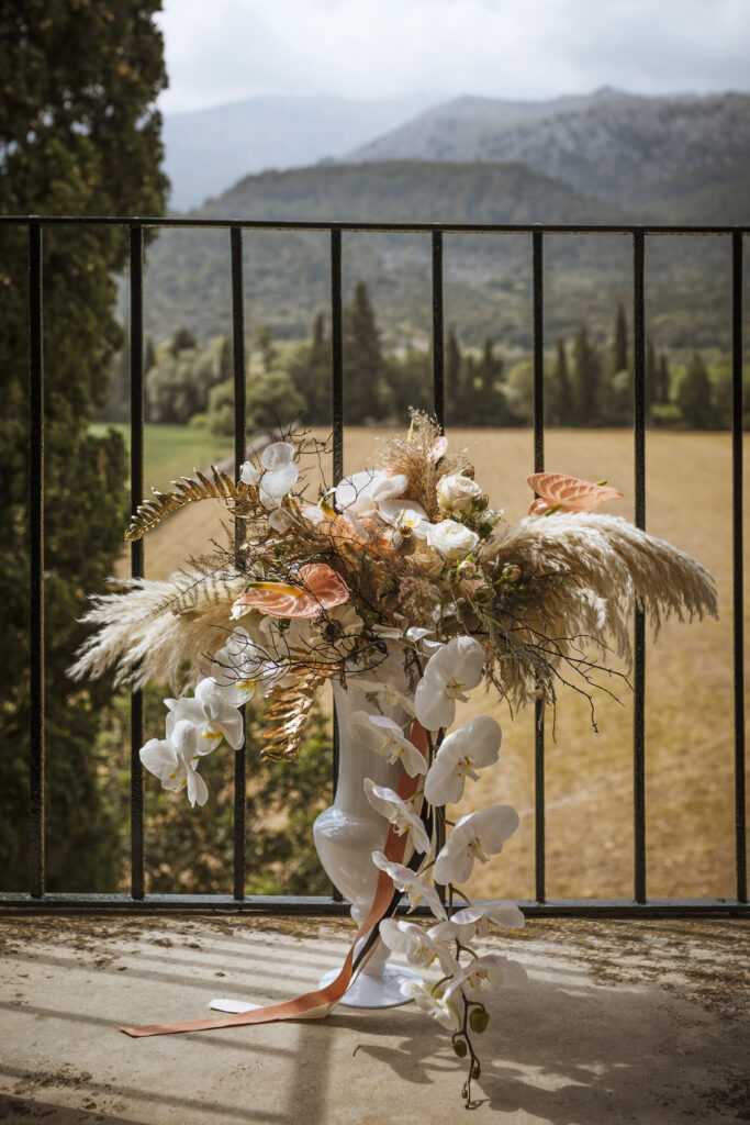 Quizá lo que tuvimos claro des de el primer minuto era el lugar. Estaba claro que elegiríamos Mallorca y dentro de nuestra isla, esta preciosa finca es de los lugares que no nos cansamos de ver. Hemos estado allí ya para decenas de bodas y, día tras día, su luz, su encanto, su carácter y autenticidad nos re-enamora. Y aunque en un principio pensamos en celebrar una boda de día, en seguida entendimos que para conseguir el ambiente que buscábamos debíamos cambiar algunos tiempos. Queríamos una ceremonia con luces, quería una entrada muy íntima donde la atención se centrara solo en lo importante, queríamos empezar la fiesta bebiendo, bailando y con muchas risas. Así que invertimos los horarios para empezar con un estupendo cocktail de bienvenida que Lili y Salva crearon expresamente y sirvieron con maestría. Luego seguimos por dos horas de aperitivo con infinidad de manjares alrededor de grandes barras de bar para finamente darnos el sí quiero después de la puesta de sol.