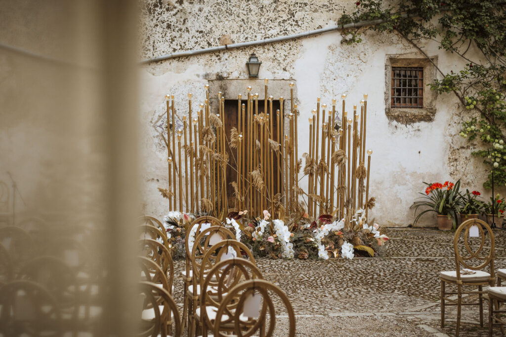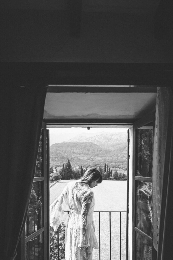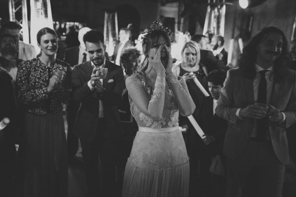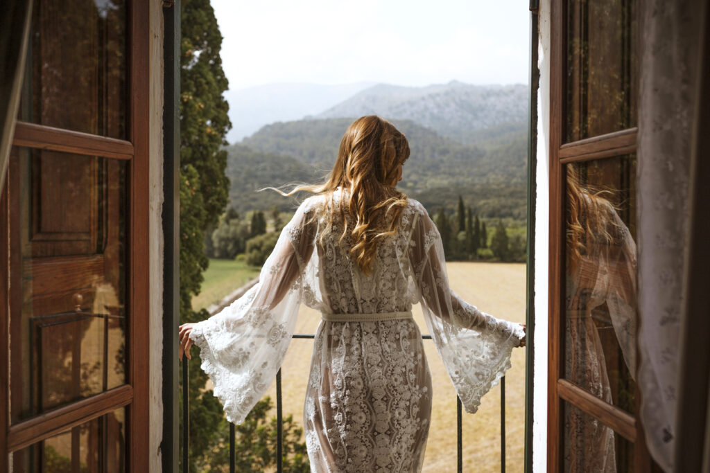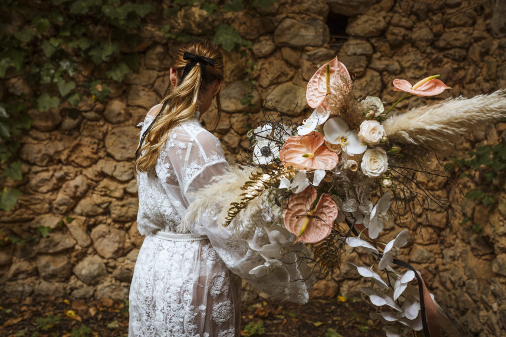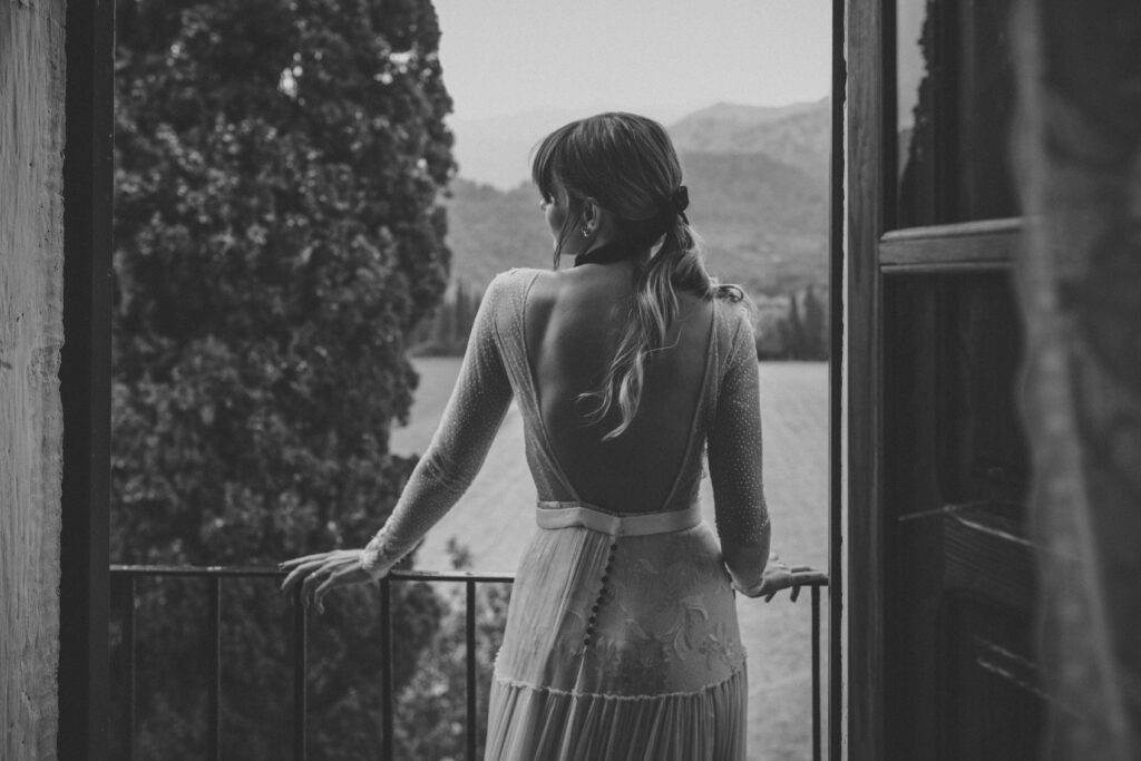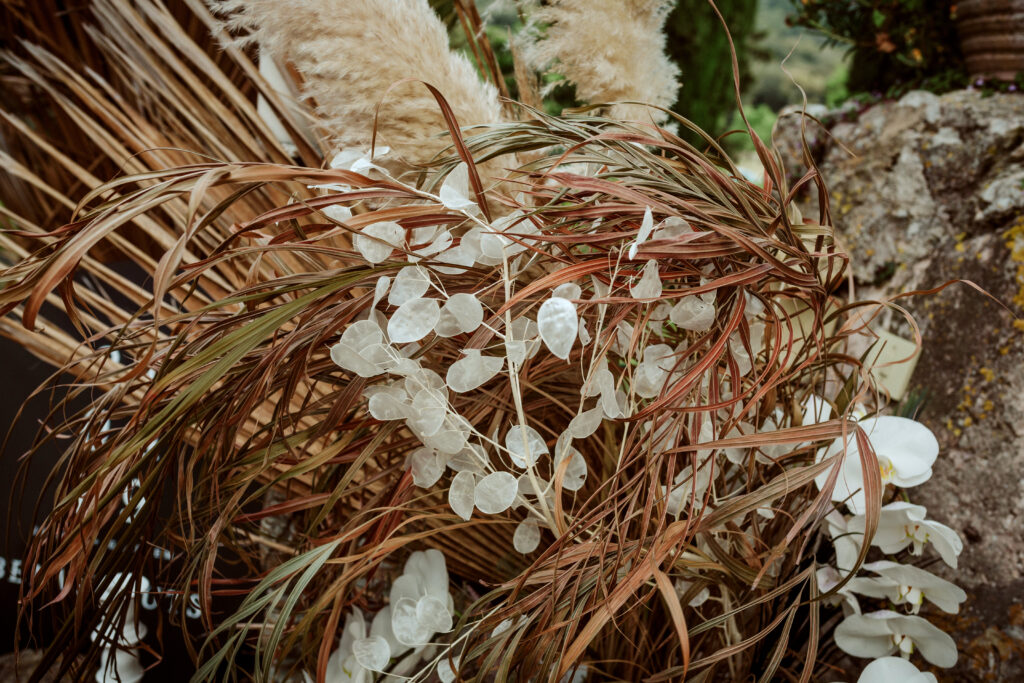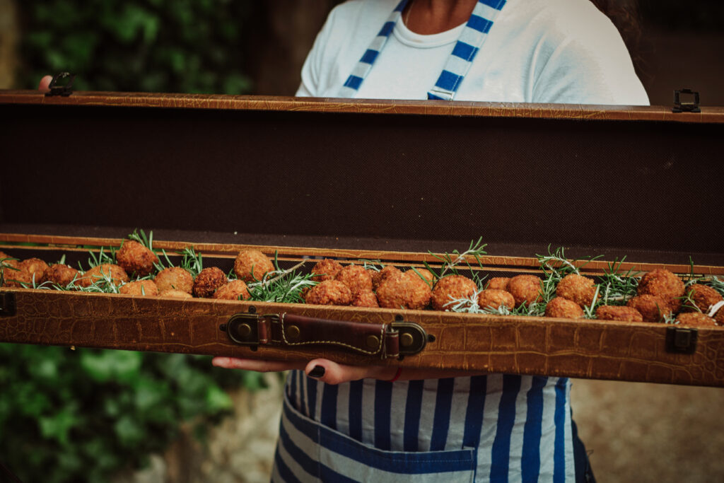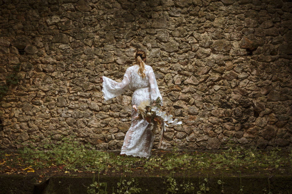 Quizá lo que tuvimos claro des de el primer minuto era el lugar. Estaba claro que elegiríamos Mallorca y dentro de nuestra isla, esta preciosa finca es de los lugares que no nos cansamos de ver. Hemos estado allí ya para decenas de bodas y, día tras día, su luz, su encanto, su carácter y autenticidad nos re-enamora. Y aunque en un principio pensamos en celebrar una boda de día, en seguida entendimos que para conseguir el ambiente que buscábamos debíamos cambiar algunos tiempos. Queríamos una ceremonia con luces, quería una entrada muy íntima donde la atención se centrara solo en lo importante, queríamos empezar la fiesta bebiendo, bailando y con muchas risas. Así que invertimos los horarios para empezar con un estupendo cocktail de bienvenida que Lili y Salva crearon expresamente y sirvieron con maestría. Luego seguimos por dos horas de aperitivo con infinidad de manjares alrededor de grandes barras de bar para finamente darnos el sí quiero después de la puesta de sol.