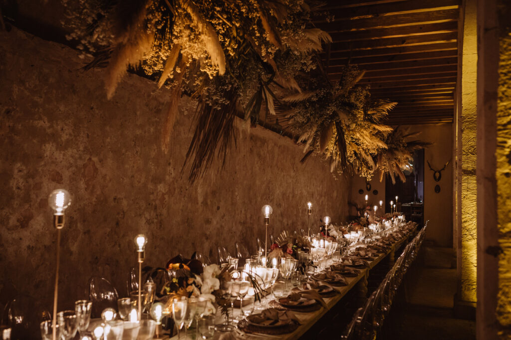 La cena, otra locura para la que no tenemos suficientes agradecimientos para Ania & Dani, transcurrió alrededor de una gran mesa en la que estábamos todos los invitados, familia, amigos y staff (amigos al fin y al cabo). Así que todos juntos disfrutamos de huevos fritos con patatas y bogavante entre otras maravillas. Y que me decís de la decoración? Guida y Francis plasmaron una vez más mi sueño a las mil maravillas. Todo era perfecto. Con David, una vez más puede buscar cada elemento para que la mesa fuese perfecta, des de la cubertería, la cristalería, la vajilla, las mesas, las sillas, las estufas,….todo fue elegido minuciosamente. Las lámparas se crearon para la ocasión y Julio iluminó cada rincón como nadie.