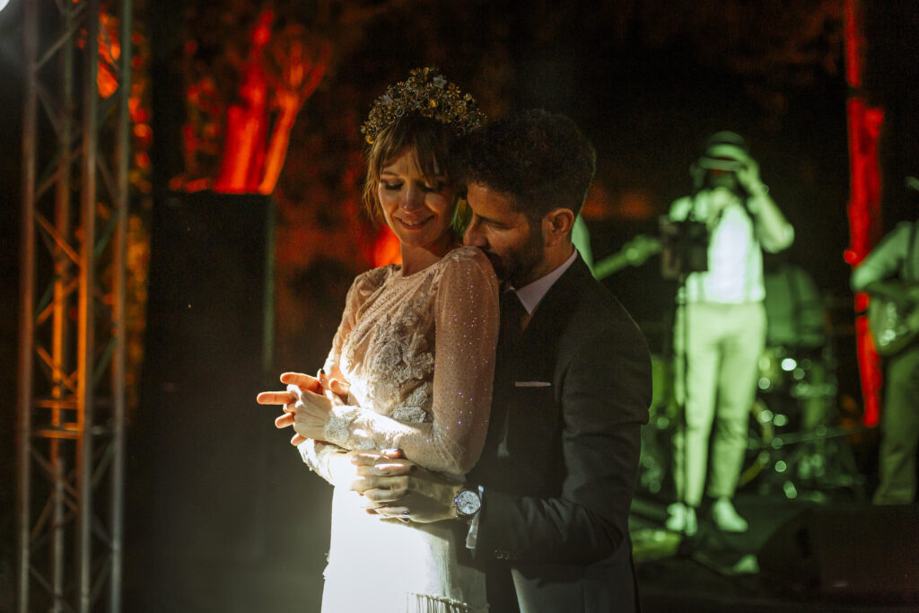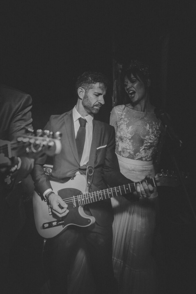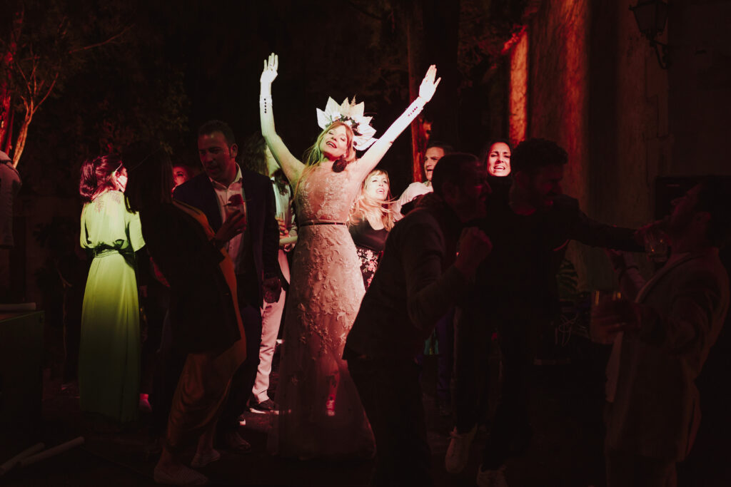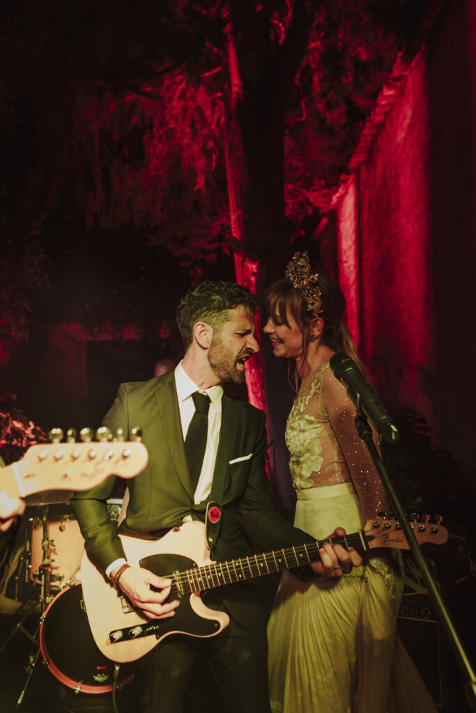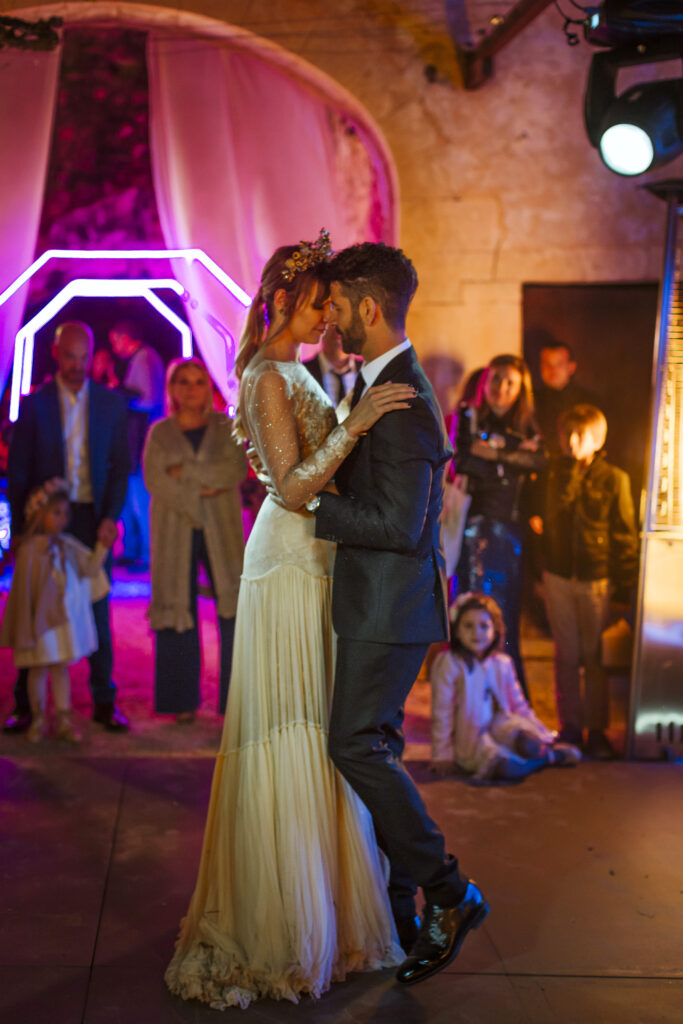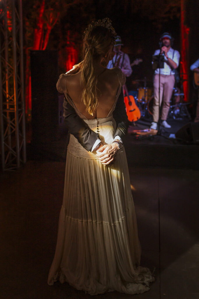 La música vino primero de la mano de Paco Colombás que puso sus mejores músicos a nuestra disposición y tuvimos música en vivo des de él inicio hasta la primera parte de la fiesta. Sin duda, un gran acierto. Su banda fue brutal!!!! Pero lo que me dejo sin respiración fue ver subir al escenario a mi marido y un par de cómplices para regalarme el mejor de los conciertos. Algo que no olvidaré jamás. Y para rematar la noche Toni Llobera nos mantuvo en la pista de baile hasta altas horas de la madrugada sin parar de bailar. Además, él y su equipo fueron los artífices de una transformación brutal del espacio. En dos horas desmontaron la ceremonia para montar escenario, iluminación con neones, pista de baile,….sin palabras.
