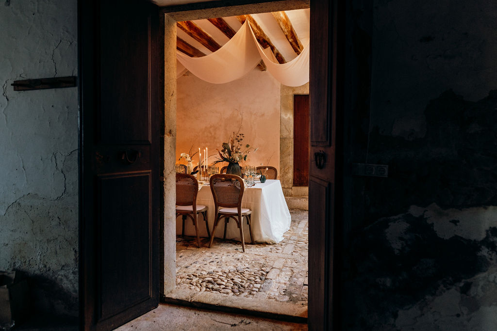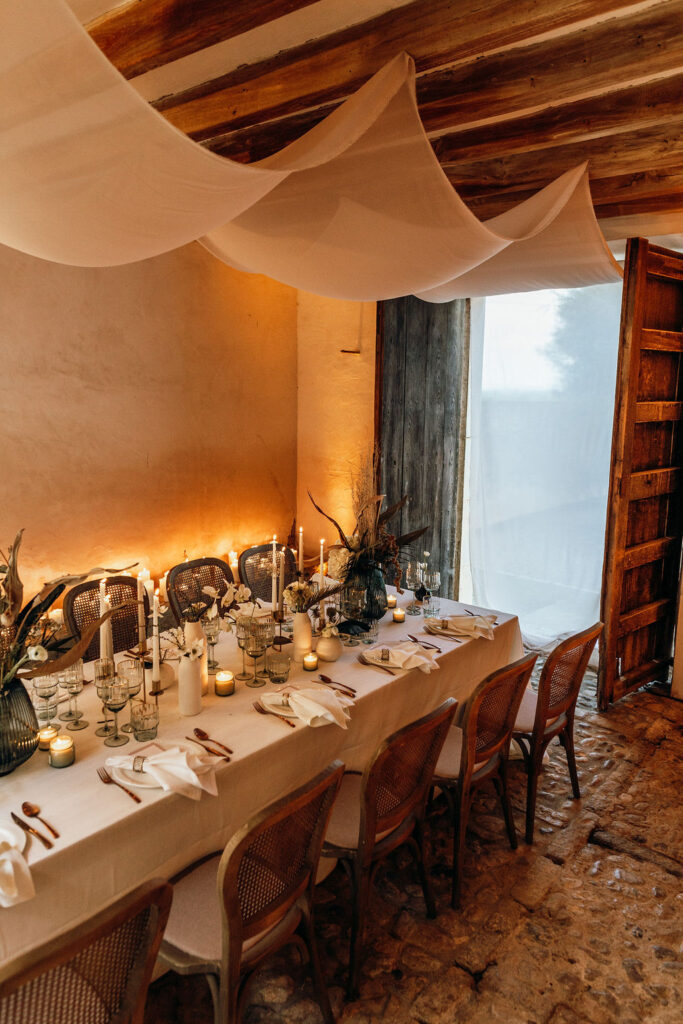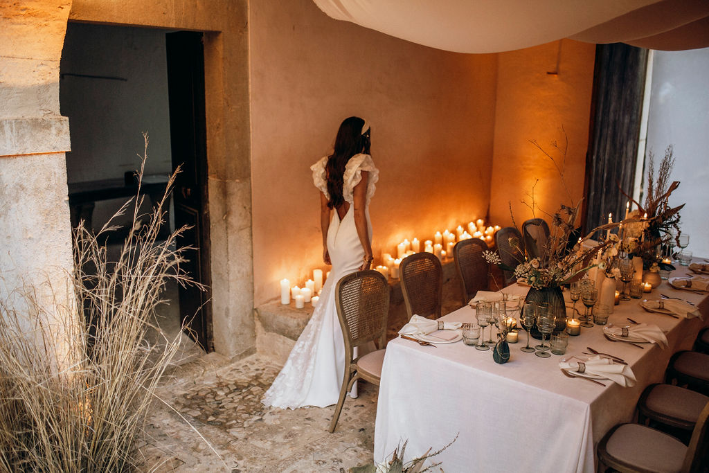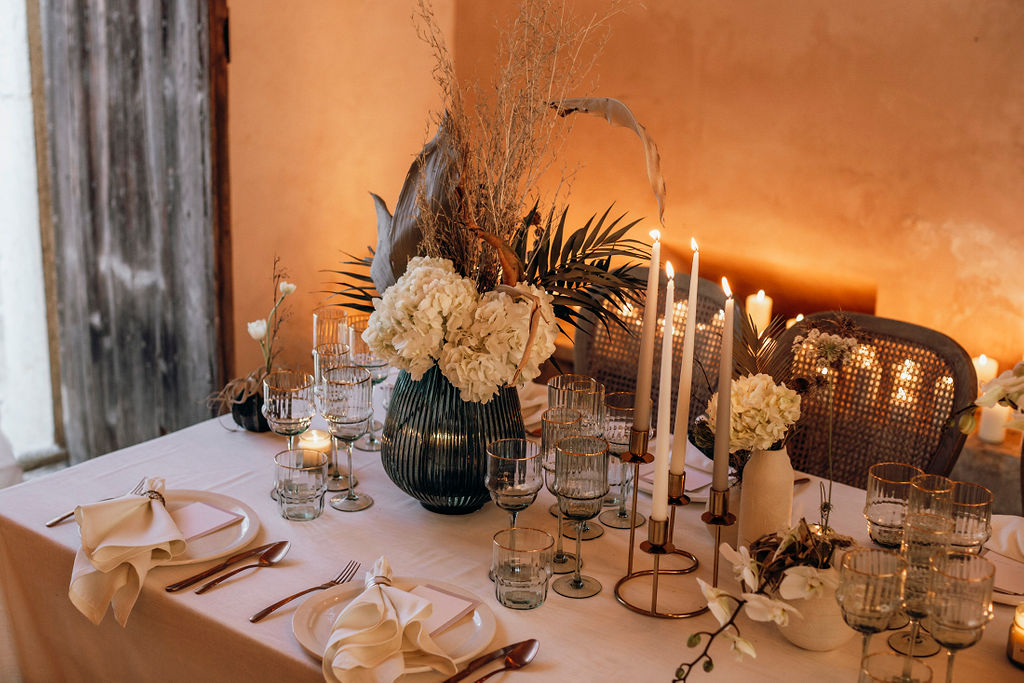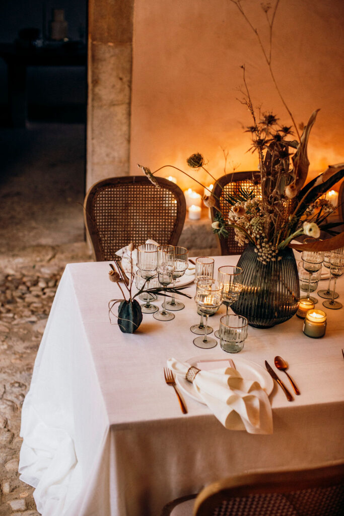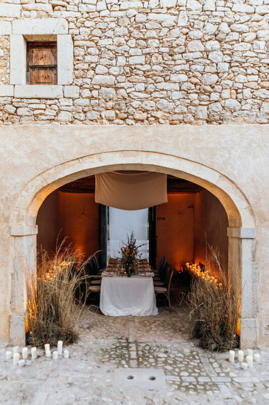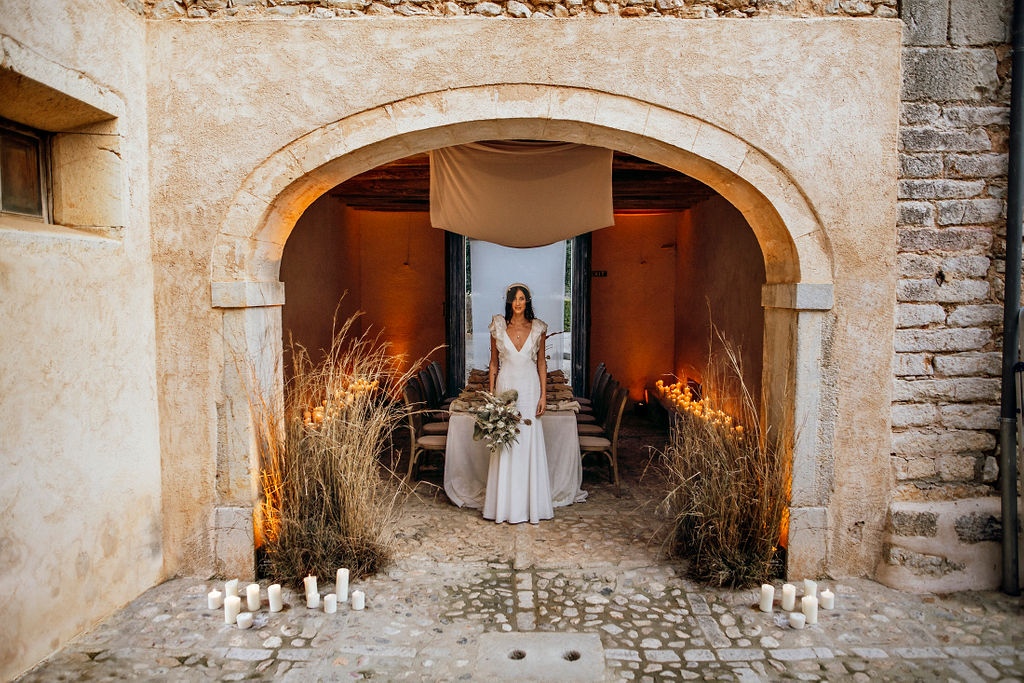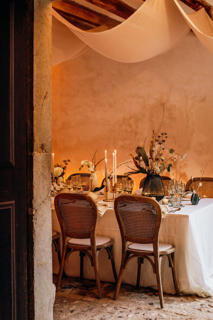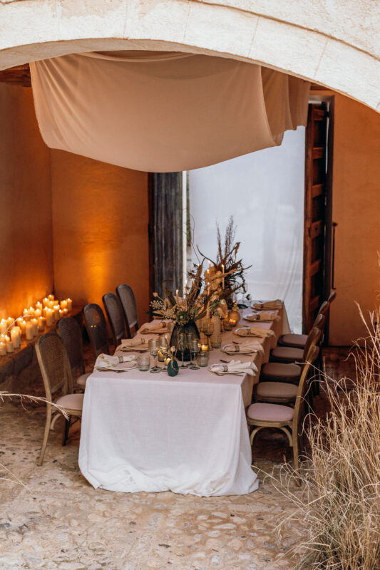 For this occasion we chose a palette of neutral tones between off-white and sand tones that we contrasted with shades of intense green and golden touches to add sophistication. The stone walls in Finca Morneta, the beauty and authenticity of the oldest corners of this property gave us the perfect setting. The contrasting note was to use elements of clean lines both in Jaiak’s tableware, as in the decorative elements or the wedding dress. Everything combined to perfection creating the perfect style. As in all our weddings, light plays an important role, so we created a play of indirect lights, candles and natural light itself filtered by subtle gauze.