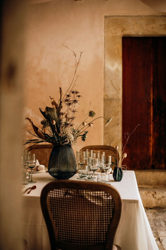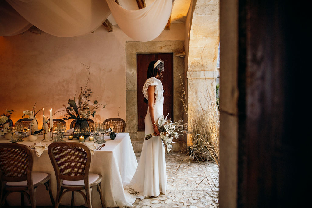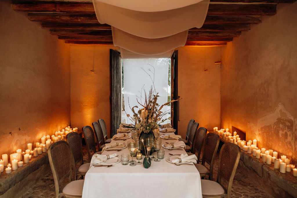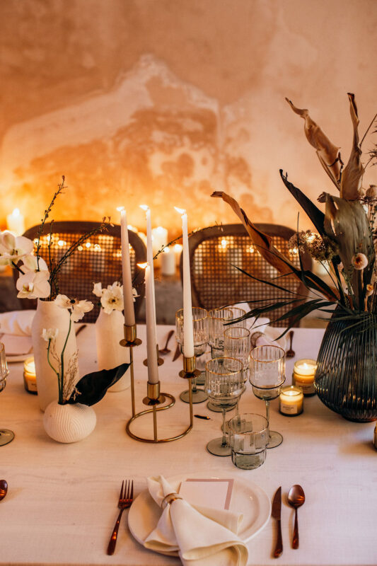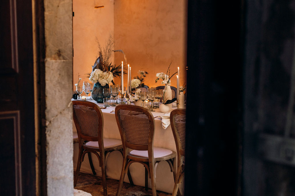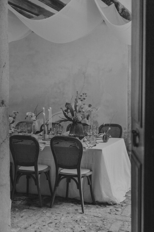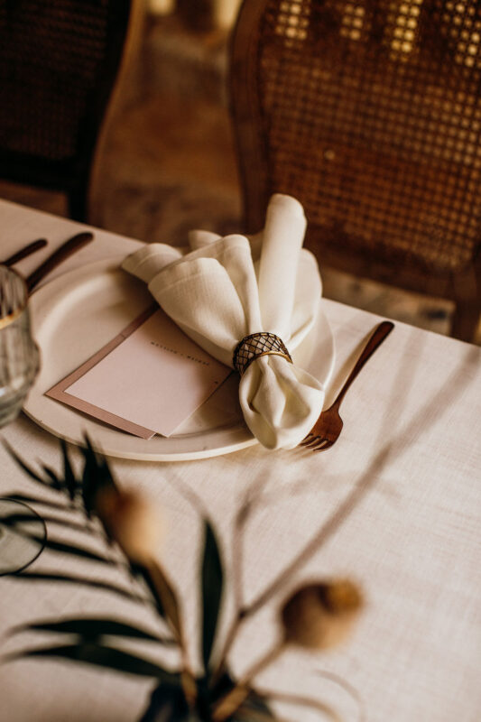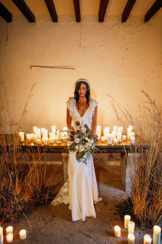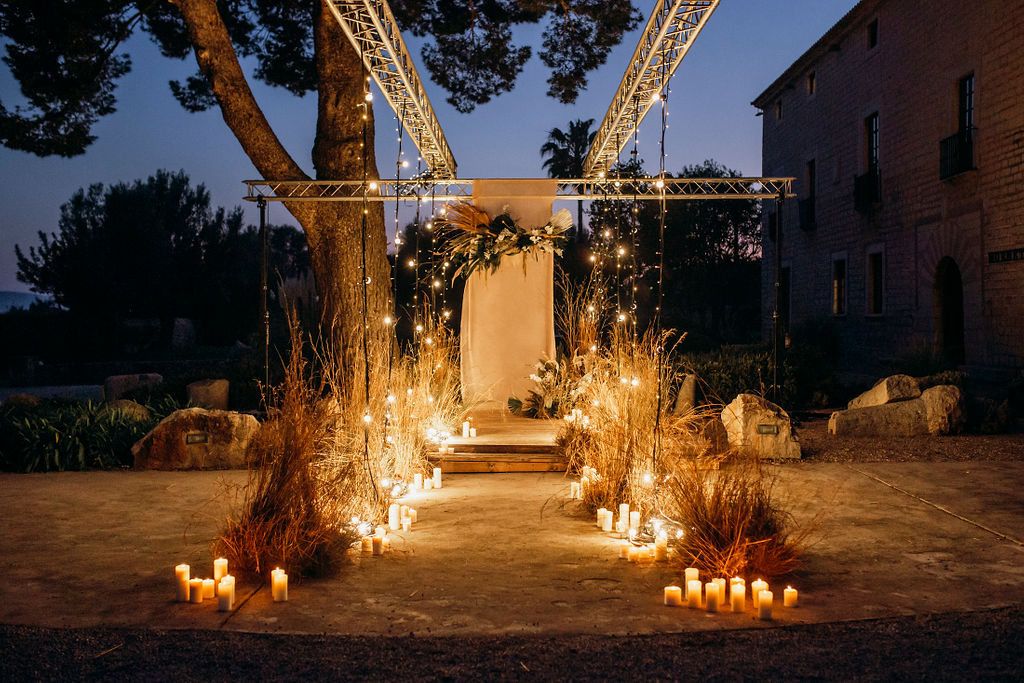 For this occasion we chose a palette of neutral tones between off-white and sand tones that we contrasted with shades of intense green and golden touches to add sophistication. The stone walls in Finca Morneta, the beauty and authenticity of the oldest corners of this property gave us the perfect setting. The contrasting note was to use elements of clean lines both in Jaiak’s tableware, as in the decorative elements or the wedding dress. Everything combined to perfection creating the perfect style. As in all our weddings, light plays an important role, so we created a play of indirect lights, candles and natural light itself filtered by subtle gauze.