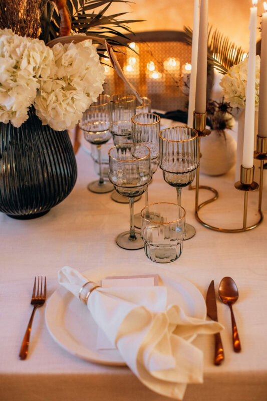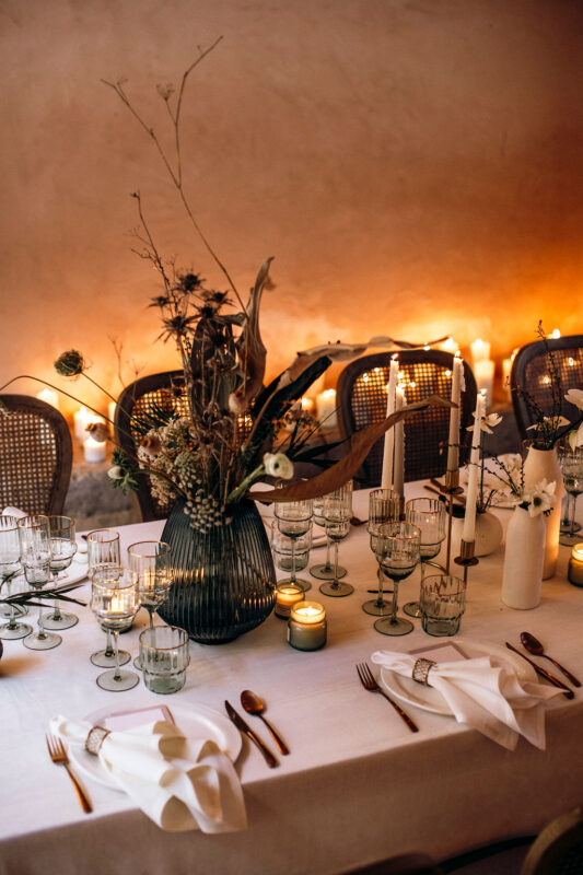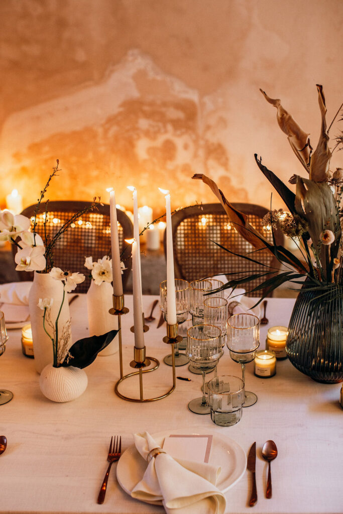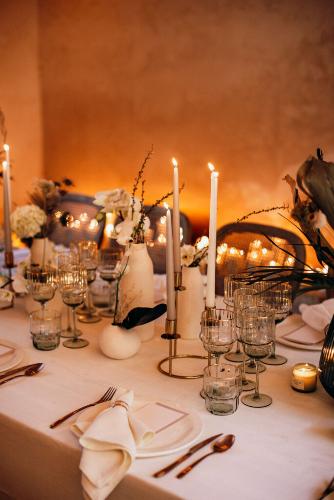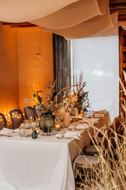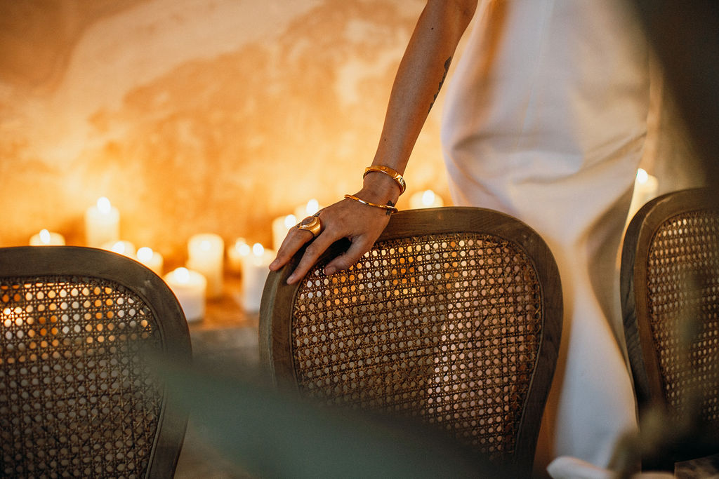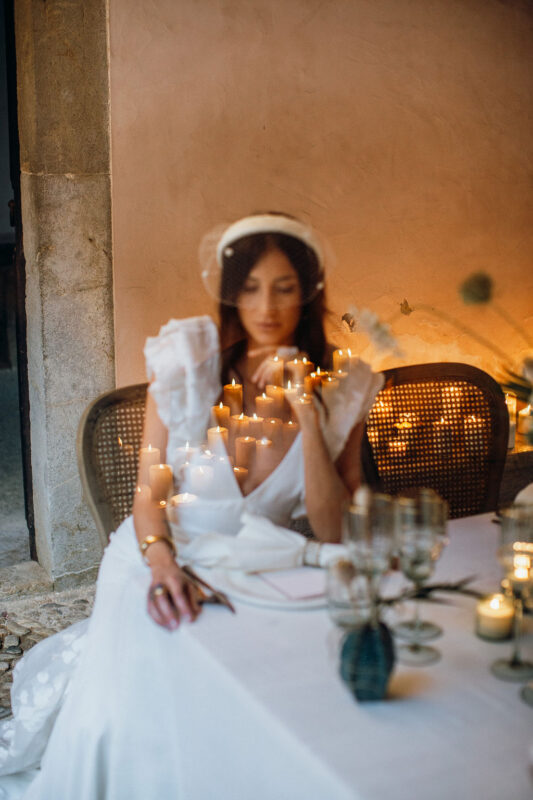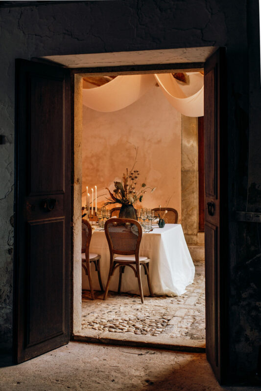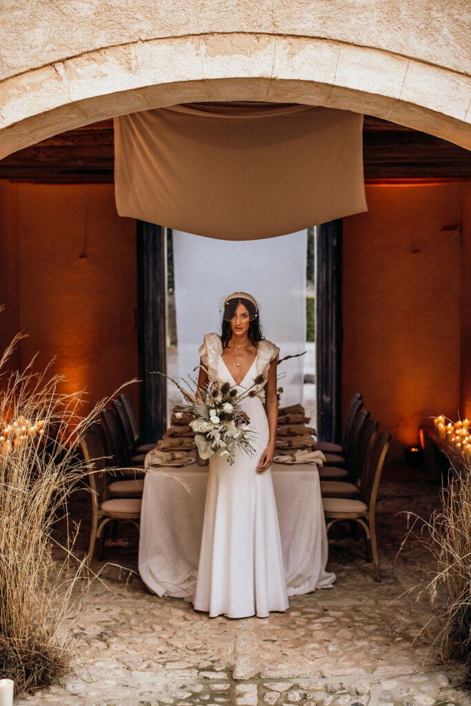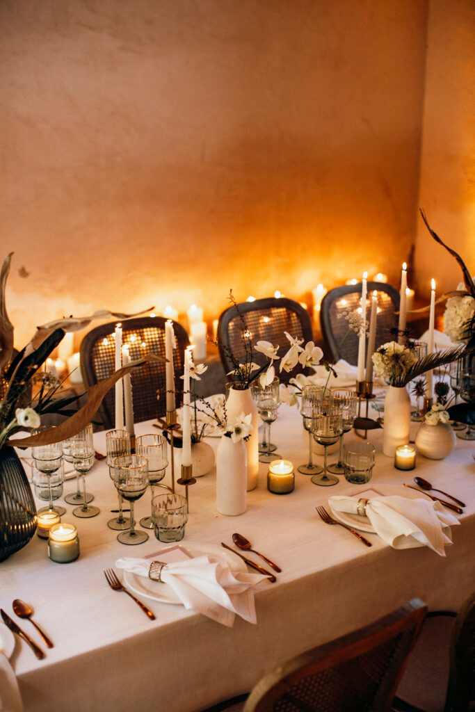 For this occasion we chose a palette of neutral tones between off-white and sand tones that we contrasted with shades of intense green and golden touches to add sophistication. The stone walls in Finca Morneta, the beauty and authenticity of the oldest corners of this property gave us the perfect setting. The contrasting note was to use elements of clean lines both in Jaiak’s tableware, as in the decorative elements or the wedding dress. Everything combined to perfection creating the perfect style. As in all our weddings, light plays an important role, so we created a play of indirect lights, candles and natural light itself filtered by subtle gauze.