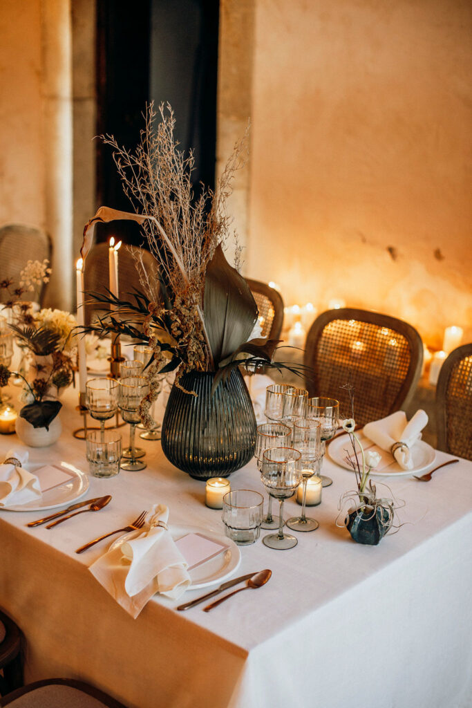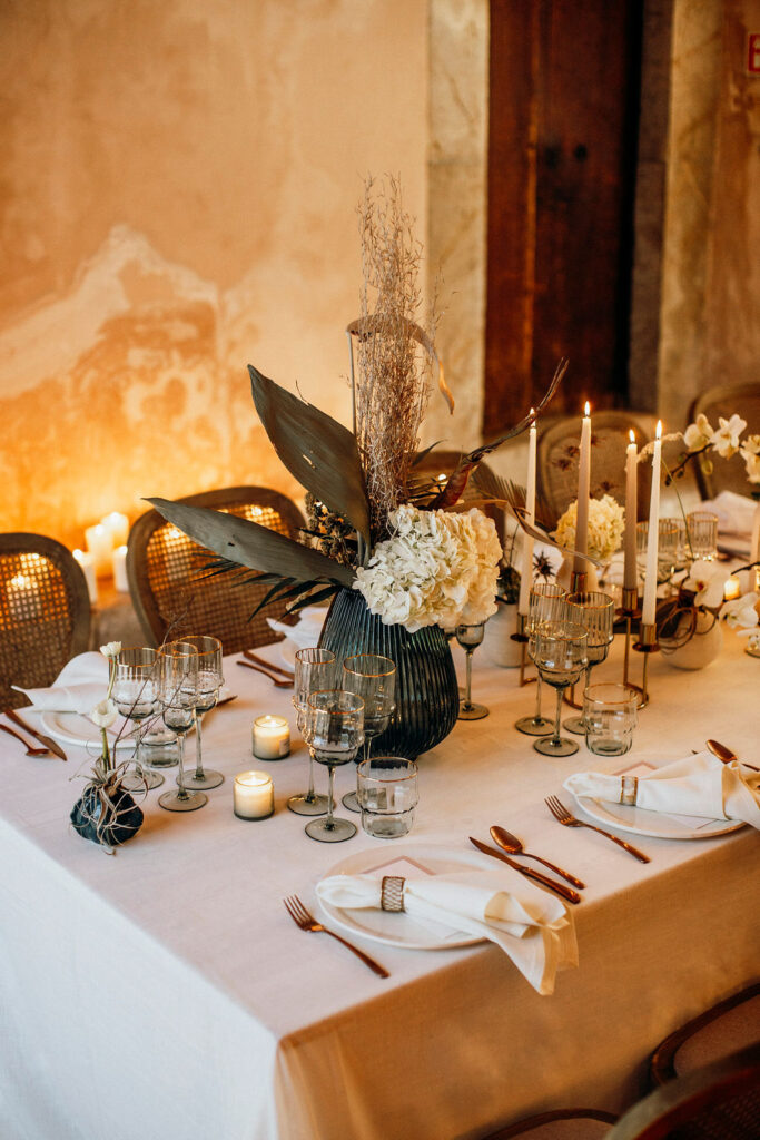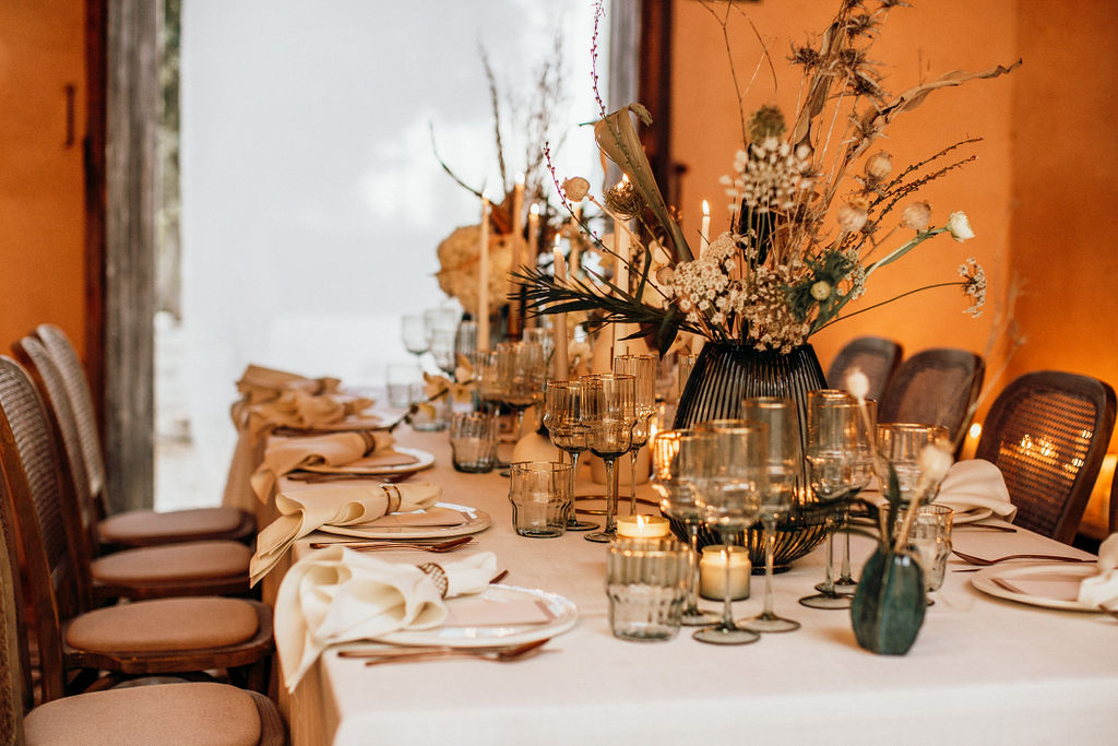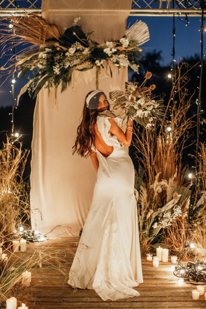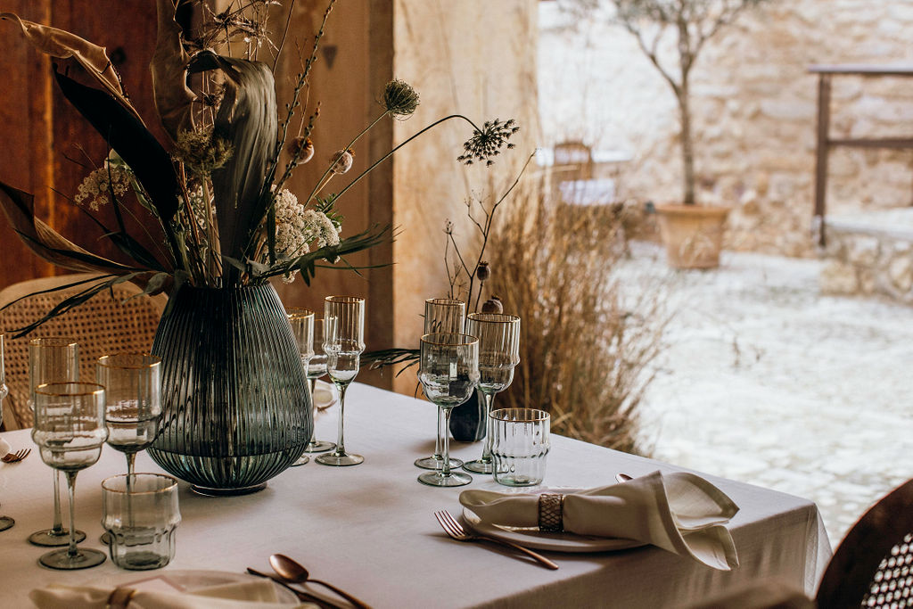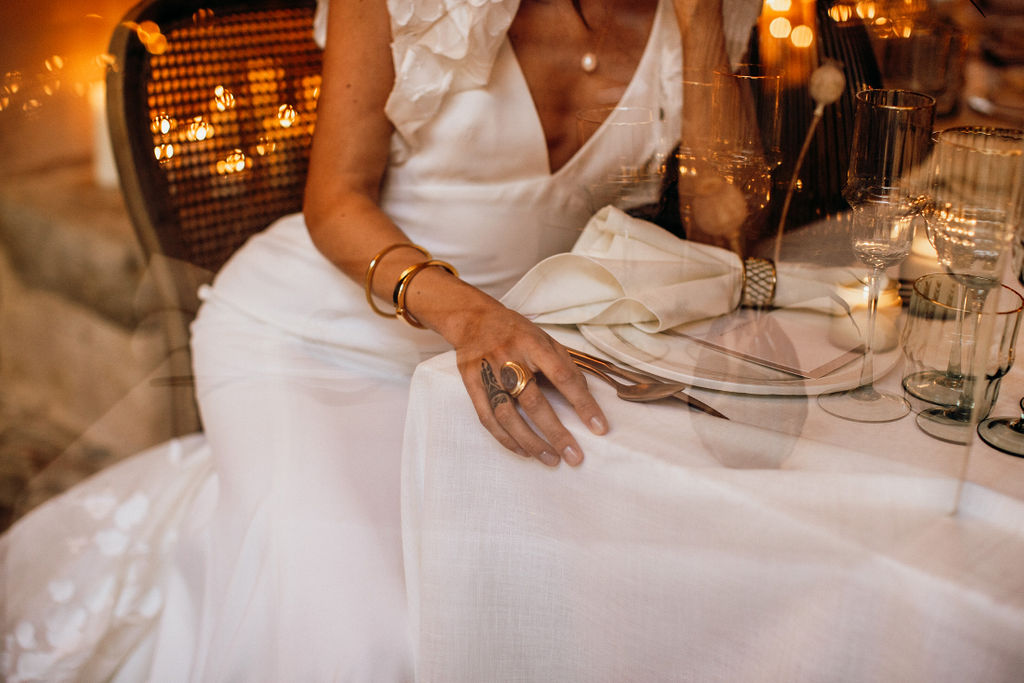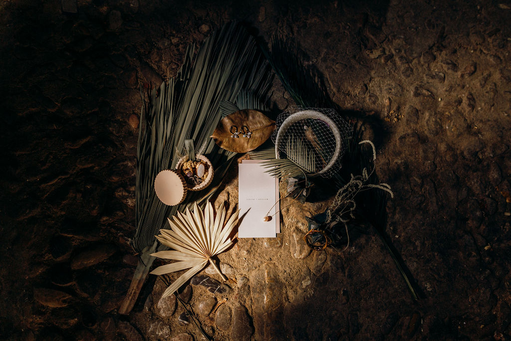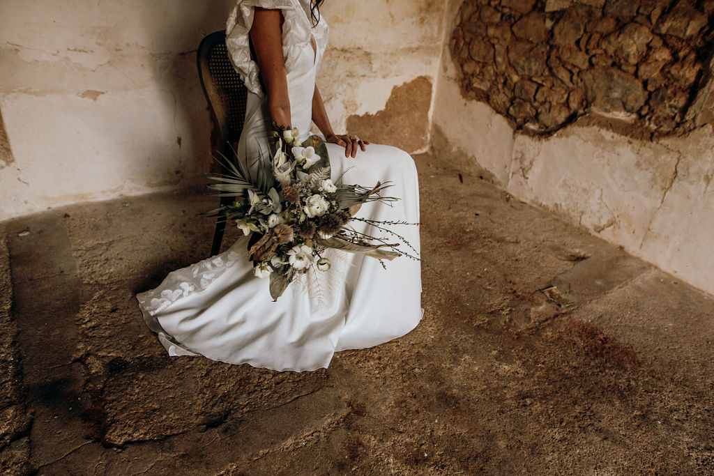 For this occasion we chose a palette of neutral tones between off-white and sand tones that we contrasted with shades of intense green and golden touches to add sophistication. The stone walls in Finca Morneta, the beauty and authenticity of the oldest corners of this property gave us the perfect setting. The contrasting note was to use elements of clean lines both in Jaiak’s tableware, as in the decorative elements or the wedding dress. Everything combined to perfection creating the perfect style. As in all our weddings, light plays an important role, so we created a play of indirect lights, candles and natural light itself filtered by subtle gauze.