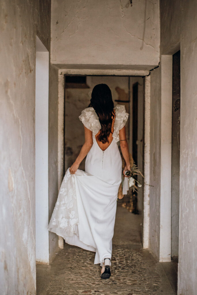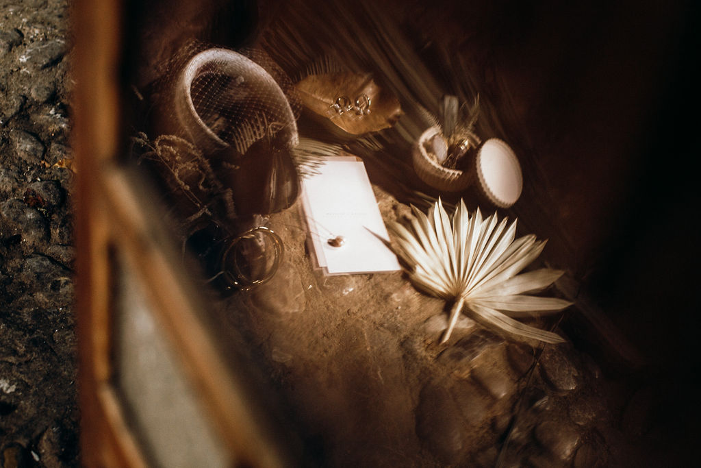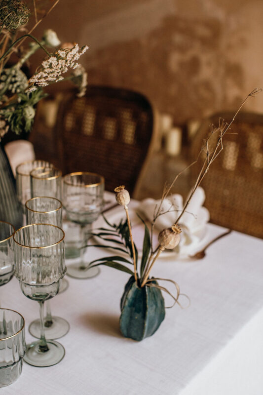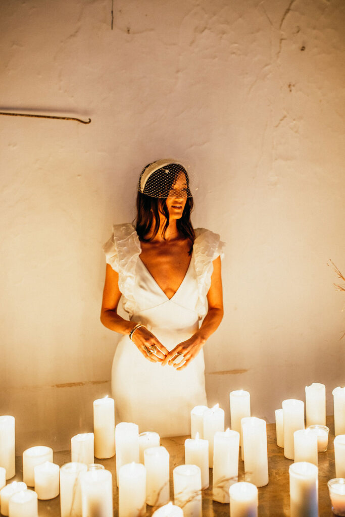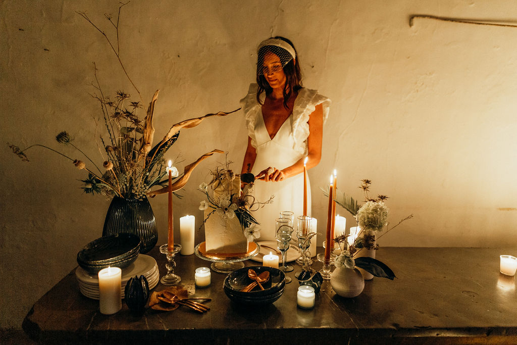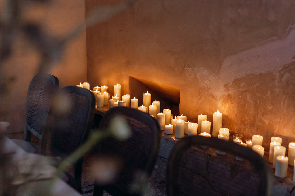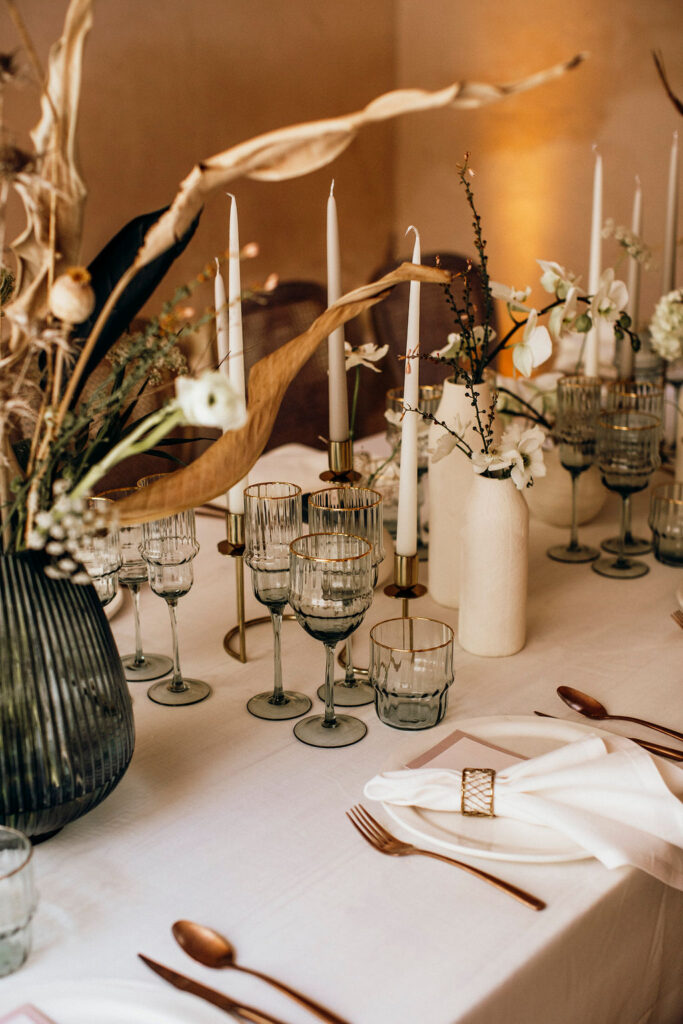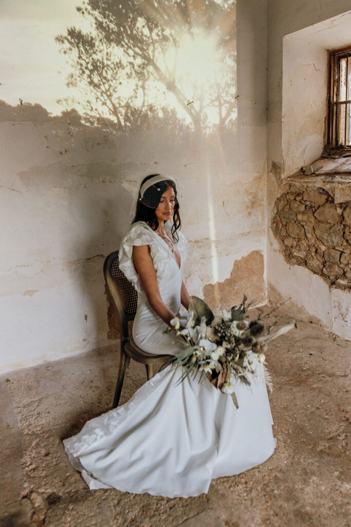 For this occasion we chose a palette of neutral tones between off-white and sand tones that we contrasted with shades of intense green and golden touches to add sophistication. The stone walls in Finca Morneta, the beauty and authenticity of the oldest corners of this property gave us the perfect setting. The contrasting note was to use elements of clean lines both in Jaiak’s tableware, as in the decorative elements or the wedding dress. Everything combined to perfection creating the perfect style. As in all our weddings, light plays an important role, so we created a play of indirect lights, candles and natural light itself filtered by subtle gauze.