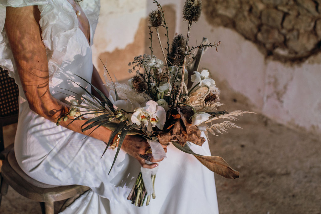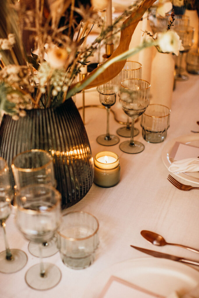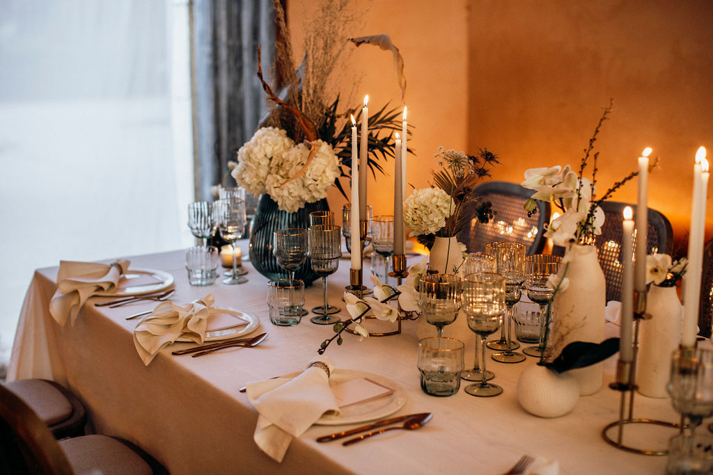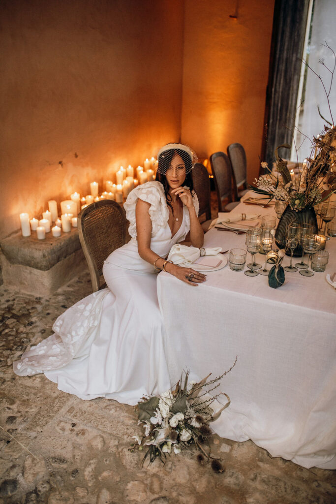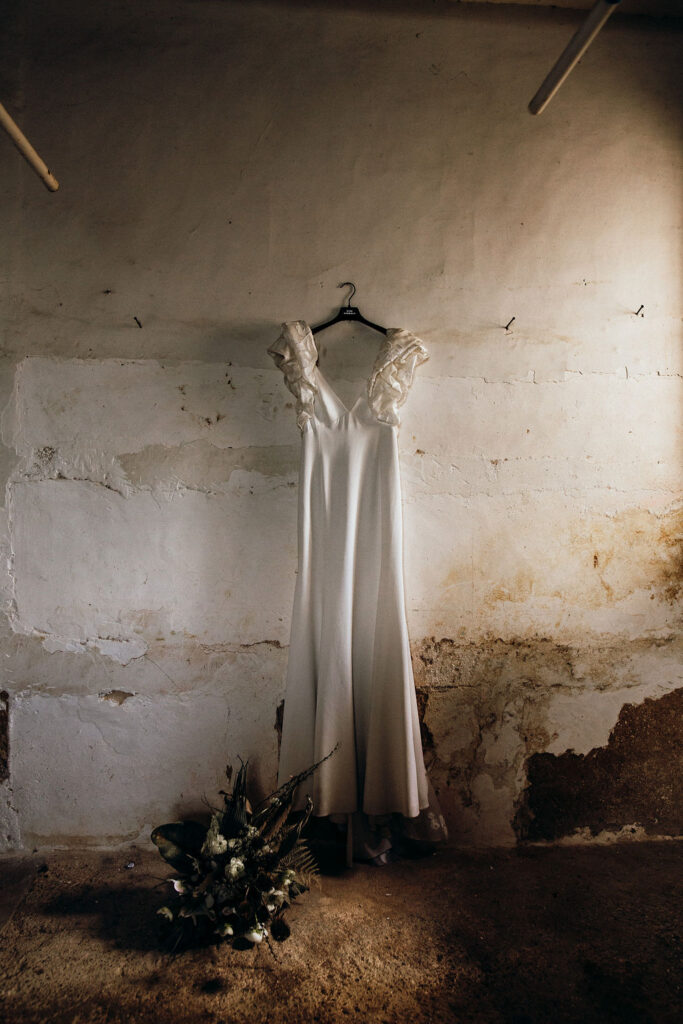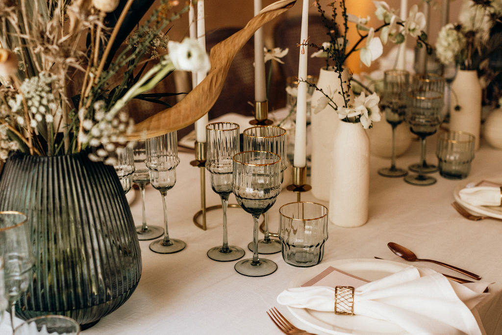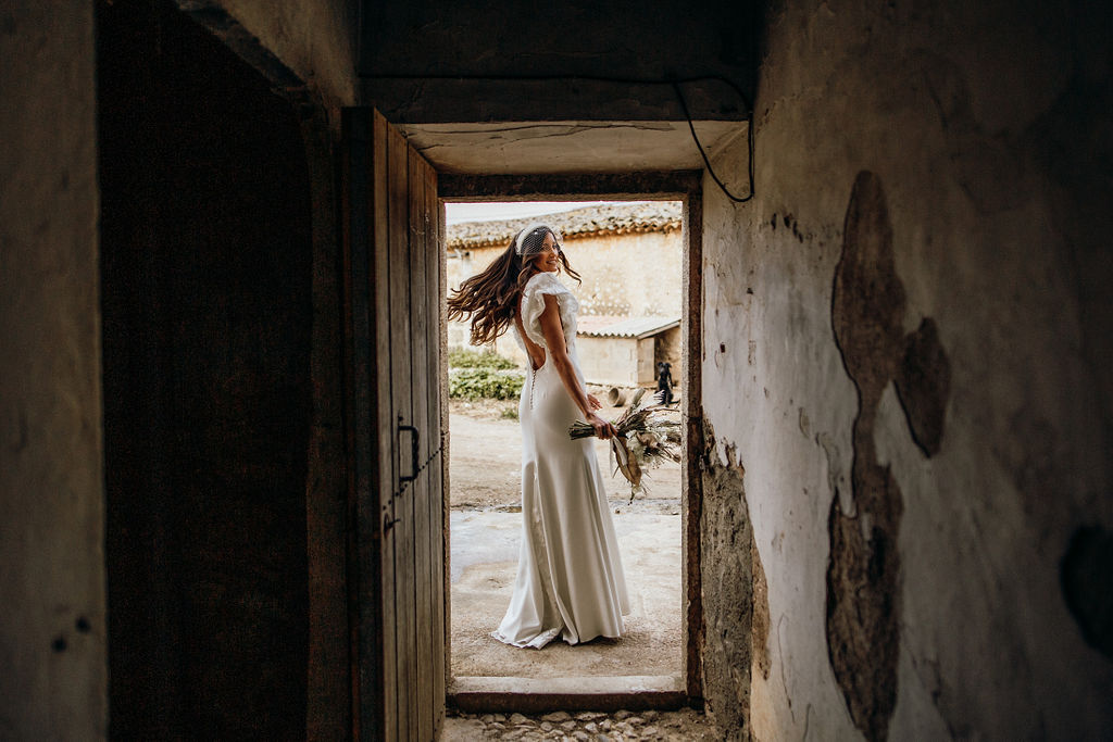 For this occasion we chose a palette of neutral tones between off-white and sand tones that we contrasted with shades of intense green and golden touches to add sophistication. The stone walls in Finca Morneta, the beauty and authenticity of the oldest corners of this property gave us the perfect setting. The contrasting note was to use elements of clean lines both in Jaiak’s tableware, as in the decorative elements or the wedding dress. Everything combined to perfection creating the perfect style. As in all our weddings, light plays an important role, so we created a play of indirect lights, candles and natural light itself filtered by subtle gauze.