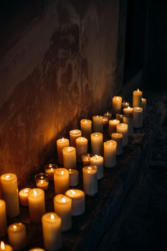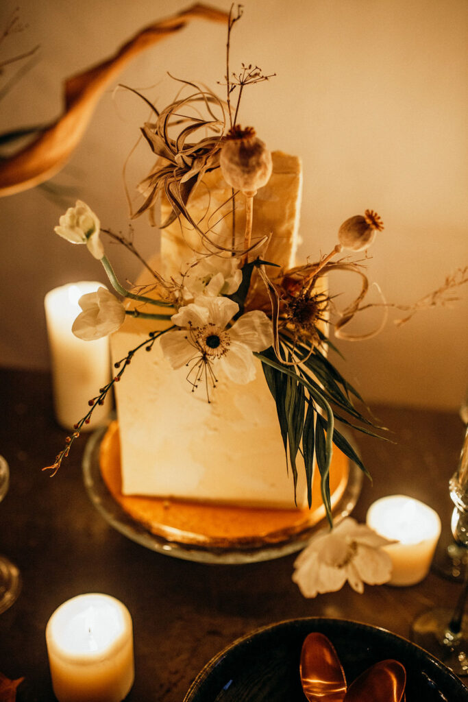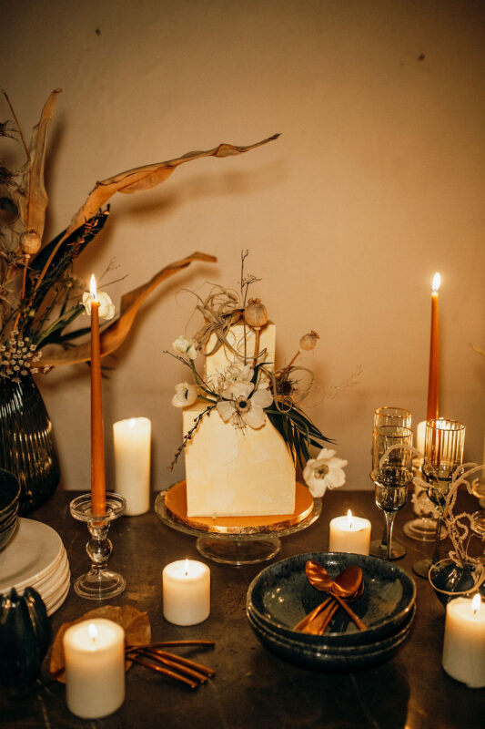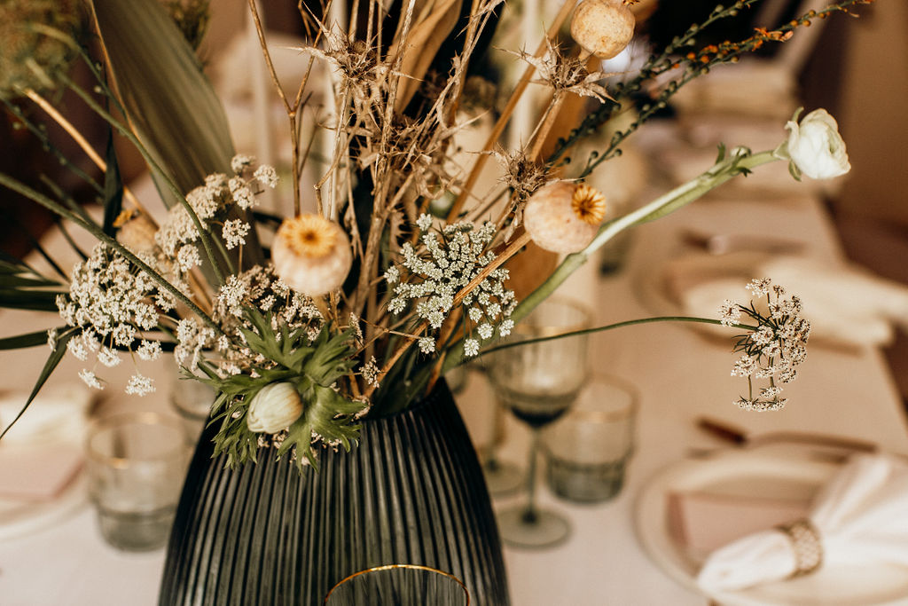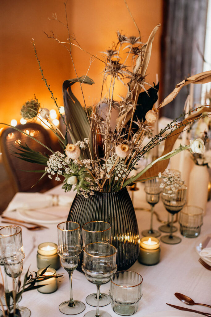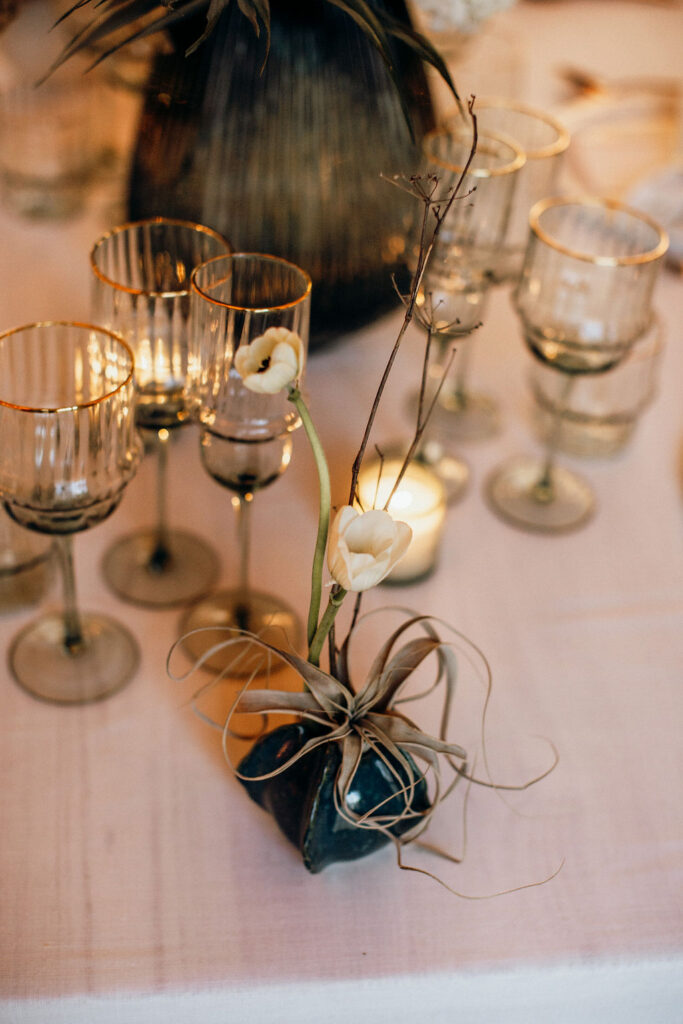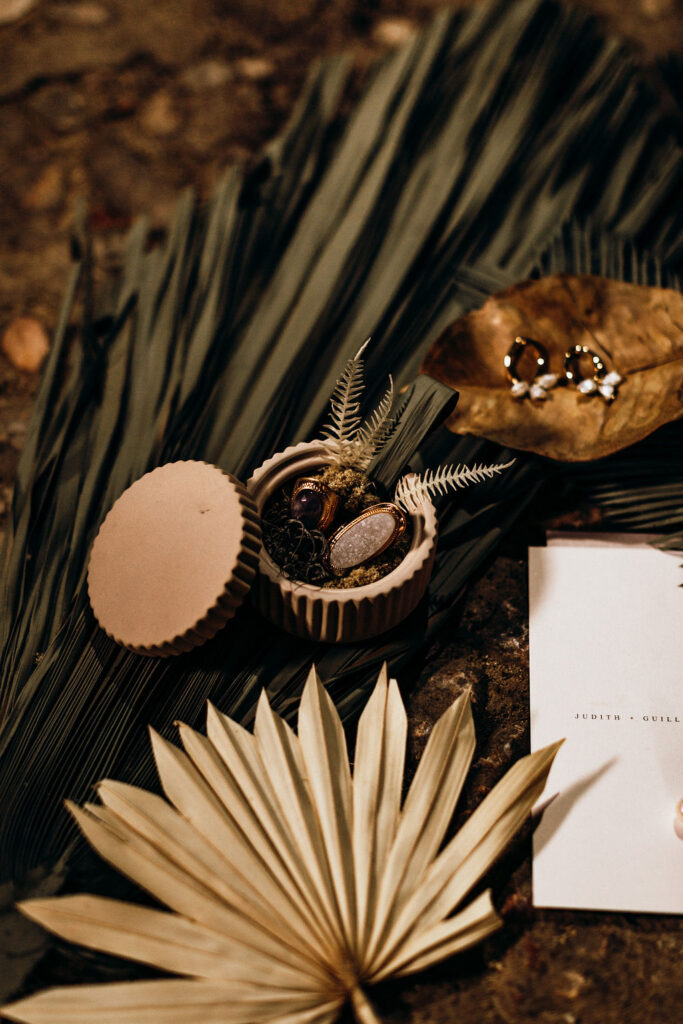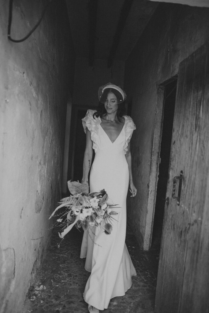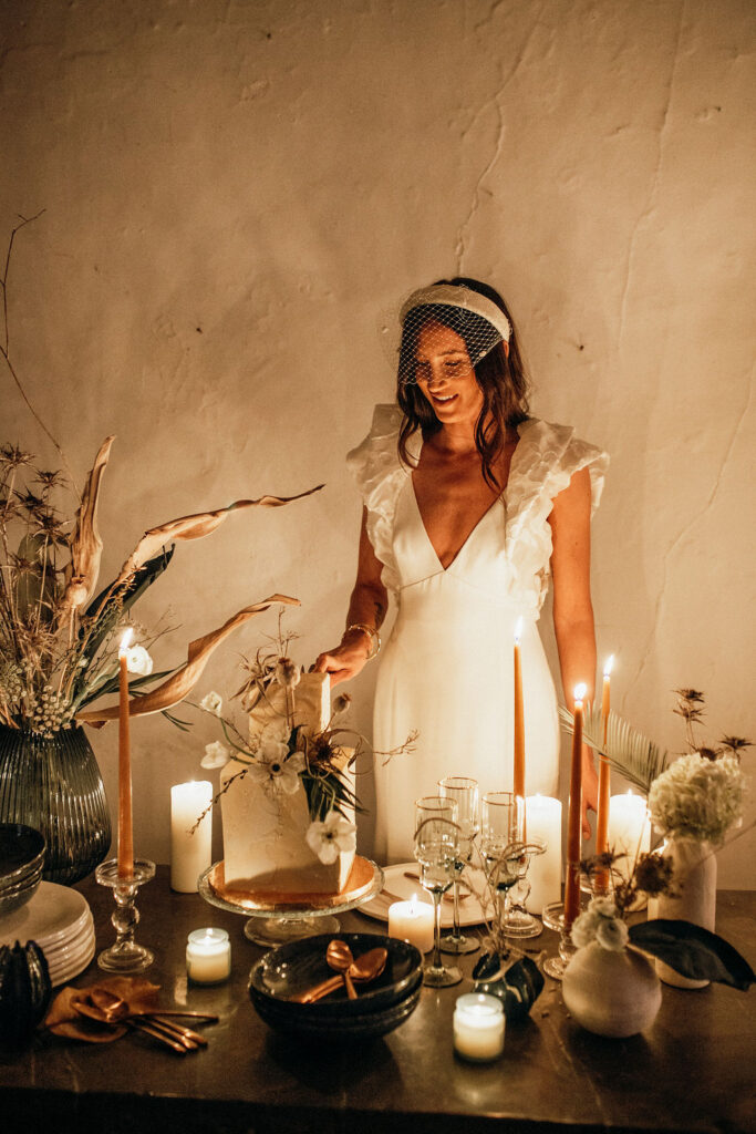 For this occasion we chose a palette of neutral tones between off-white and sand tones that we contrasted with shades of intense green and golden touches to add sophistication. The stone walls in Finca Morneta, the beauty and authenticity of the oldest corners of this property gave us the perfect setting. The contrasting note was to use elements of clean lines both in Jaiak’s tableware, as in the decorative elements or the wedding dress. Everything combined to perfection creating the perfect style. As in all our weddings, light plays an important role, so we created a play of indirect lights, candles and natural light itself filtered by subtle gauze.