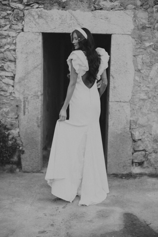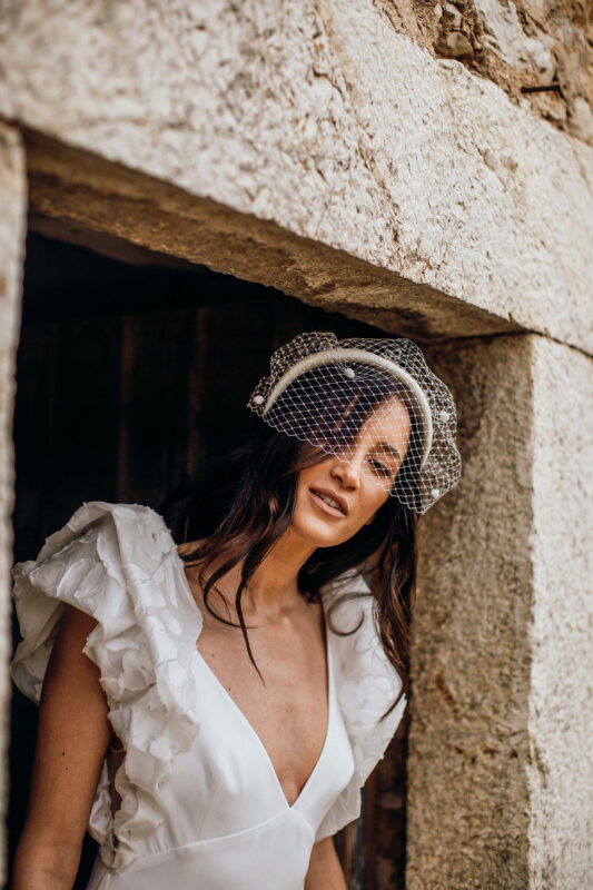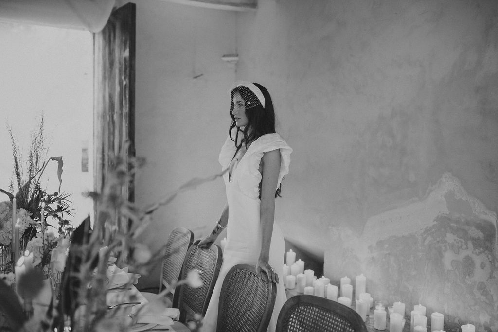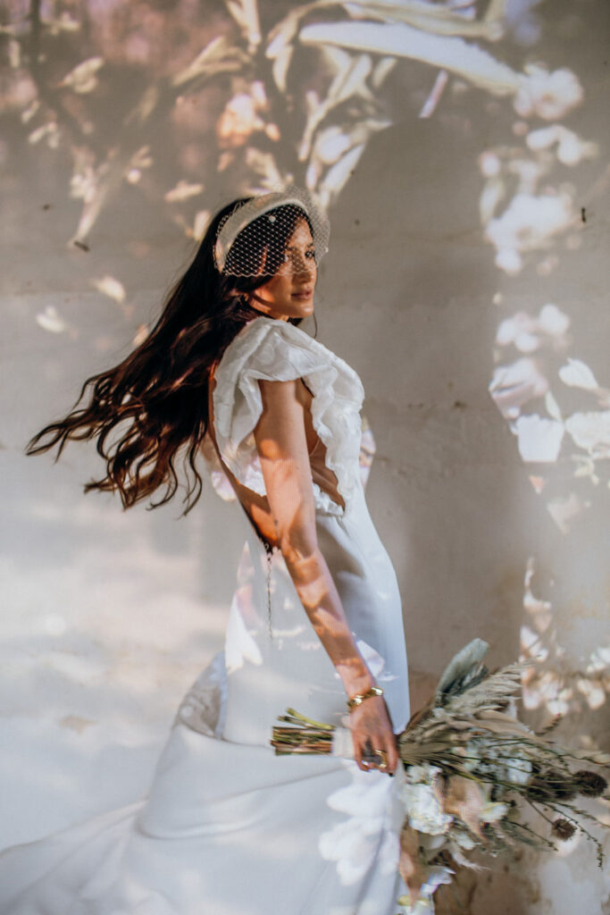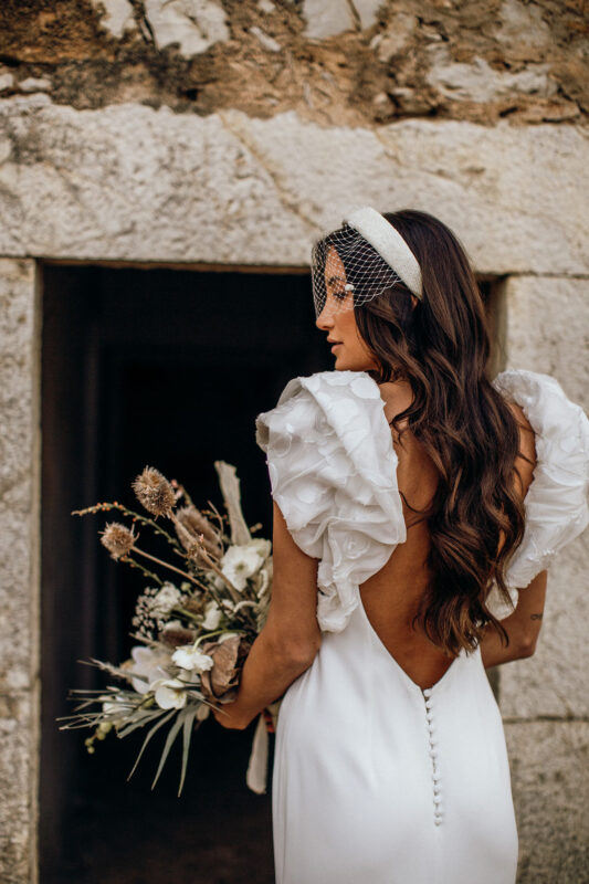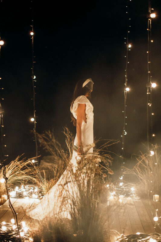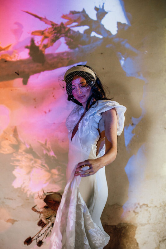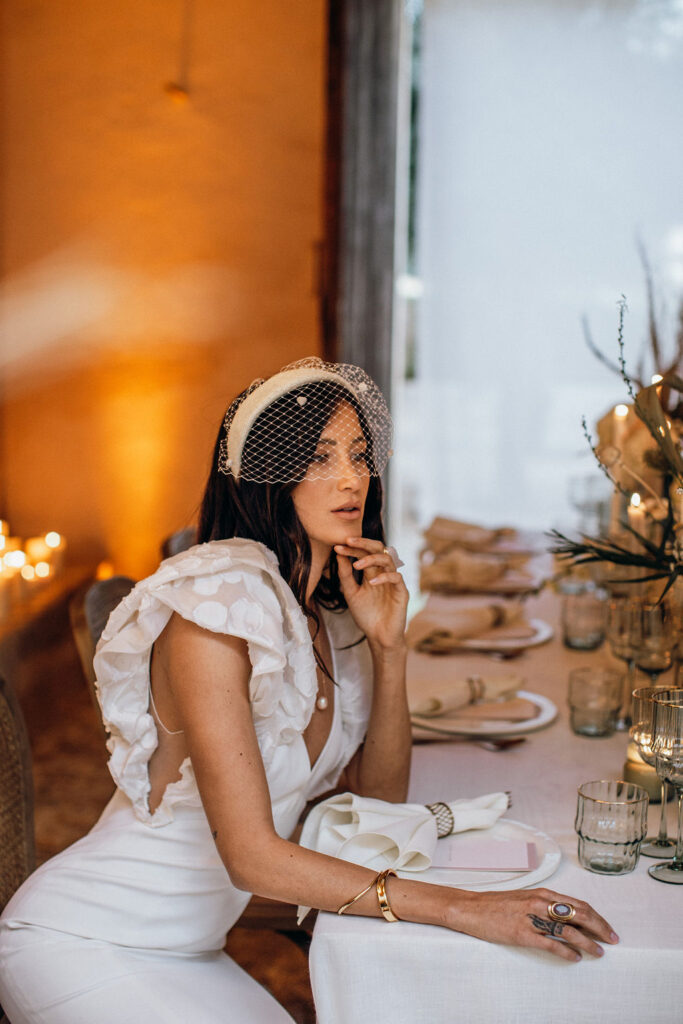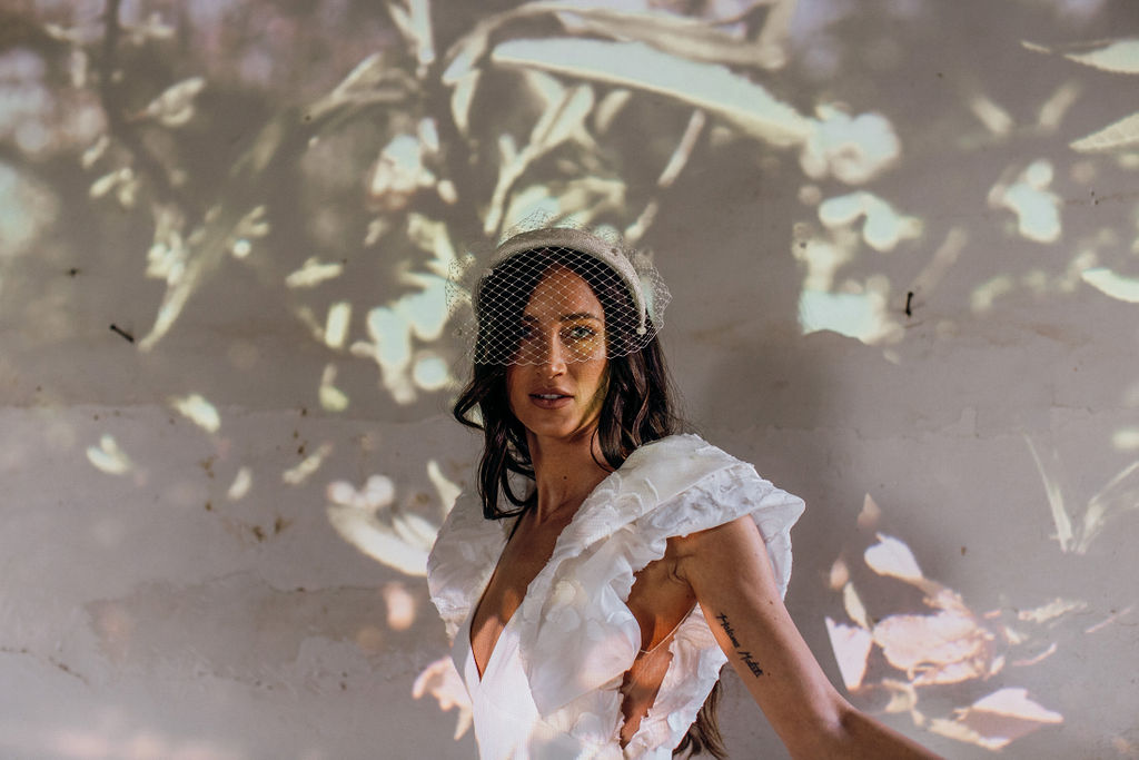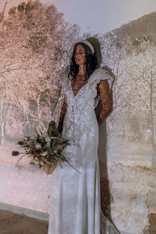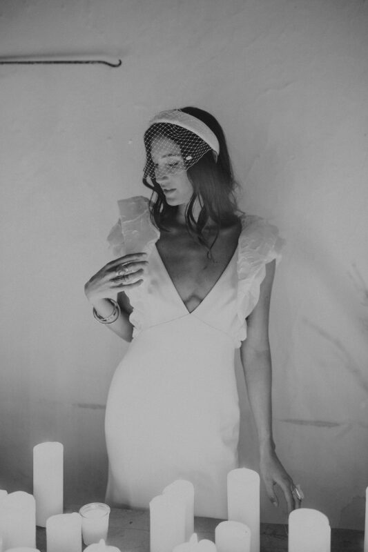 We never leave a loose end, much less with the bride’s styling. We envisioned a young, independent bride, with personality and at the same time elegant. The dress had to have simple lines with a special touch, so we chose a dress by Rime Arodaky for The Muse Collective with volume around the shoulders and a light crepe fabric. With the jewels and the headdress we achieved the unique personality we were looking for. Our stylist Rebecca Spendlove created a simple hairstyle with perfect waves and subtle makeup that highlighted the natural beauty of model Aileen Gold’s eyes.