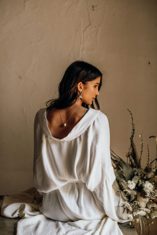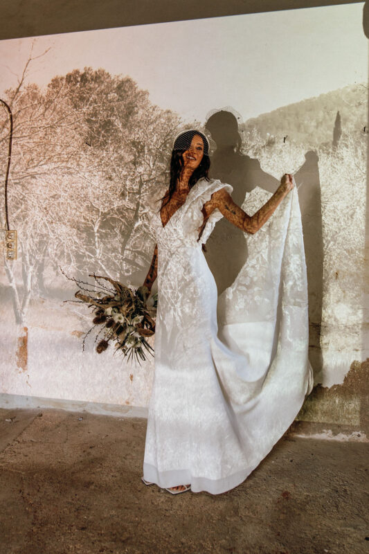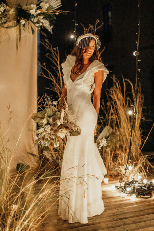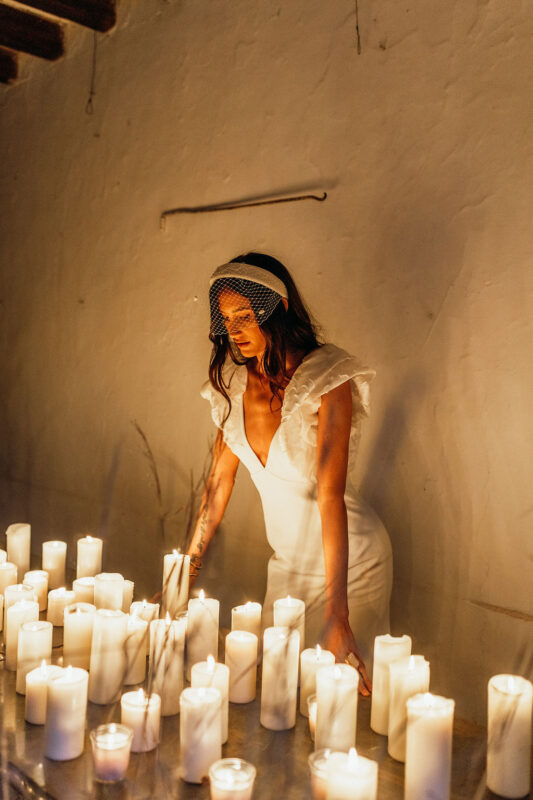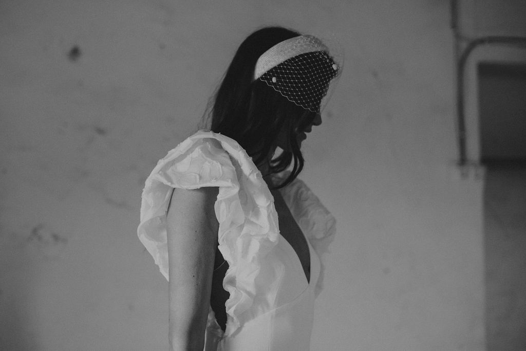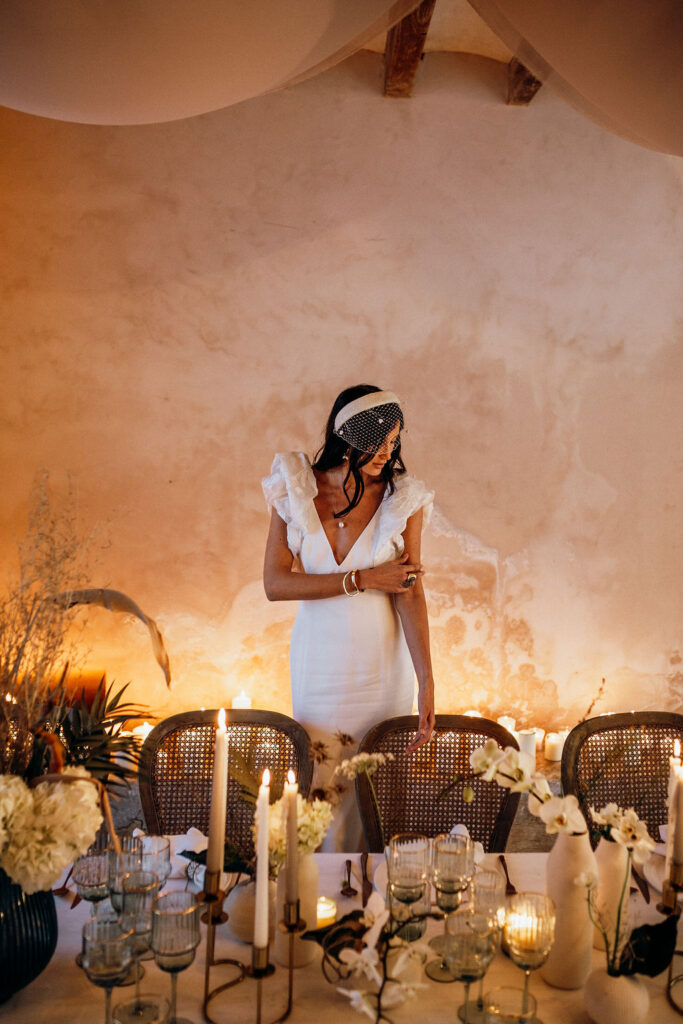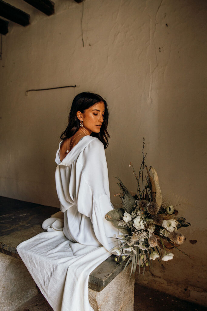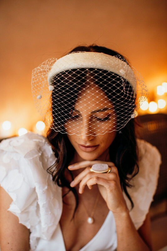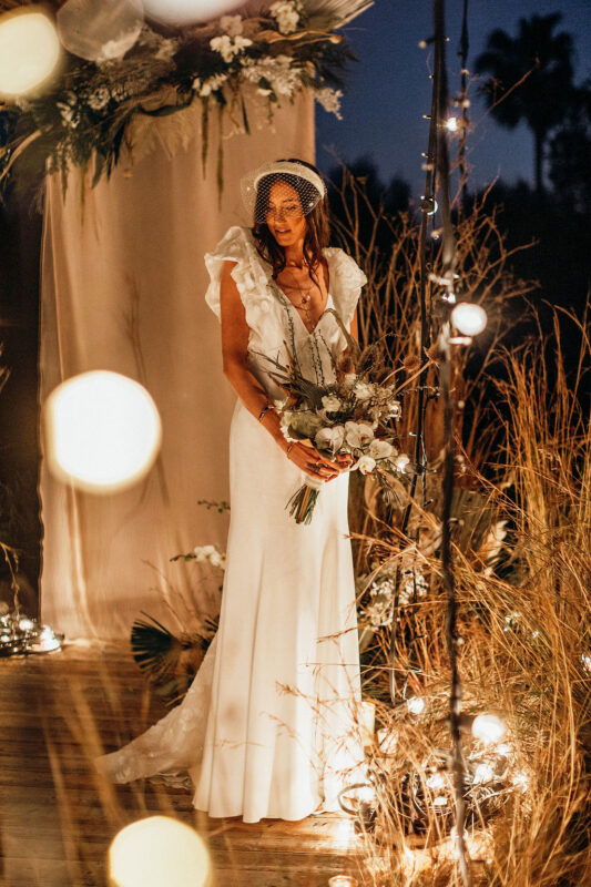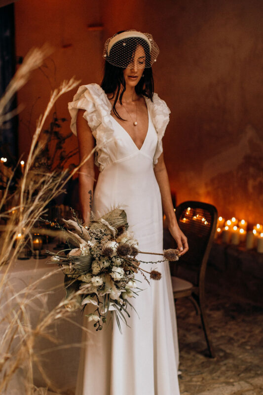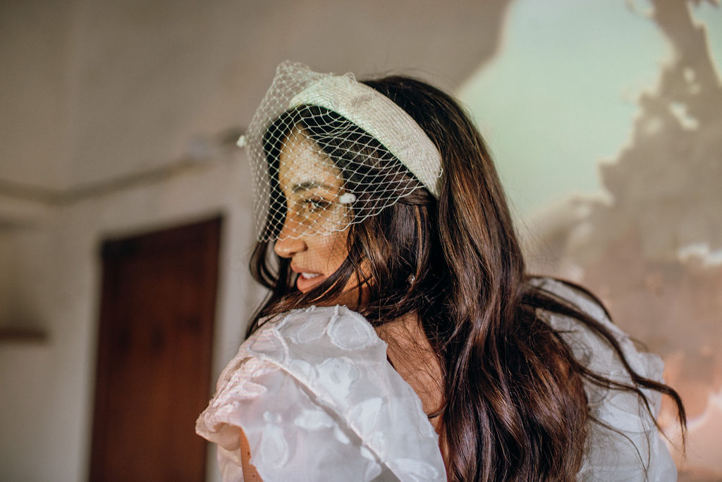 We never leave a loose end, much less with the bride’s styling. We envisioned a young, independent bride, with personality and at the same time elegant. The dress had to have simple lines with a special touch, so we chose a dress by Rime Arodaky for The Muse Collective with volume around the shoulders and a light crepe fabric. With the jewels and the headdress we achieved the unique personality we were looking for. Our stylist Rebecca Spendlove created a simple hairstyle with perfect waves and subtle makeup that highlighted the natural beauty of model Aileen Gold’s eyes.