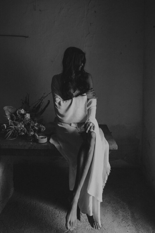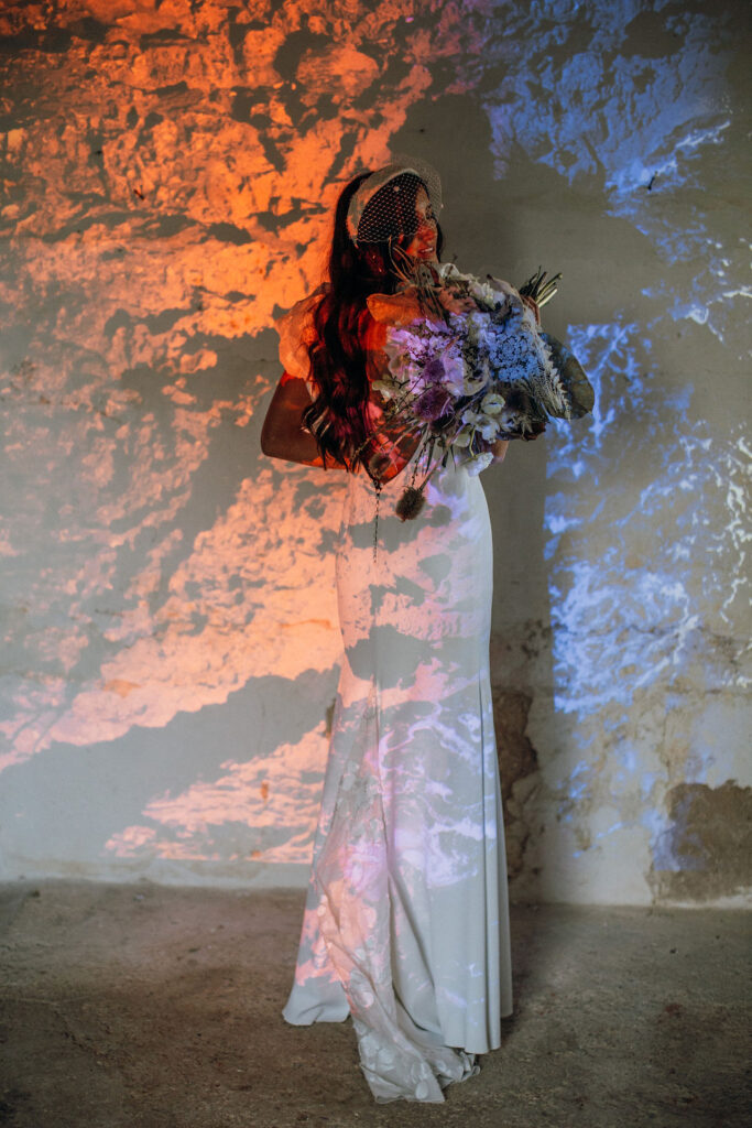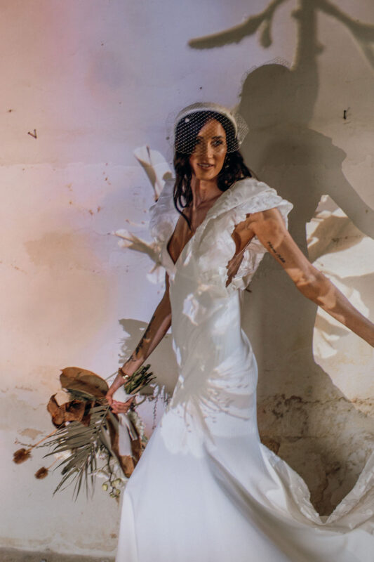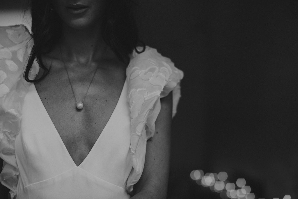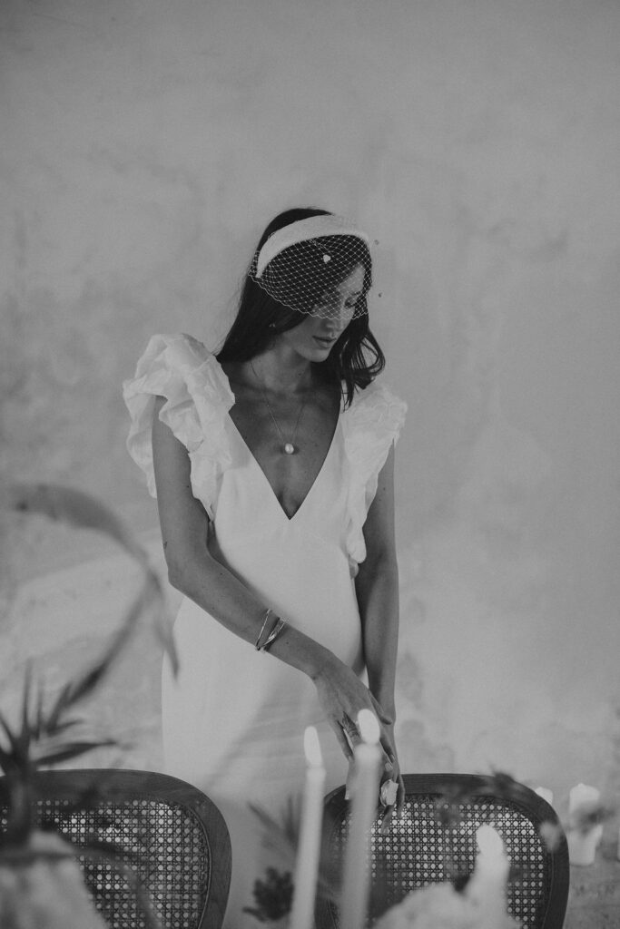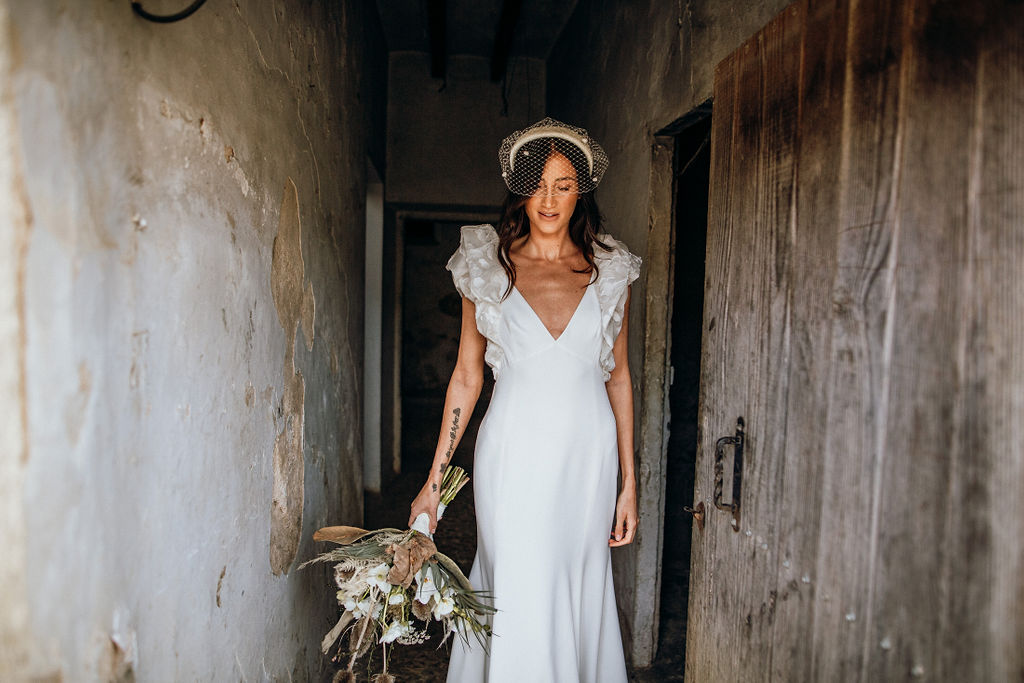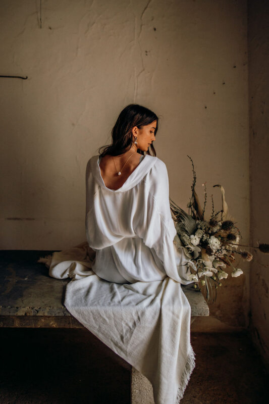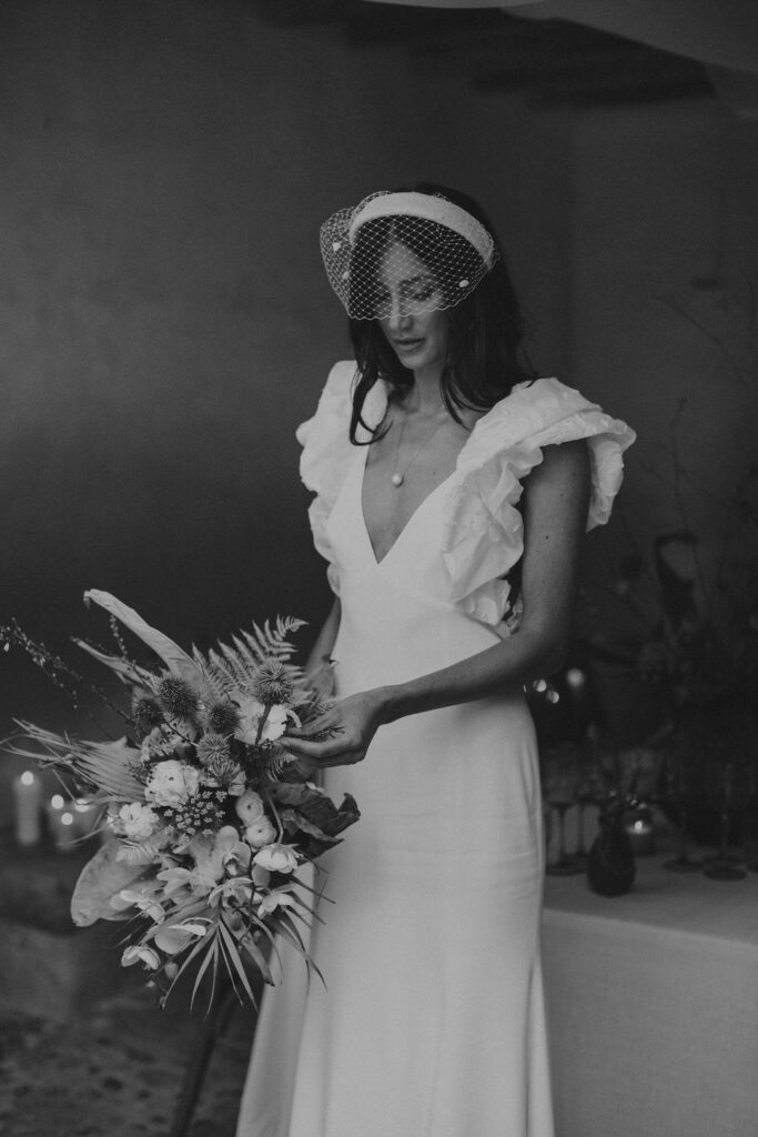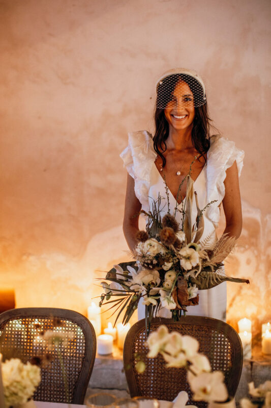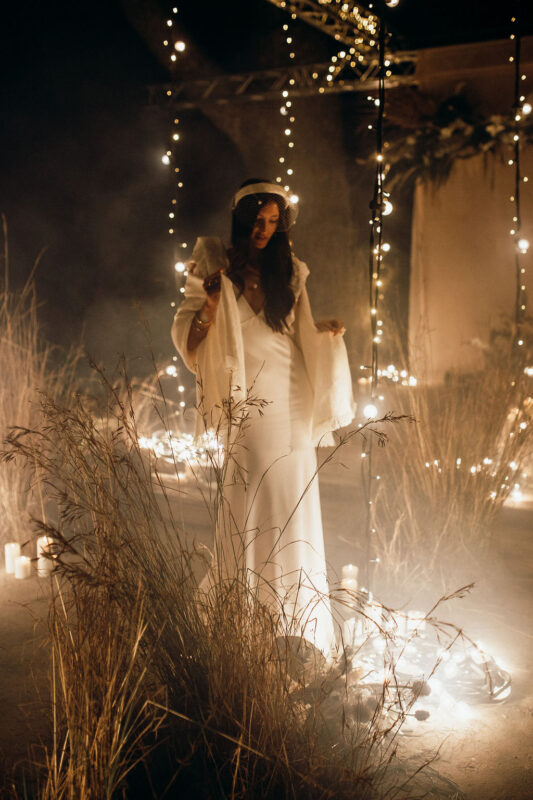 We never leave a loose end, much less with the bride’s styling. We envisioned a young, independent bride, with personality and at the same time elegant. The dress had to have simple lines with a special touch, so we chose a dress by Rime Arodaky for The Muse Collective with volume around the shoulders and a light crepe fabric. With the jewels and the headdress we achieved the unique personality we were looking for. Our stylist Rebecca Spendlove created a simple hairstyle with perfect waves and subtle makeup that highlighted the natural beauty of model Aileen Gold’s eyes.