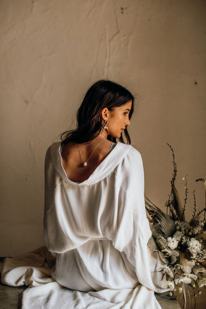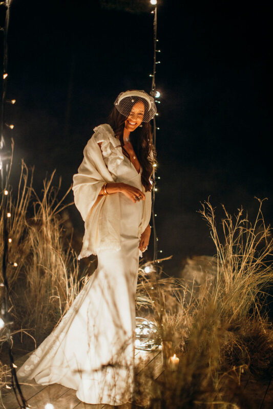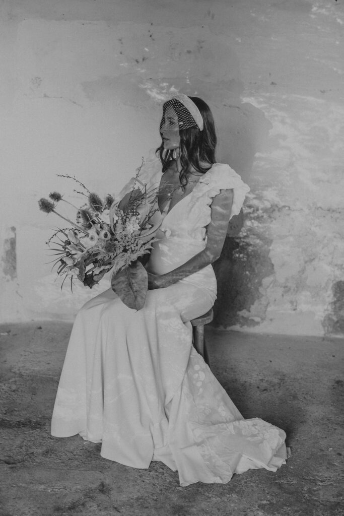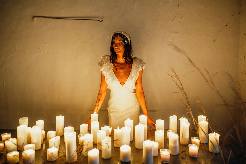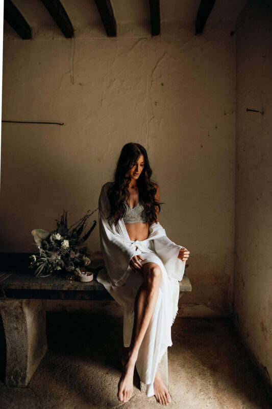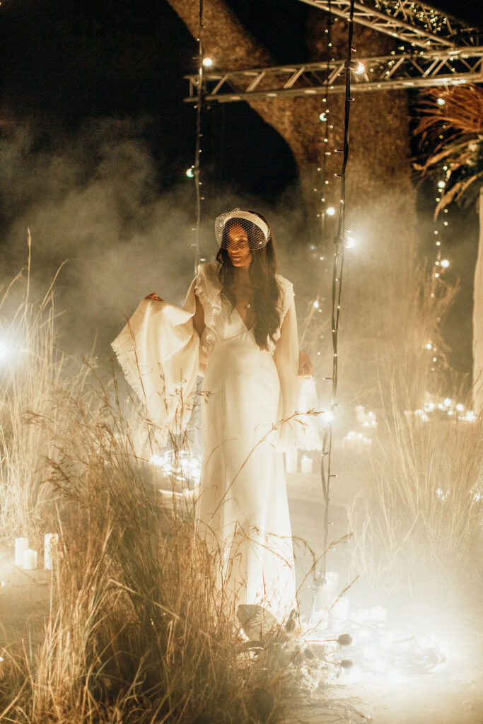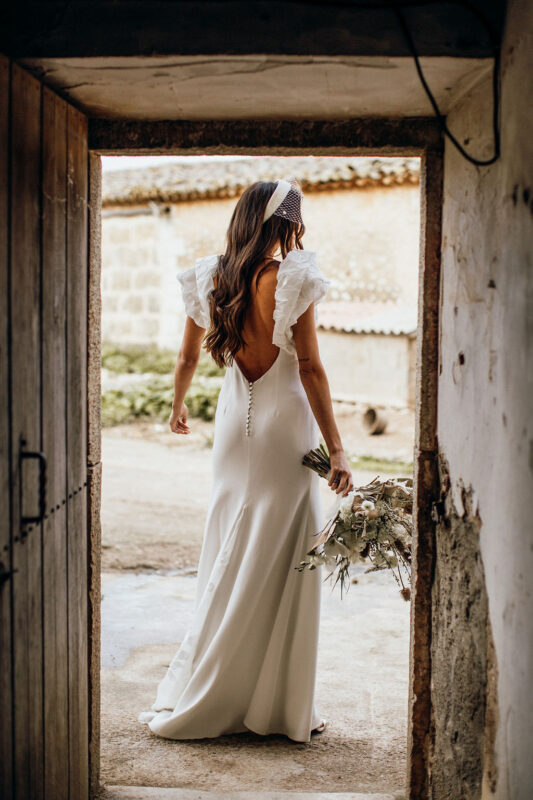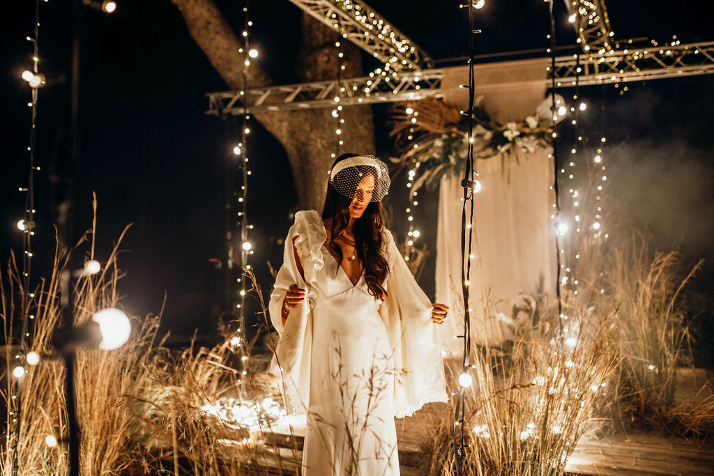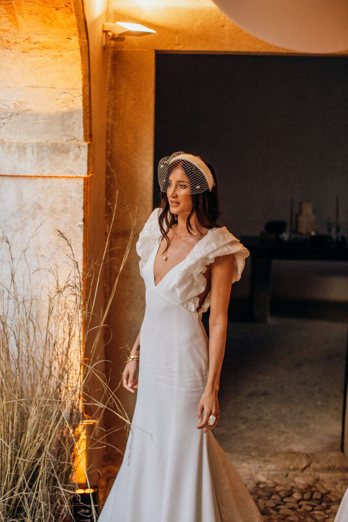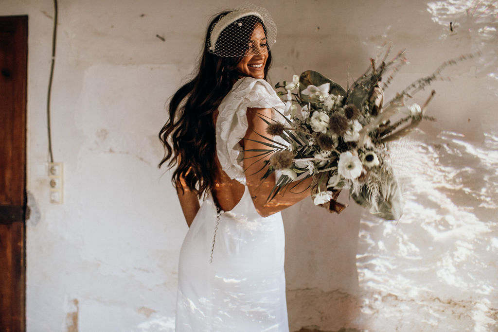 We never leave a loose end, much less with the bride’s styling. We envisioned a young, independent bride, with personality and at the same time elegant. The dress had to have simple lines with a special touch, so we chose a dress by Rime Arodaky for The Muse Collective with volume around the shoulders and a light crepe fabric. With the jewels and the headdress we achieved the unique personality we were looking for. Our stylist Rebecca Spendlove created a simple hairstyle with perfect waves and subtle makeup that highlighted the natural beauty of model Aileen Gold’s eyes.