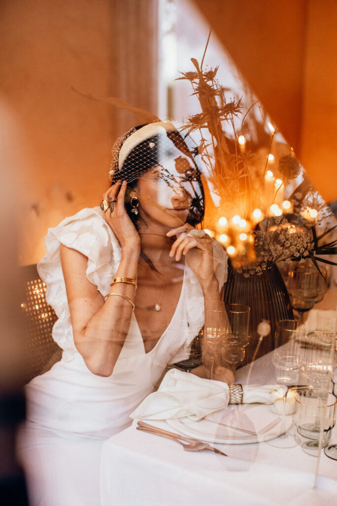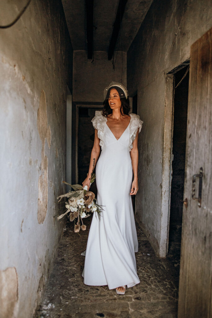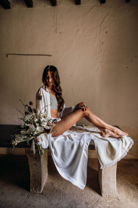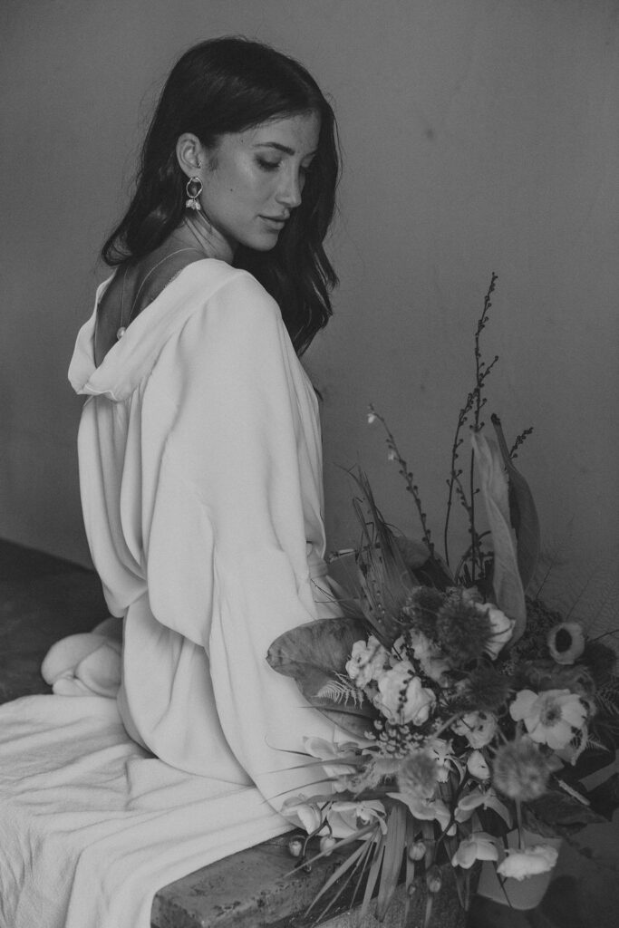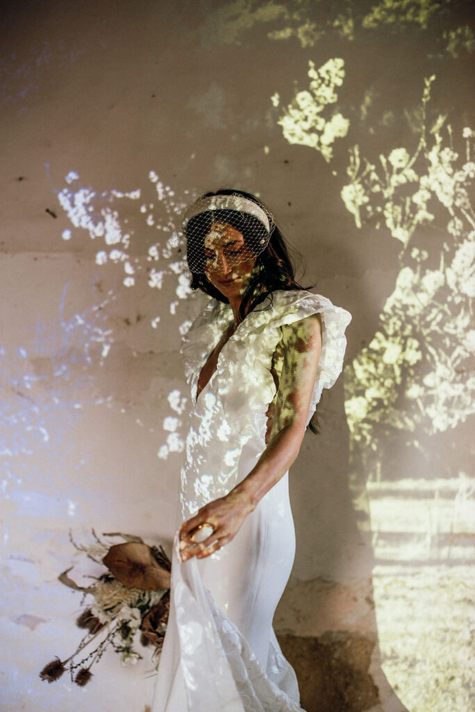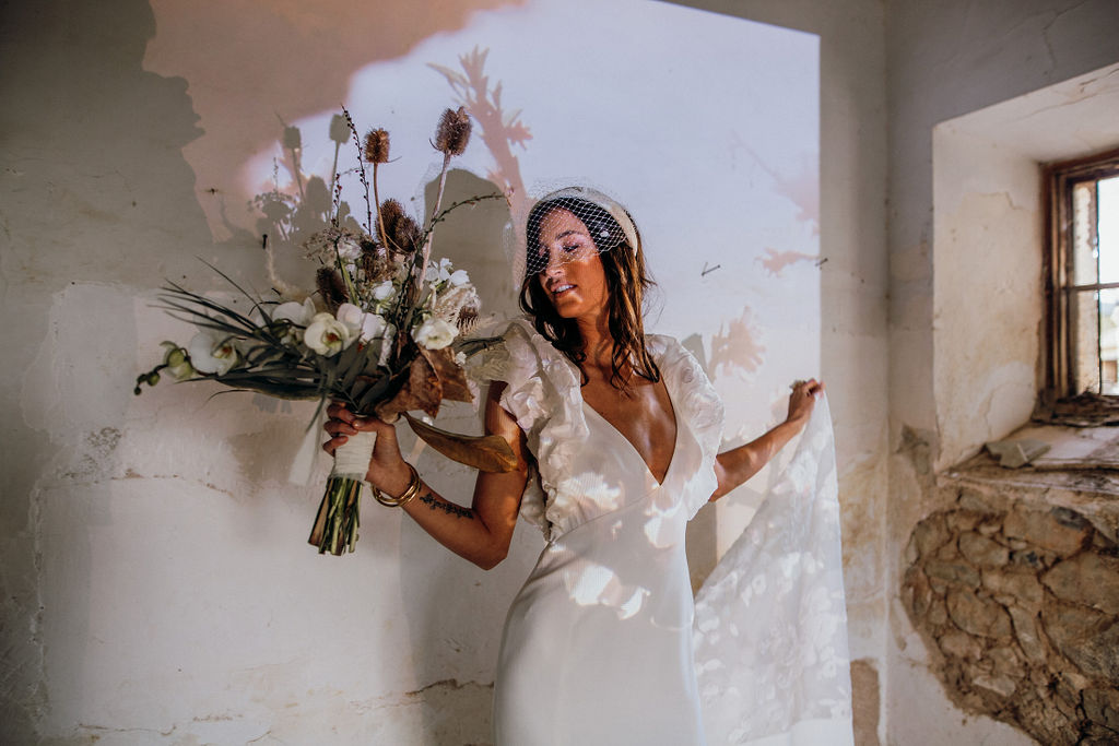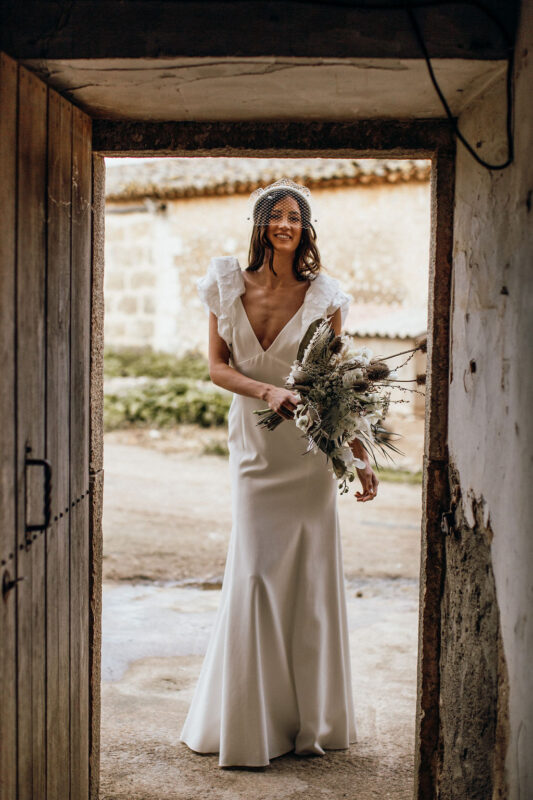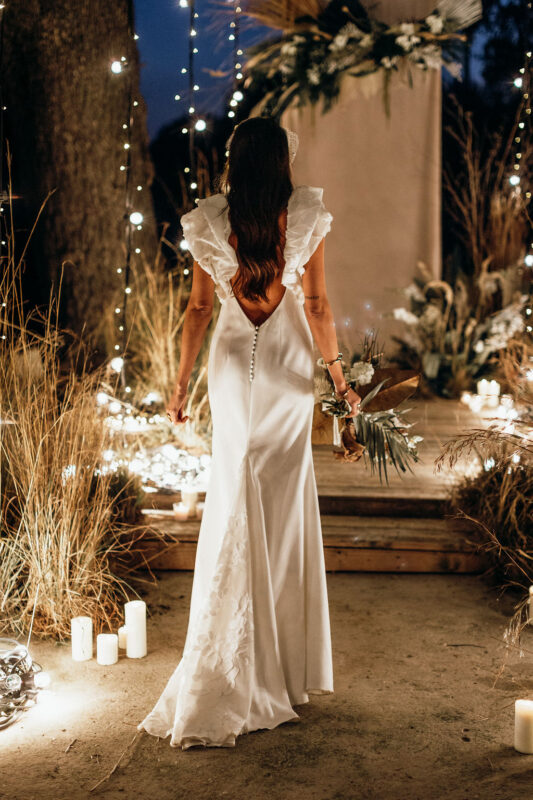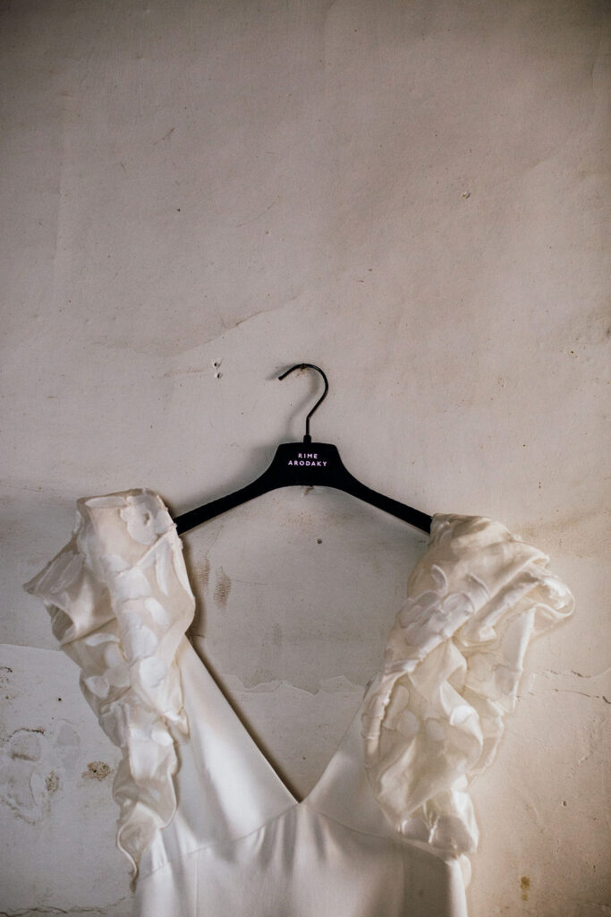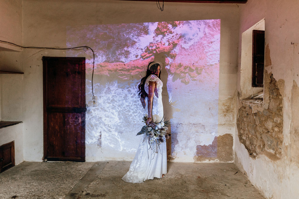We never leave a loose end, much less with the bride’s styling. We envisioned a young, independent bride, with personality and at the same time elegant. The dress had to have simple lines with a special touch, so we chose a dress by Rime Arodaky for The Muse Collective with volume around the shoulders and a light crepe fabric. With the jewels and the headdress we achieved the unique personality we were looking for. Our stylist Rebecca Spendlove created a simple hairstyle with perfect waves and subtle makeup that highlighted the natural beauty of model Aileen Gold’s eyes.