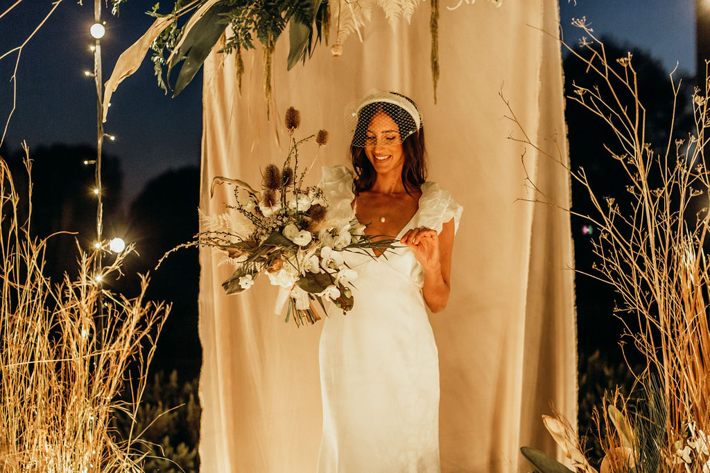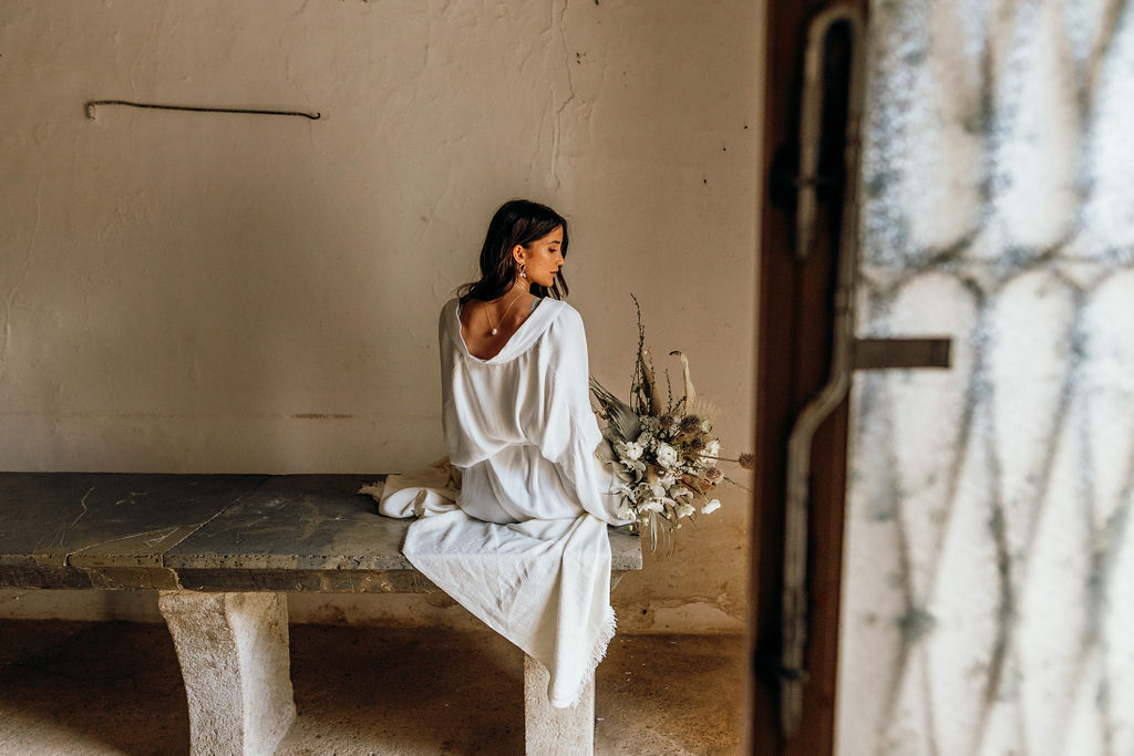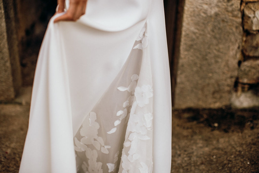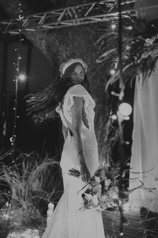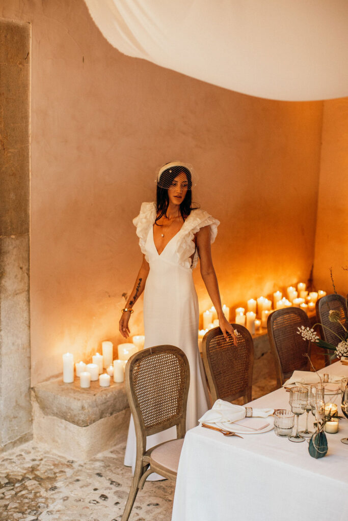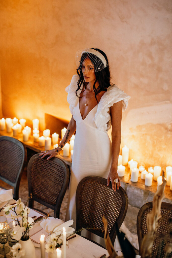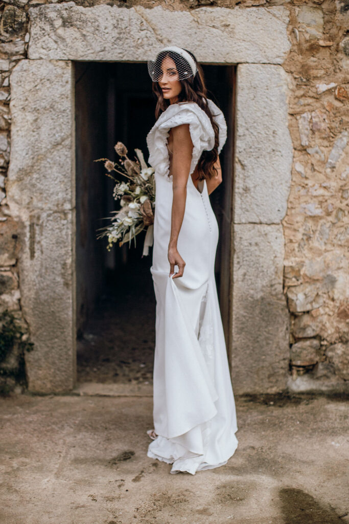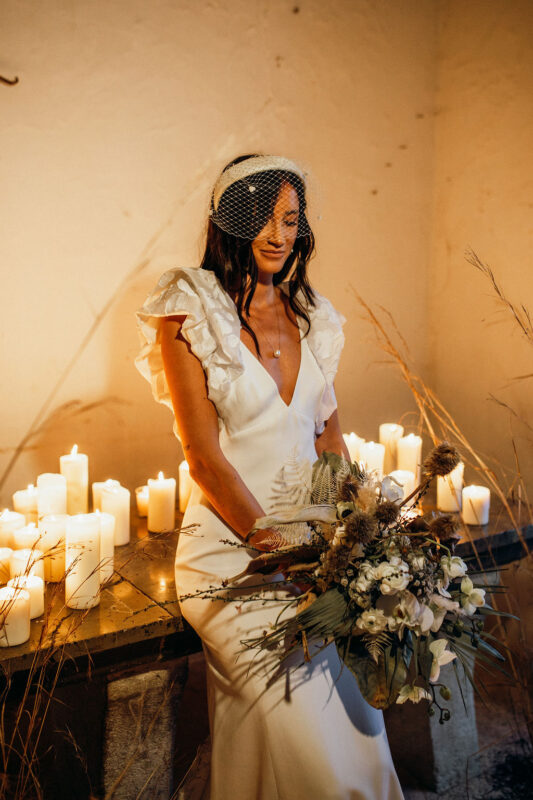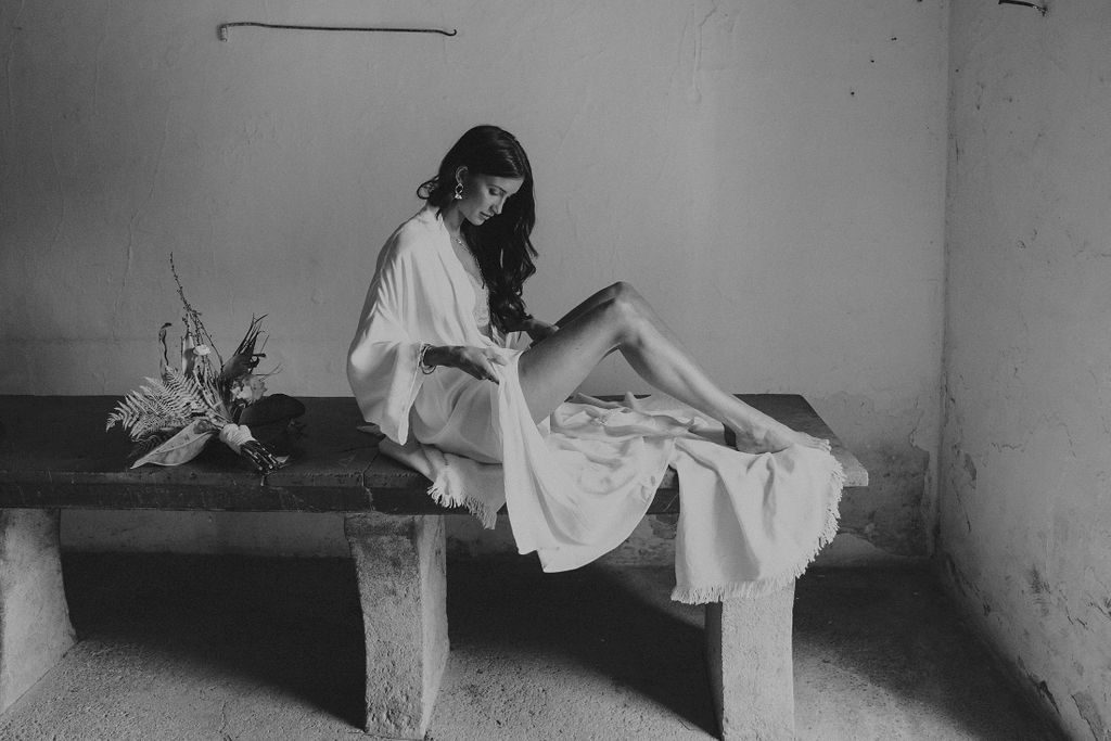 We never leave a loose end, much less with the bride’s styling. We envisioned a young, independent bride, with personality and at the same time elegant. The dress had to have simple lines with a special touch, so we chose a dress by Rime Arodaky for The Muse Collective with volume around the shoulders and a light crepe fabric. With the jewels and the headdress we achieved the unique personality we were looking for. Our stylist Rebecca Spendlove created a simple hairstyle with perfect waves and subtle makeup that highlighted the natural beauty of model Aileen Gold’s eyes.