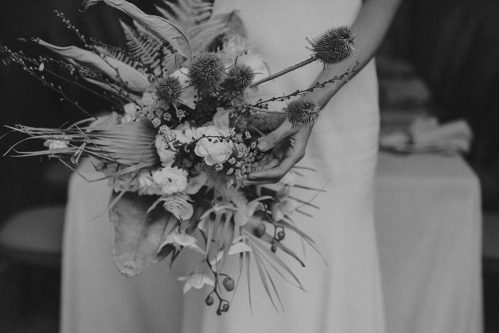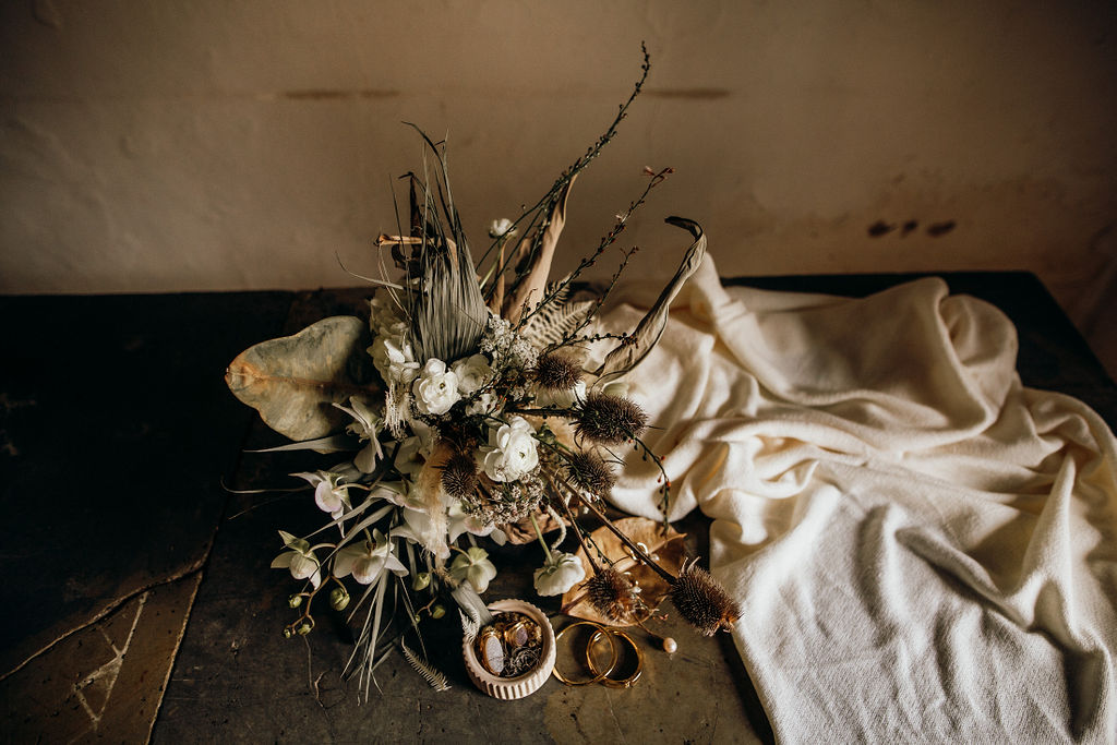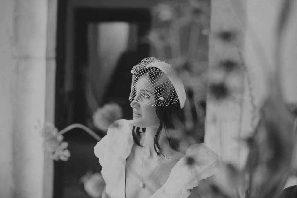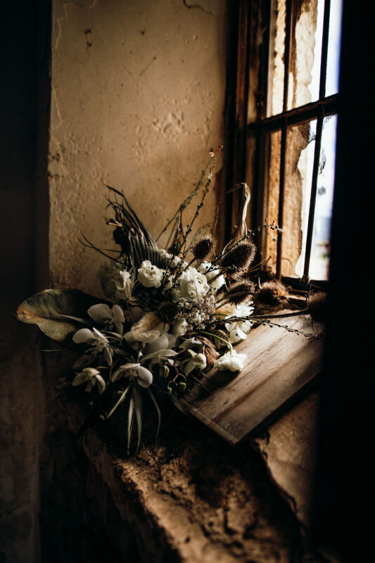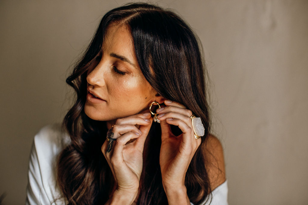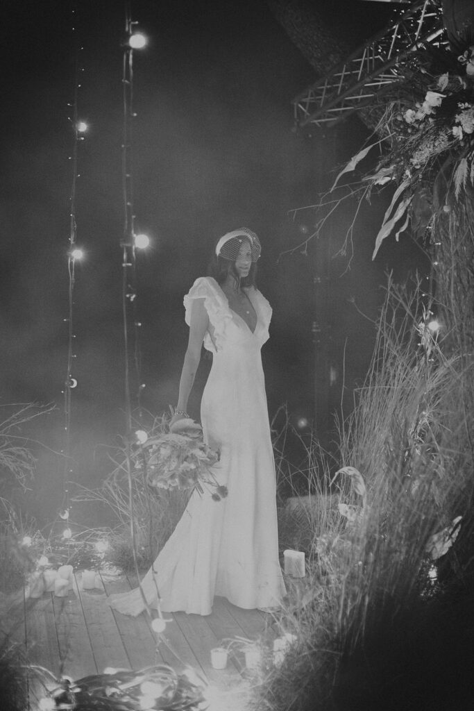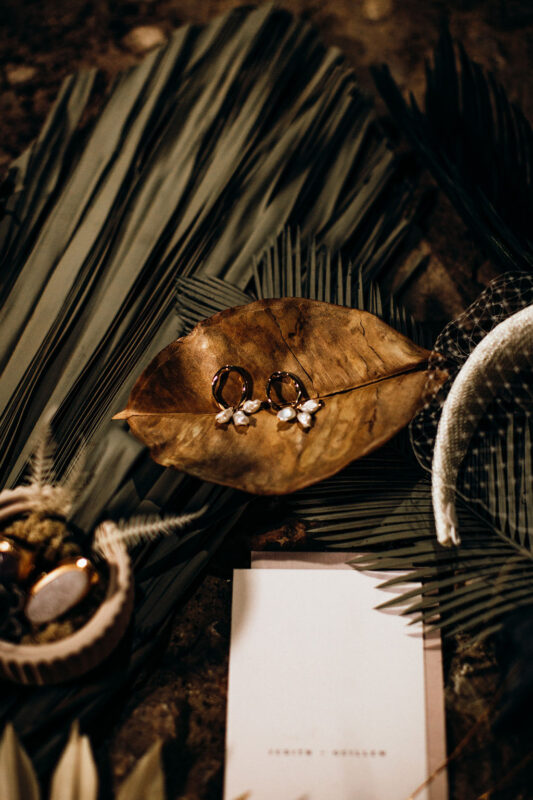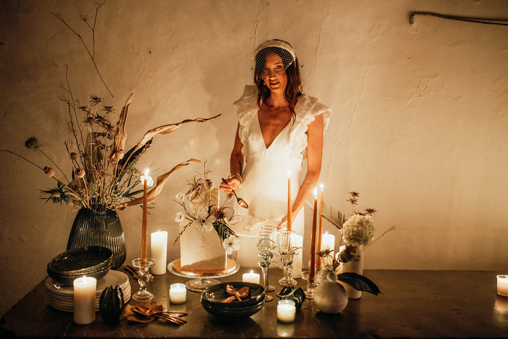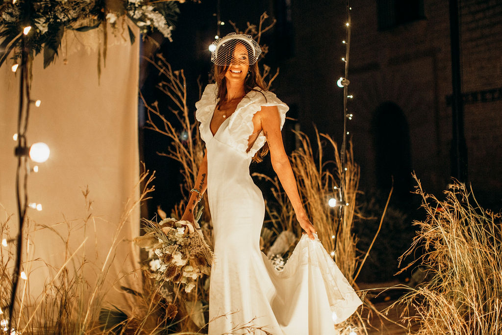 We never leave a loose end, much less with the bride’s styling. We envisioned a young, independent bride, with personality and at the same time elegant. The dress had to have simple lines with a special touch, so we chose a dress by Rime Arodaky for The Muse Collective with volume around the shoulders and a light crepe fabric. With the jewels and the headdress we achieved the unique personality we were looking for. Our stylist Rebecca Spendlove created a simple hairstyle with perfect waves and subtle makeup that highlighted the natural beauty of model Aileen Gold’s eyes.