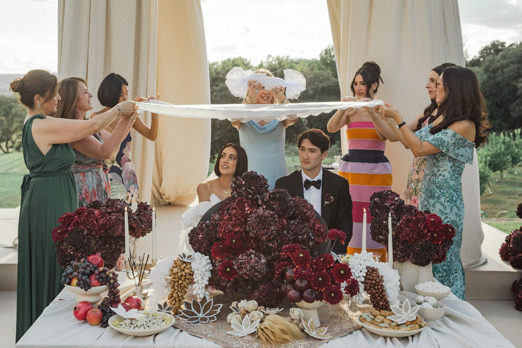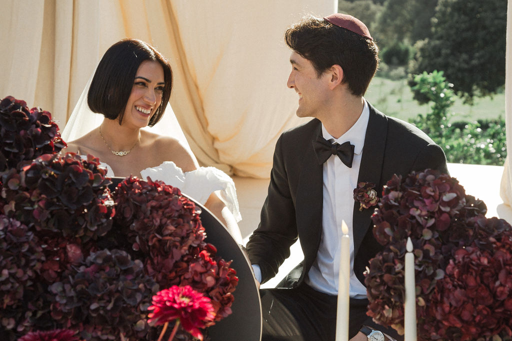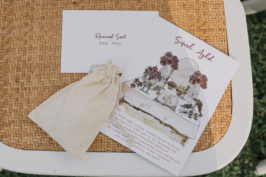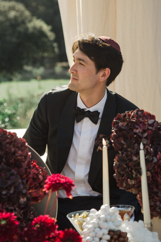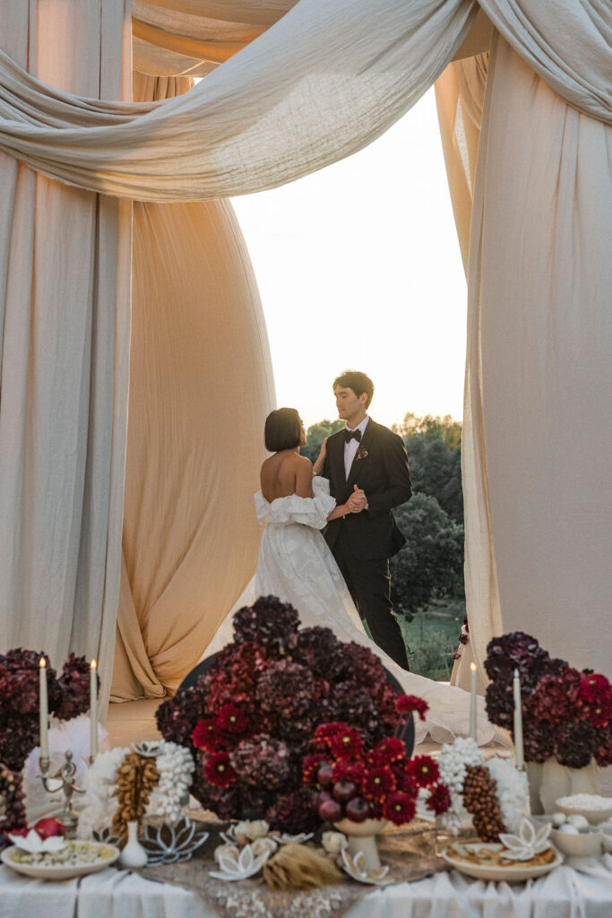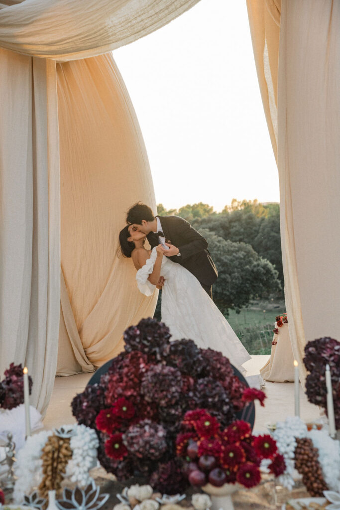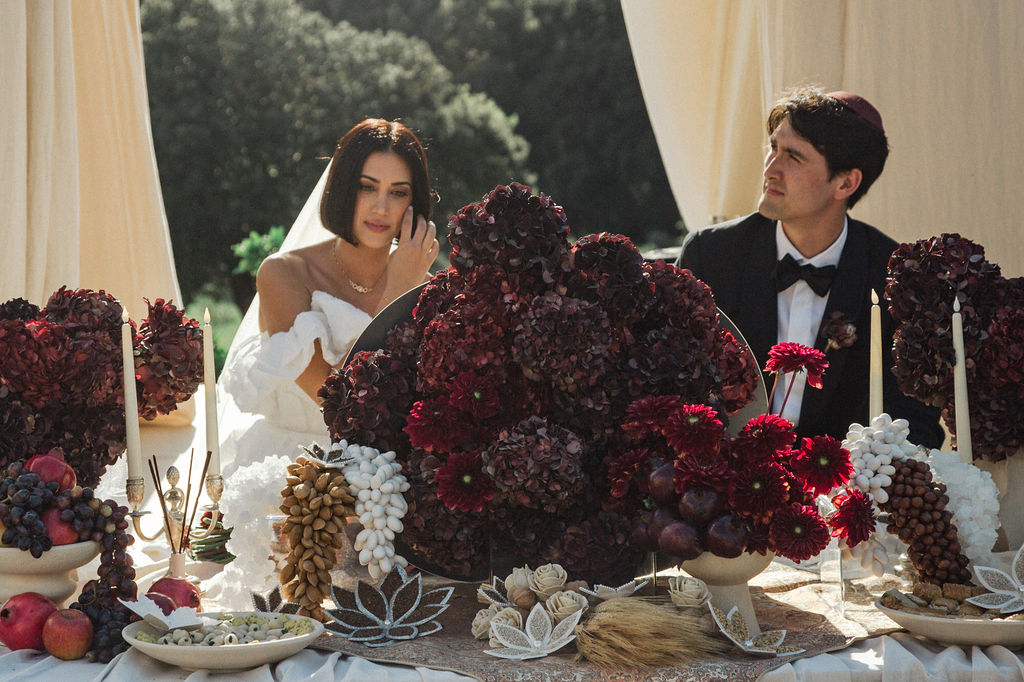 Their ceremony seamlessly blended Persian, Jewish, and Korean traditions, brought together under a symbolic houppah and a thoughtfully designed Sofreh table. The aesthetic direction was anchored in a powerful yet timeless palette of deep garnet red and pure beige, creating a striking contrast that felt intentional, warm, and deeply elegant.